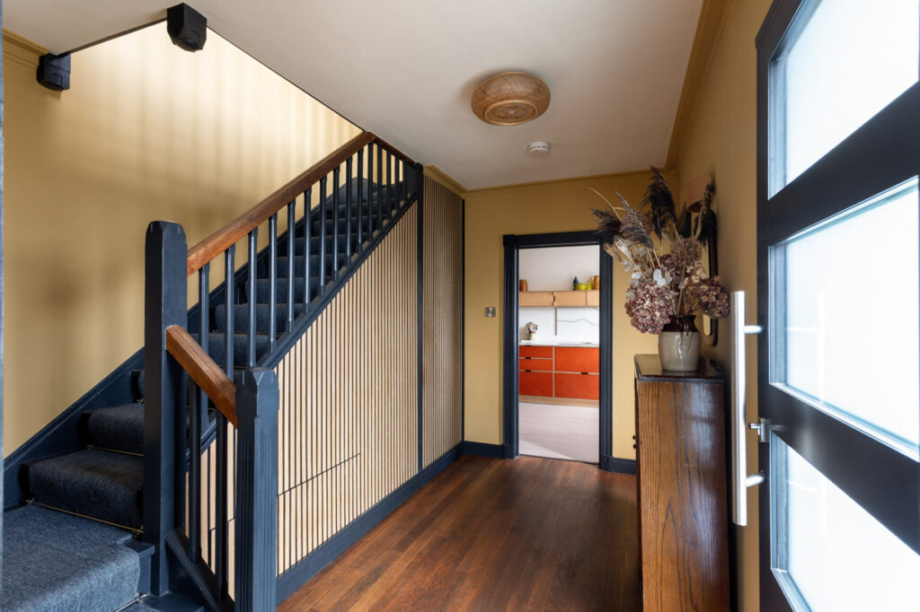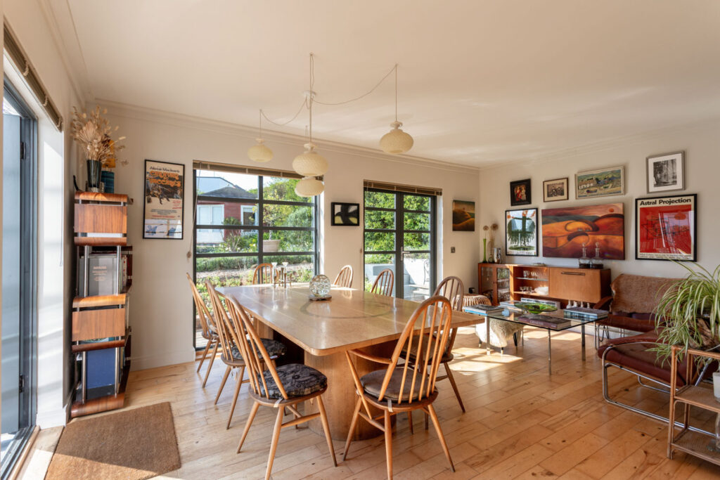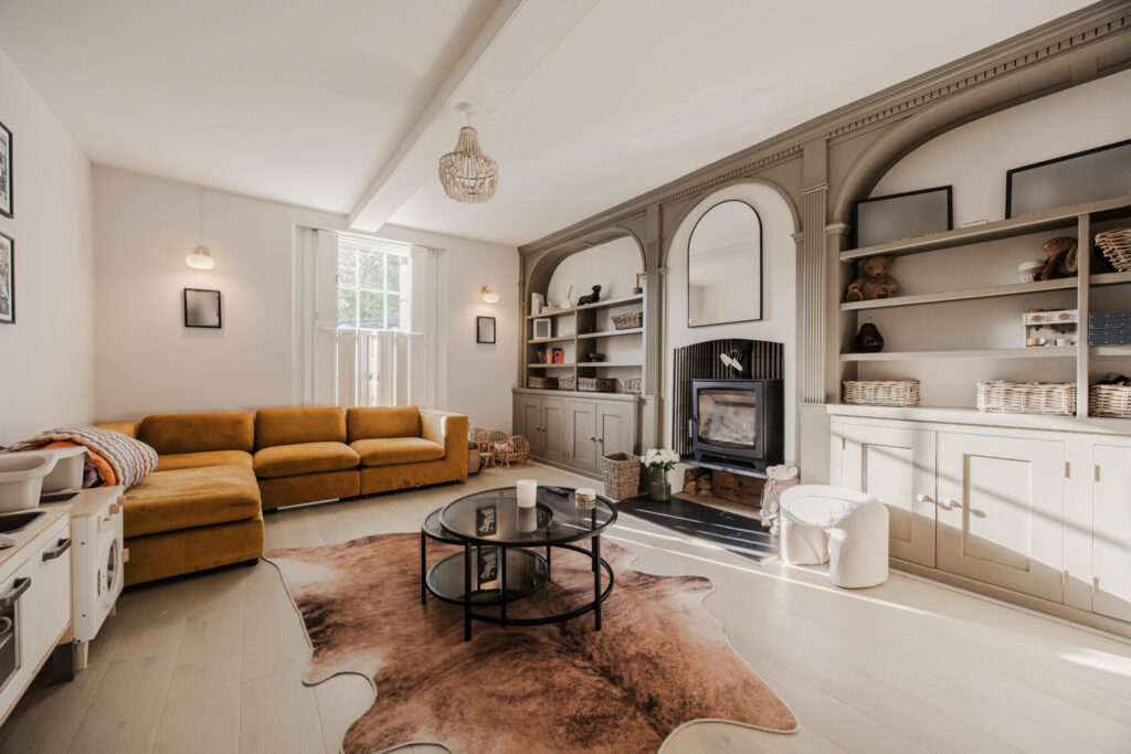 Every room in this immaculately-restored Georgian-Victorian home is styled to an almost editorial standard. The black and white marble tiled hallway in the entrance hall nods to the home’s heritage, while herringbone wood floors, a beautifully handcrafted kitchen, slim-framed sliding doors onto the garden, and statement furnishings give the home a contemporary edge.