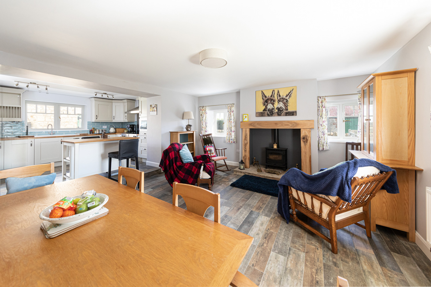 The heart of the home is the lovely open plan kitchen, dining room and family room. The kitchen is fitted with a fine range of modern cabinetry and appliances including a range cooker with 5-ring induction hob, integrated dishwasher, fridge freezer and combi-oven. The open plan flows to the dining and family area, with ample space for a large table and chairs and a comfortable seating area with a multi-fuel stove on one side. The kitchen is further served by a utility room with space for a washing machine and dryer.