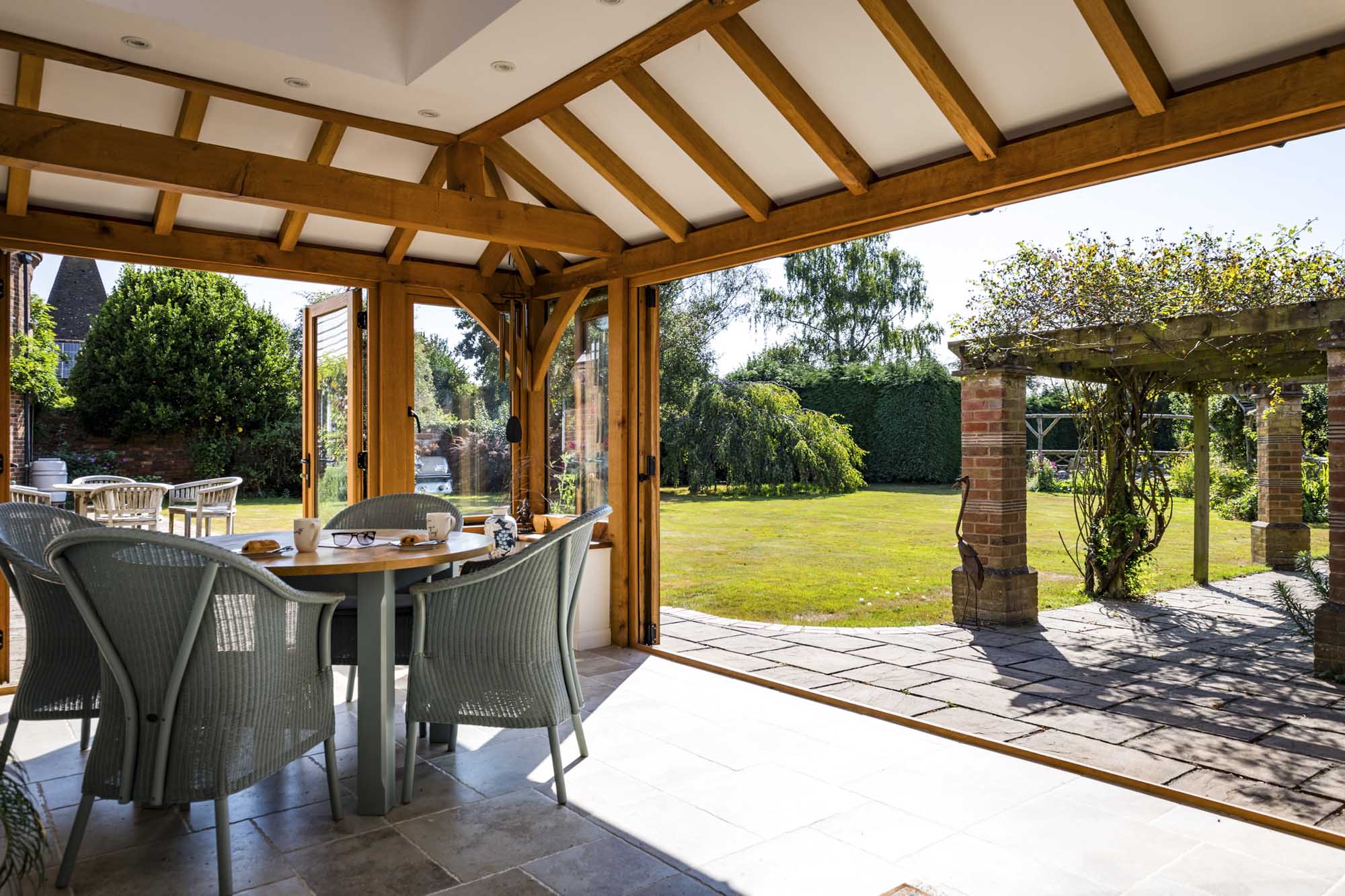 The formal dining room offers a more intimate setting for meals, while the adjoining open-plan kitchen and living space is the heart of the home. In 2013, the kitchen was extended to include a stunning garden room/orangery by David Salisbury. This space is designed for year-round comfort, featuring underfloor heating and UV glazing, and it opens out onto the garden with bifold doors that create an ideal space for entertaining. Completing the ground floor is a practical utility room with side access, a larder, and a guest WC with additional storage.