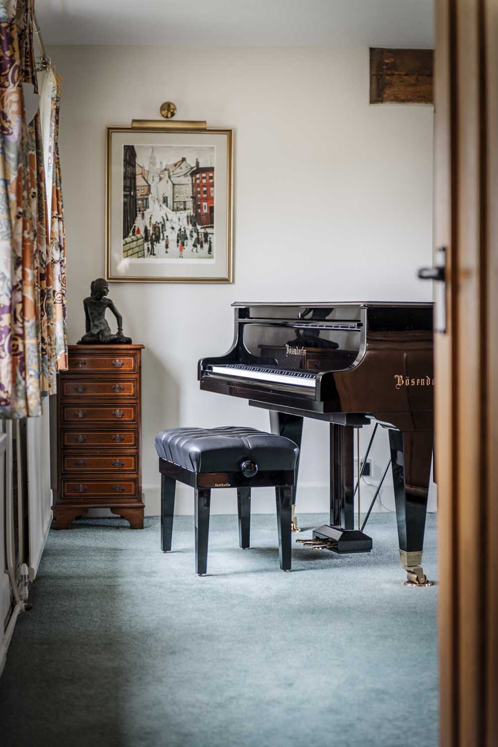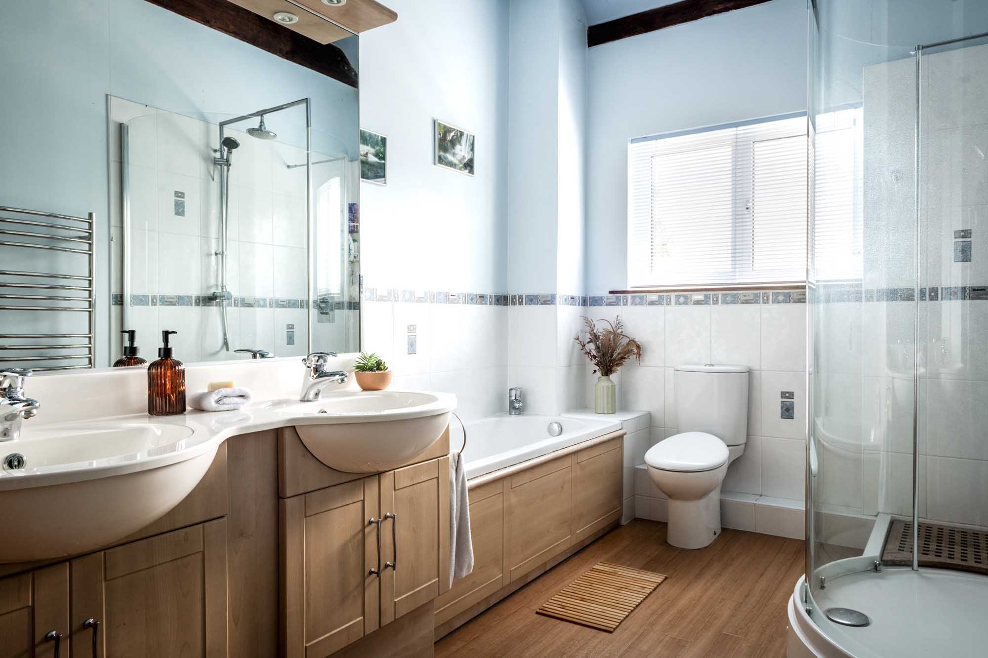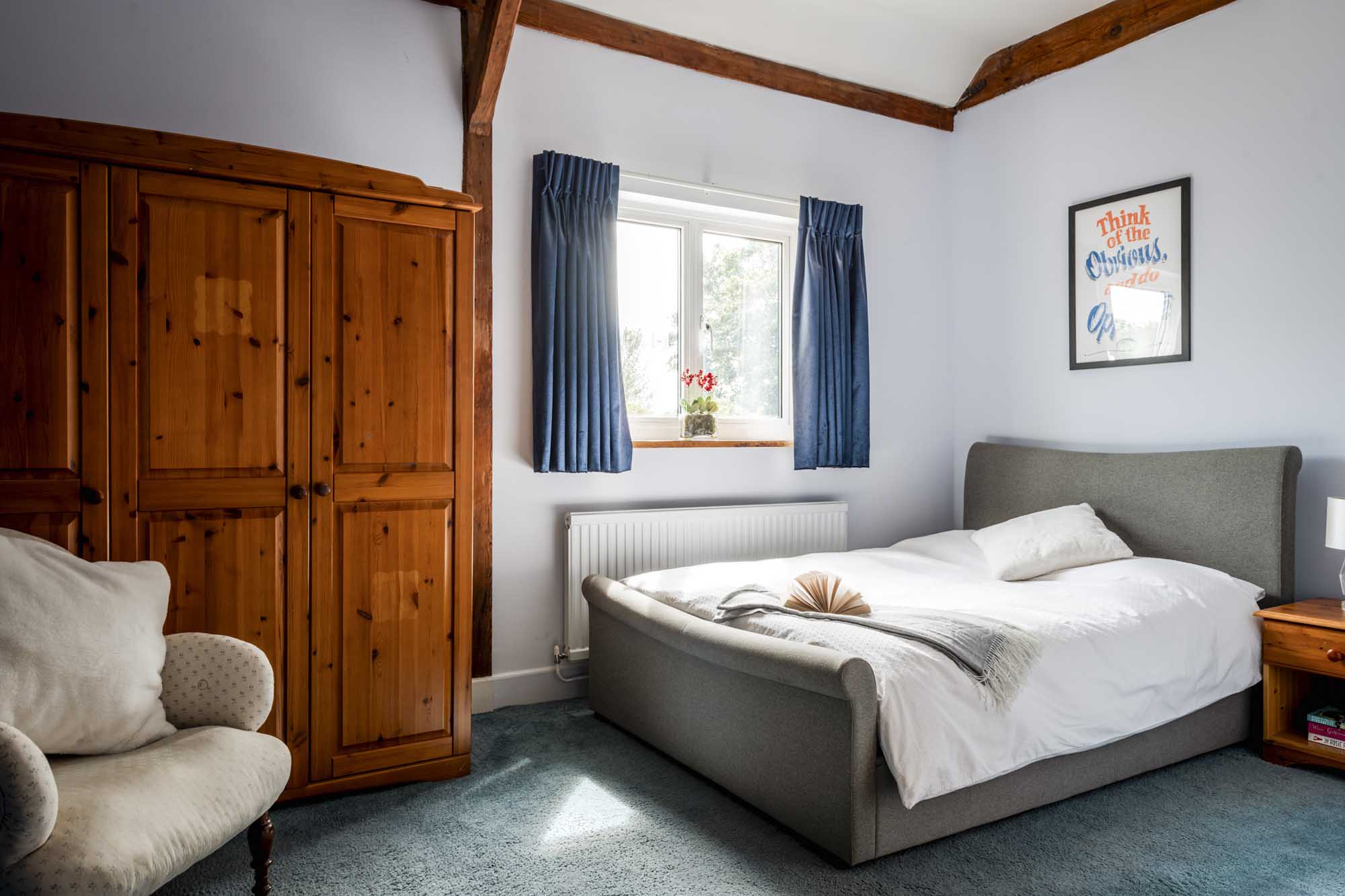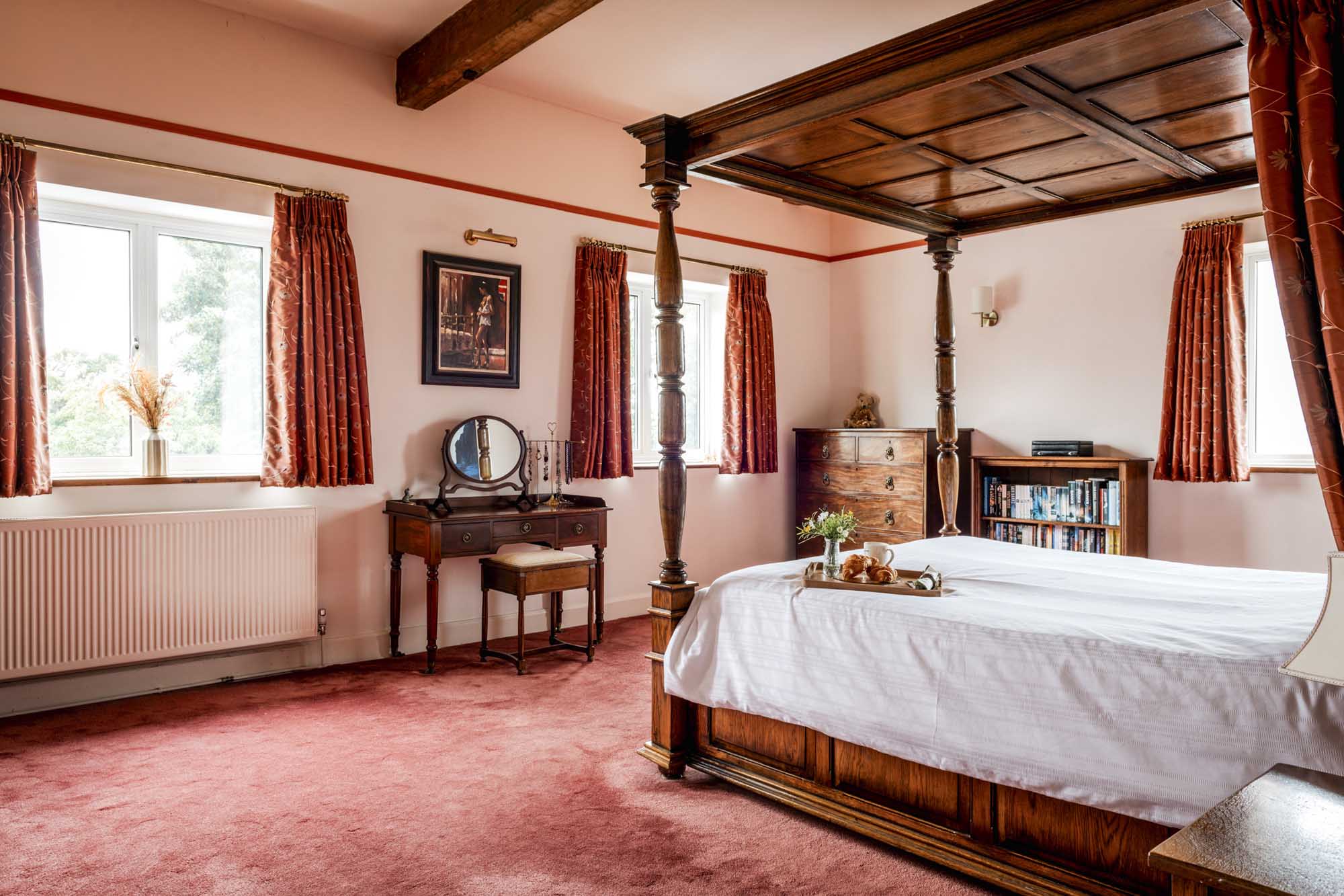 Upstairs, the light-filled landing highlights the home’s generous proportions. The principal suite, situated at the western end, offers a large bedroom with dual-aspect views over the garden and an en-suite bathroom that enjoys peaceful countryside views. A second spacious bedroom, currently used as a family room, also benefits from south-facing garden views.