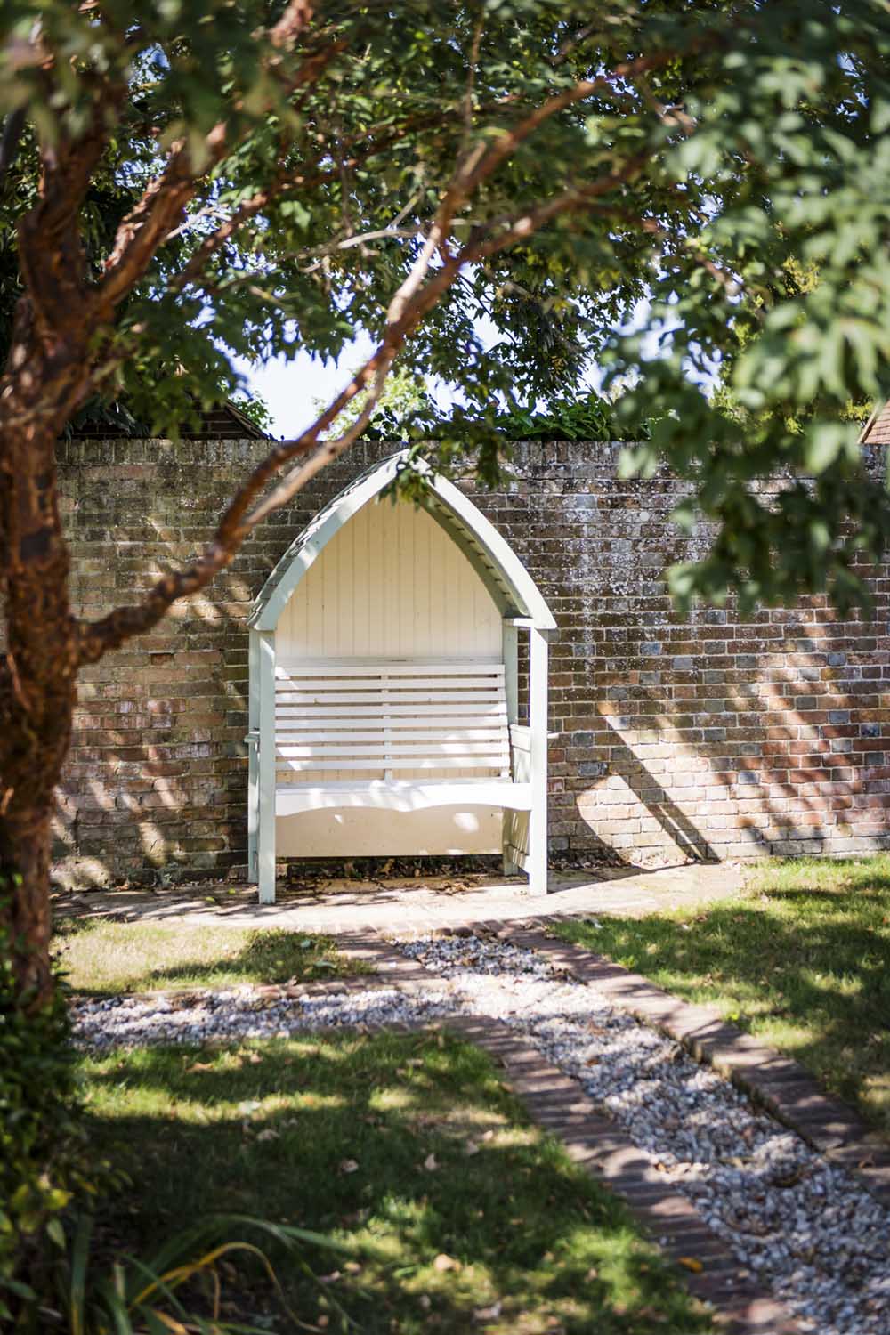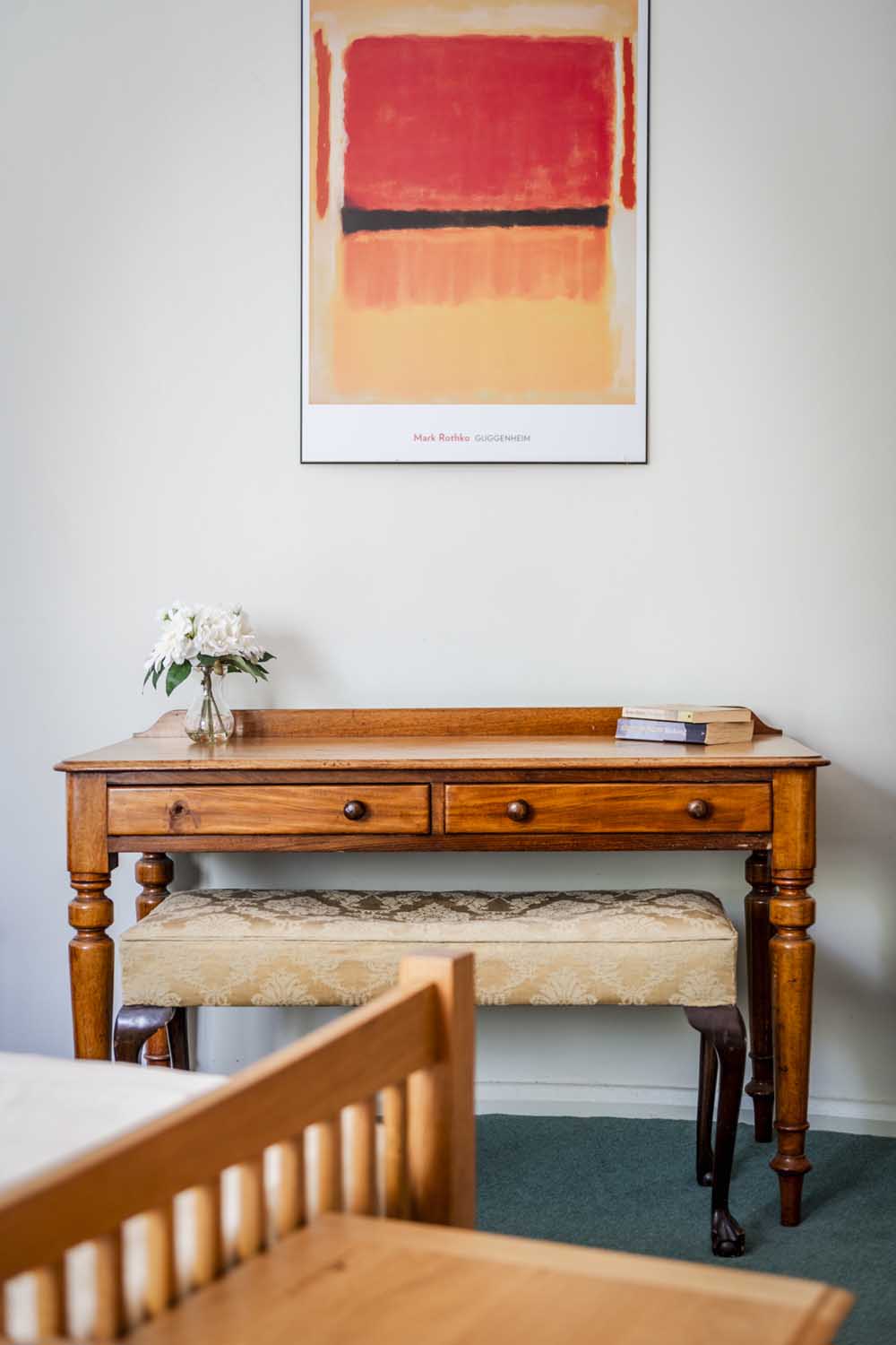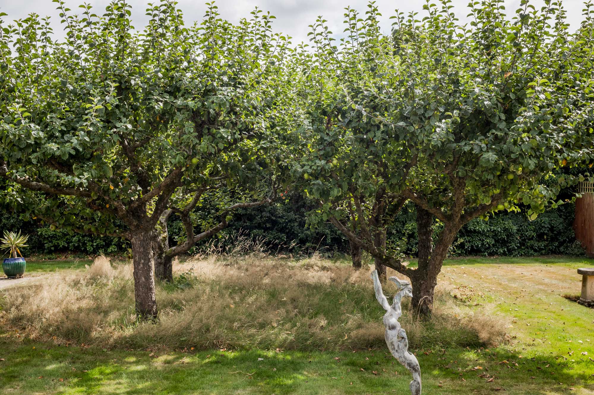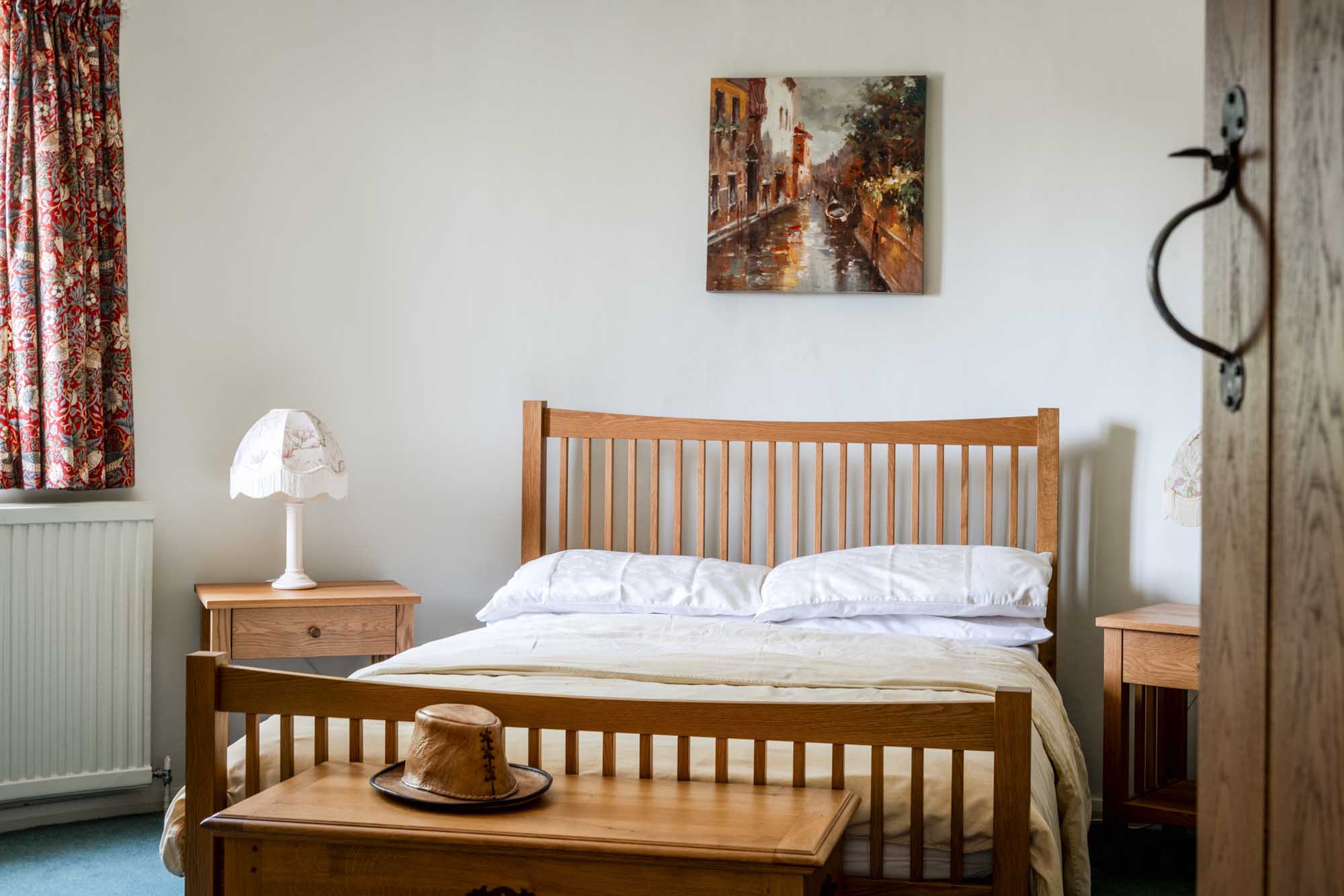Upstairs, the light-filled landing highlights the home’s generous proportions. The principal suite, situated at the western end, offers a large bedroom with dual-aspect views over the garden and an en-suite bathroom that enjoys peaceful countryside views. A second spacious bedroom, currently used as a family room, also benefits from south-facing garden views.