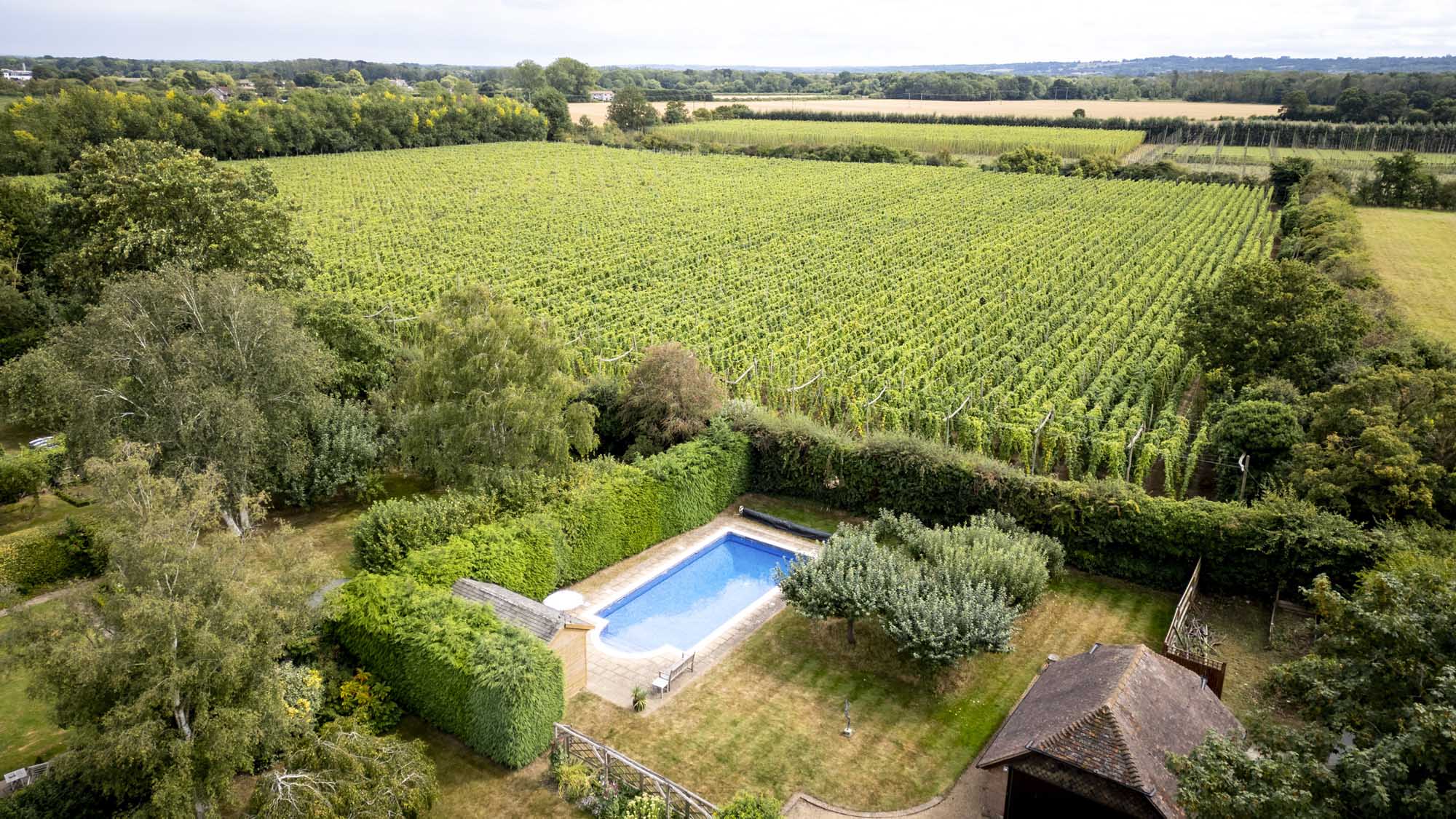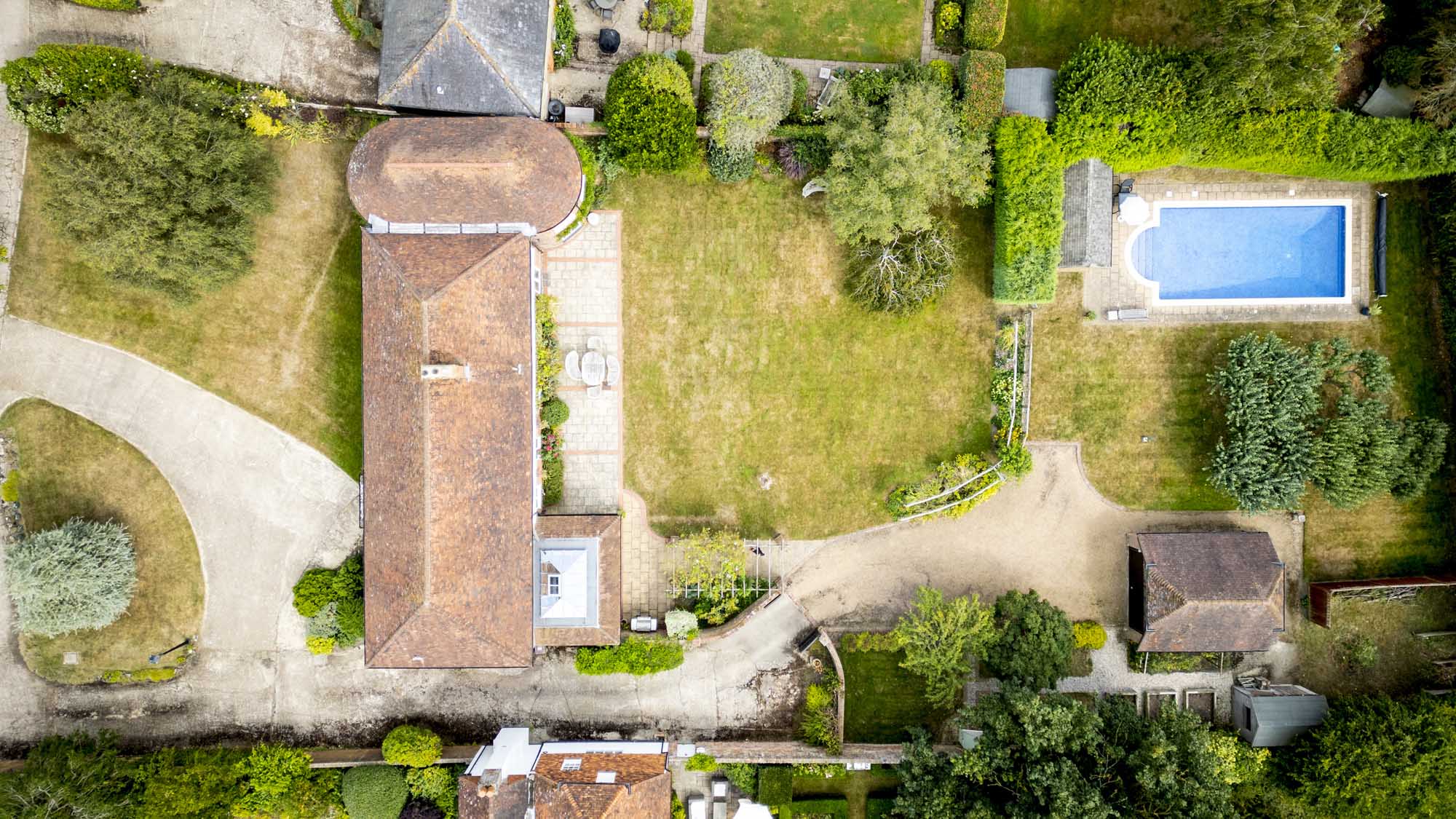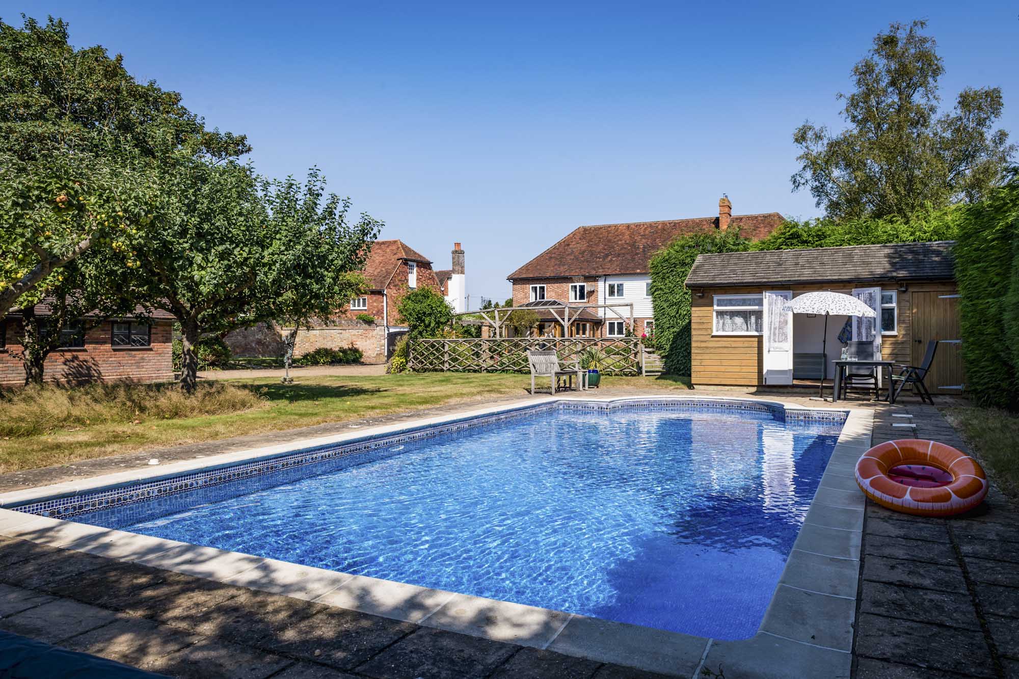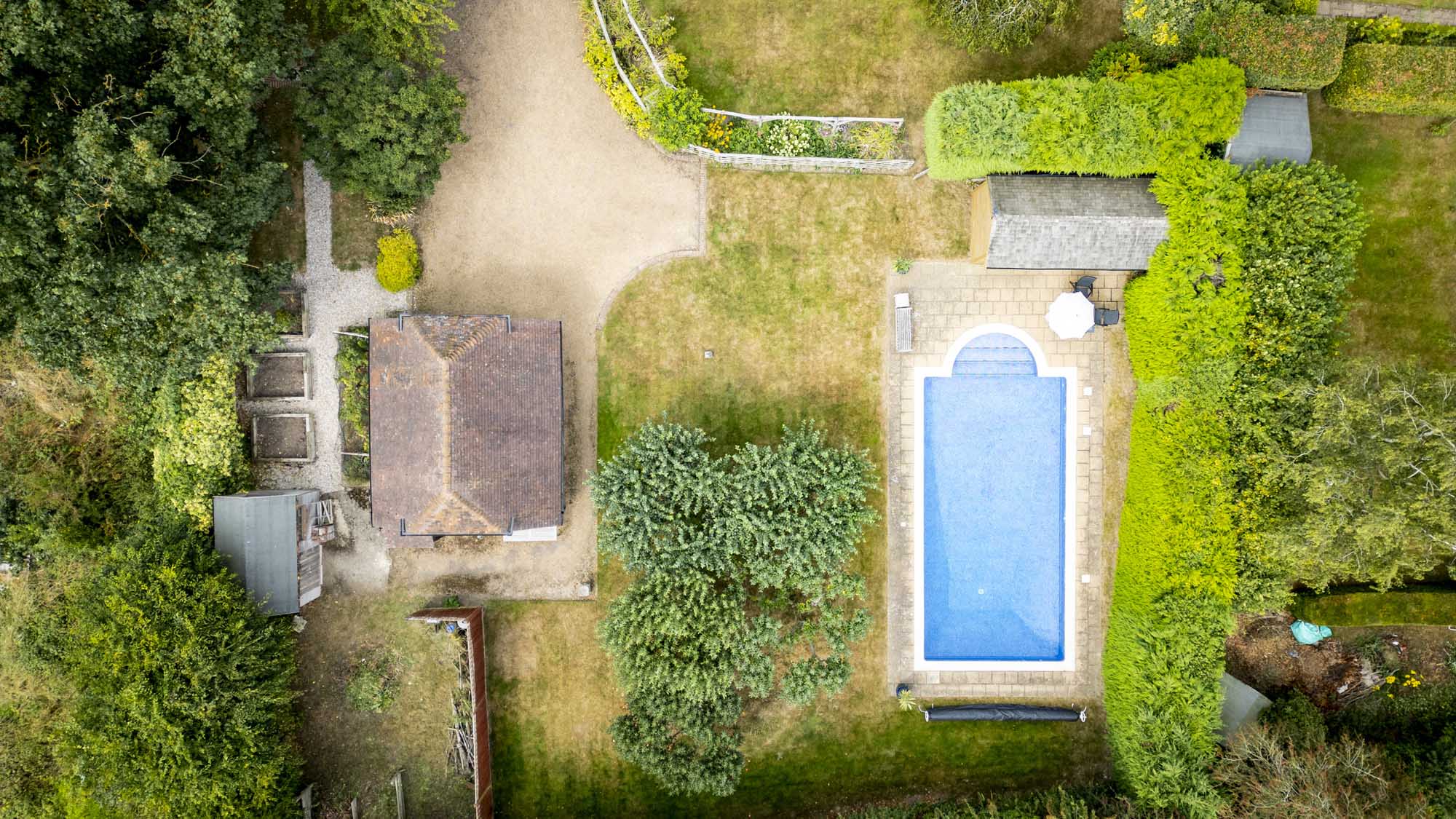 The property enjoys stunning countryside views both to the north and south, making the most of its picturesque setting. At the front, you’ll find a generous parking area with a convenient turning circle, while side access leads to additional parking spaces and a double garage. The south-facing garden is expansive and private, primarily laid to lawn, creating an ideal space for outdoor activities or relaxation. There’s also an inviting pergola and a dedicated BBQ area, perfect for summer gatherings. At the far end of the garden lies a heated swimming pool, complemented by a pool house with its own shower, as well as a small orchard. On the western side, there’s a practical garden management area with a shed, raised beds, and a cozy spot for morning coffee. Wooden gates provide additional parking access beside the garage, adding both functionality and security.