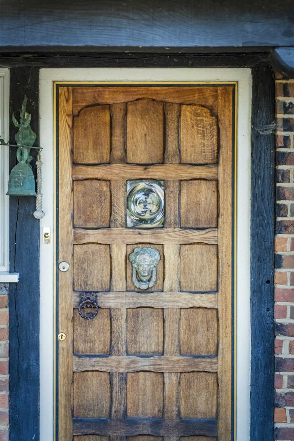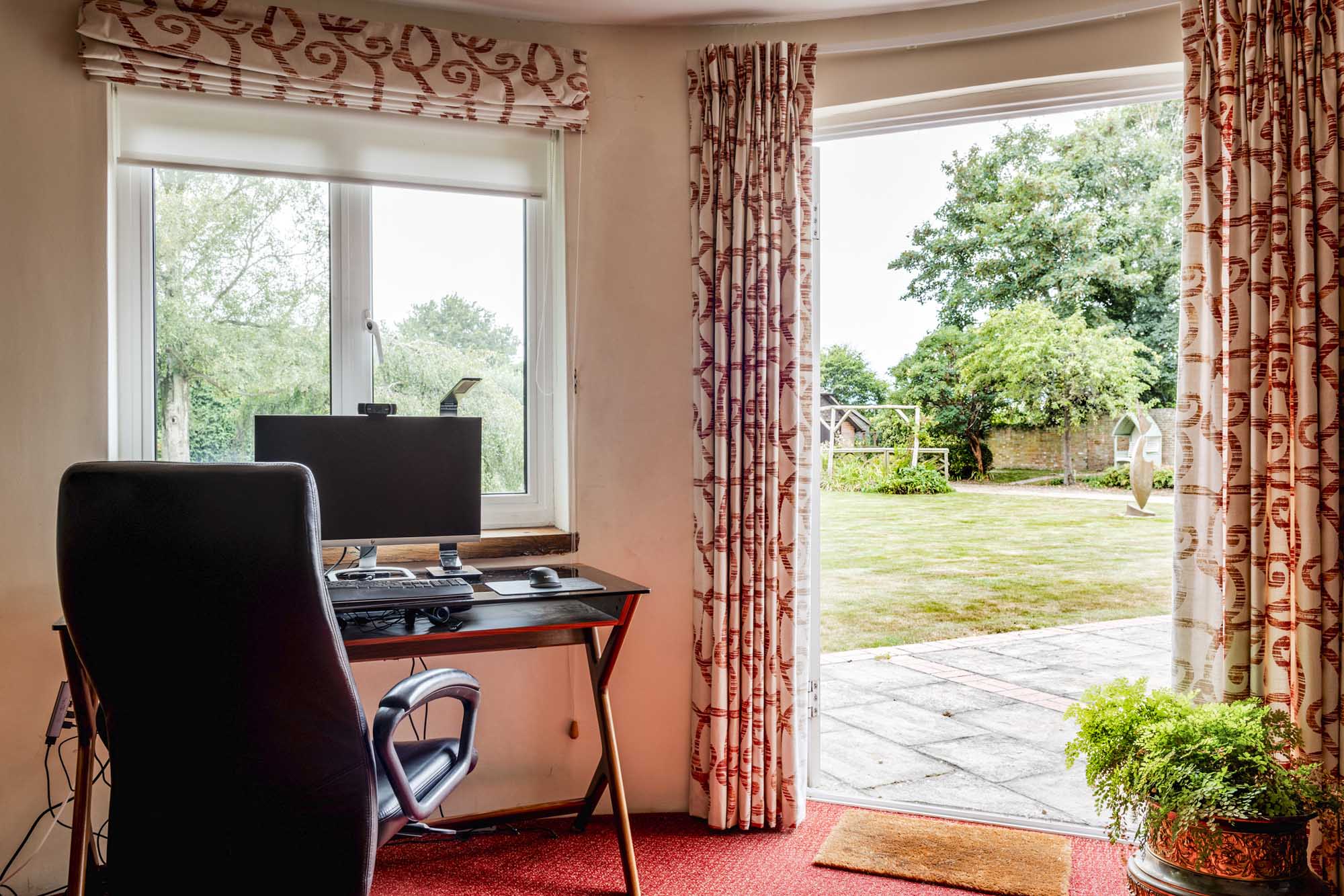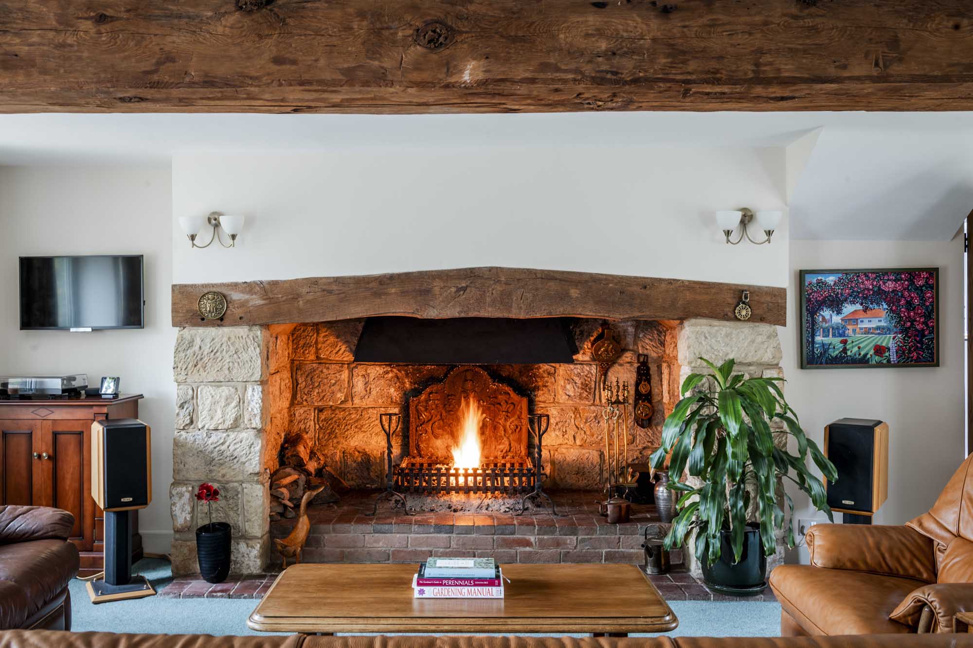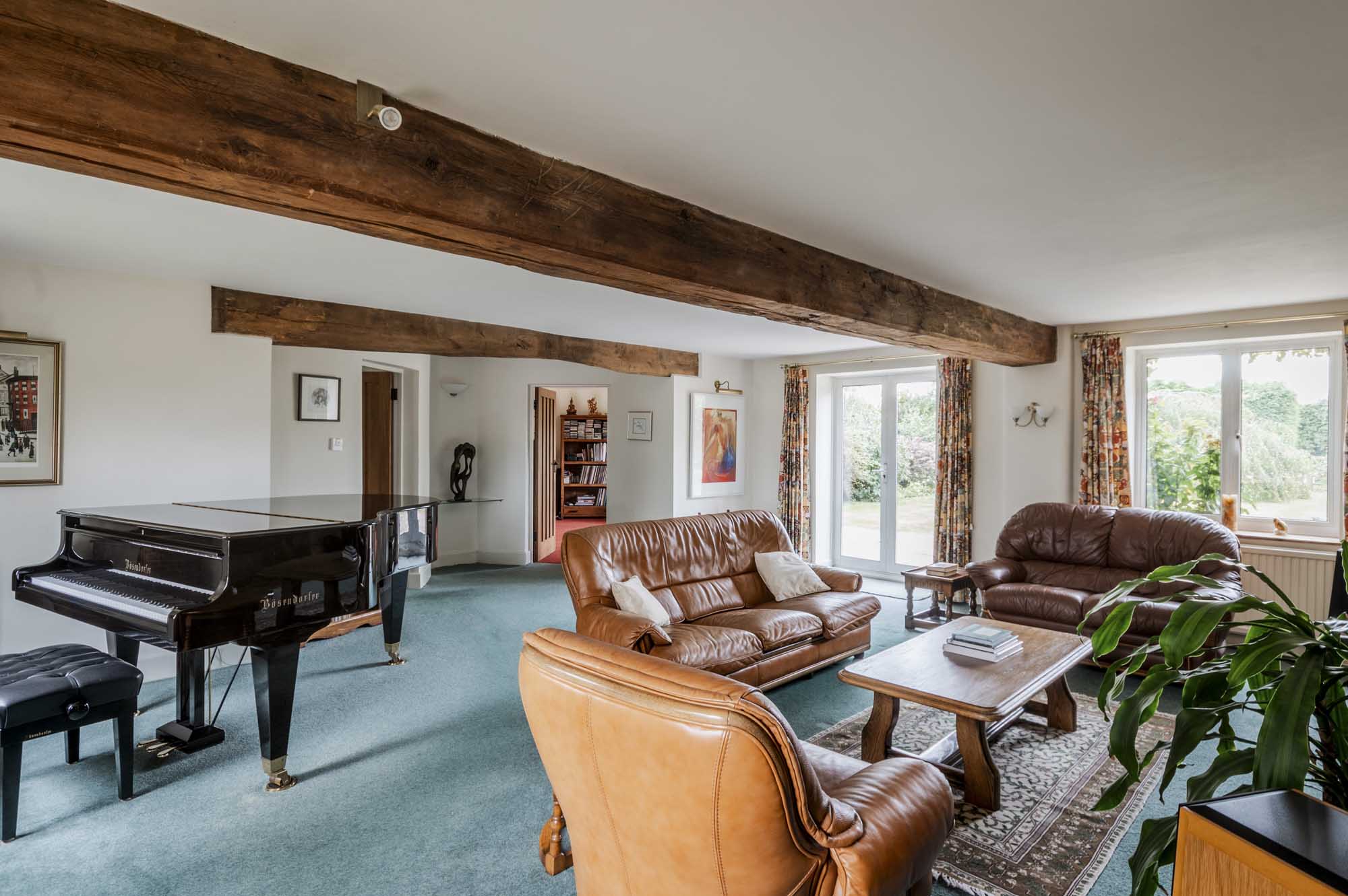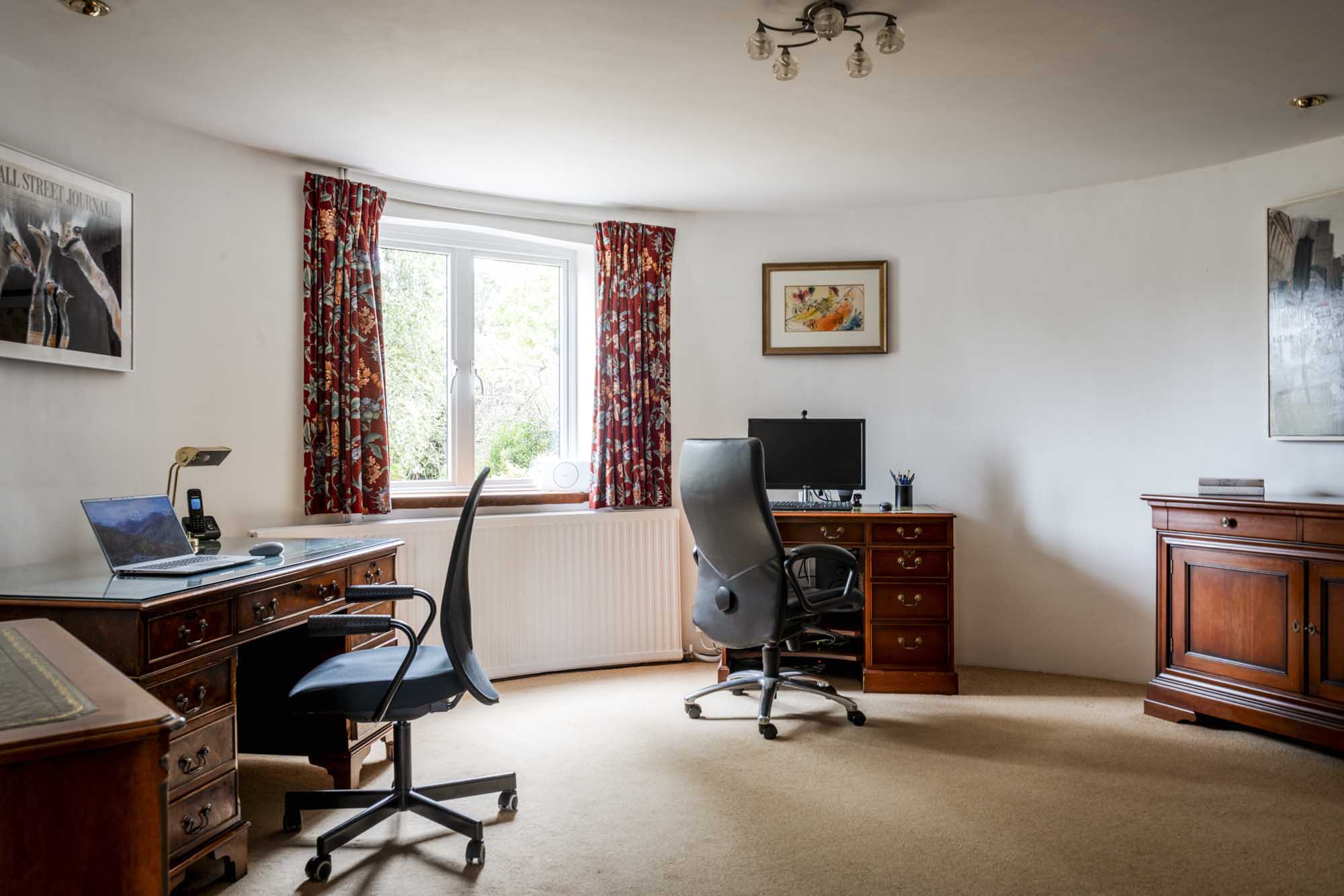 Upon entering, you’re welcomed by a long hallway with wooden floors that set the tone for the home’s warm and inviting atmosphere. The spacious living room is a standout feature, anchored by an impressive inglenook fireplace with a stone surround that adds a touch of rustic elegance. French doors open out onto the south-facing garden, creating a seamless transition between indoor and outdoor spaces. At the east end of the house, two roundels offer versatile spaces currently used as offices, though they could easily be adapted to serve as a playroom, snug, or additional living area, with one room enjoying views over the garden and the other over the fields.