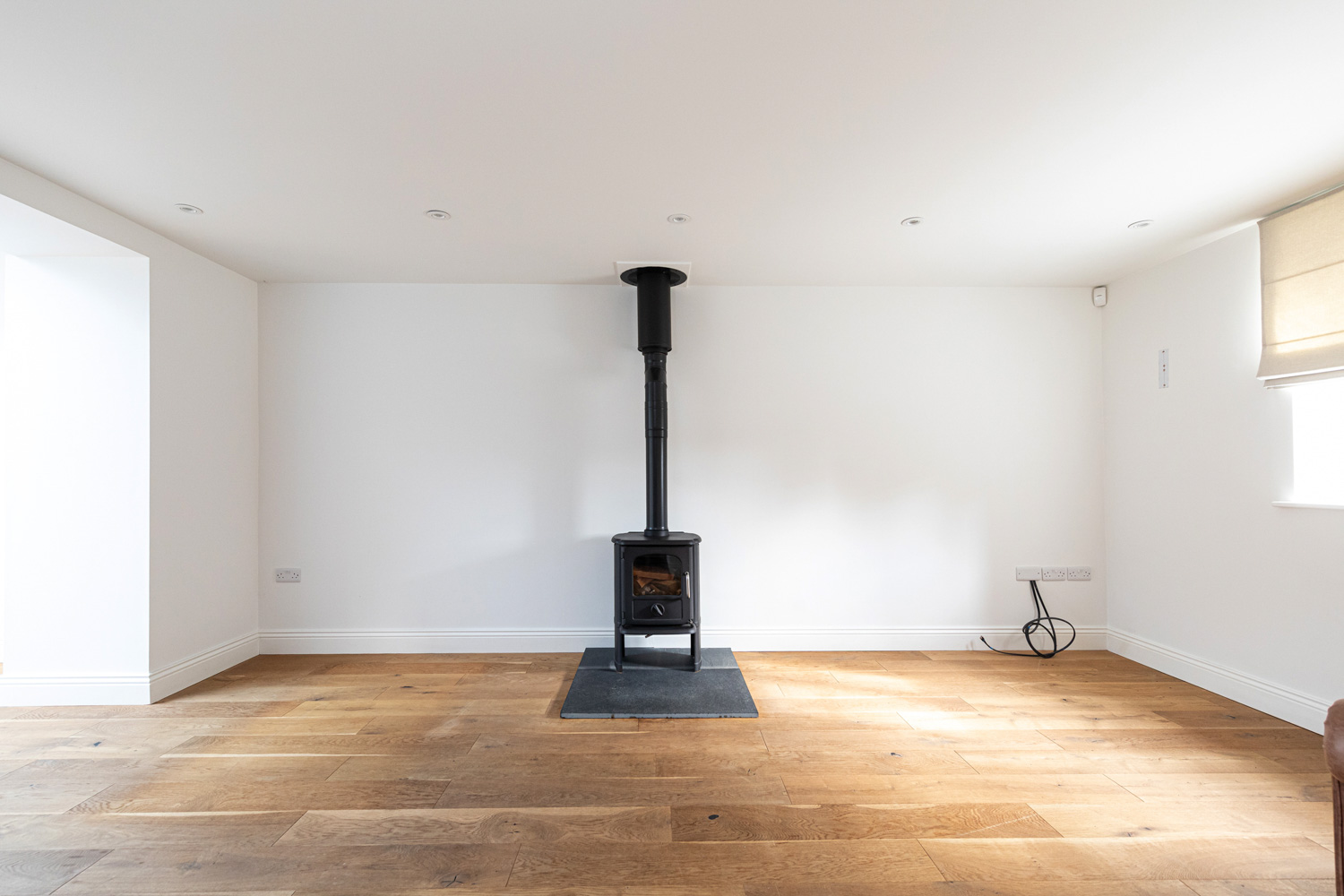 A lovely light entrance hall with oak staircase rising to the first floor and a large understairs cupboard with plumbing for a washing machine leads straight into the open plan living accommodation that covers the whole of the ground floor. The sitting room boasts a traditional style wood burning stove for cosy nights in and the dining room is situated in a wonderful garden room with roof lantern and French doors out to the rear garden. The kitchen is smart and contemporary with an excellent range of wall and floor units, integrated appliances including oven, electric hob and dishwasher, and space for a large American style fridge/freezer.