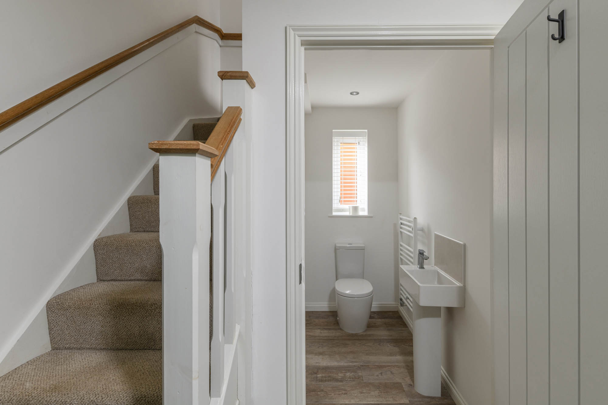 The house opens into a welcoming entrance hall, where access to the integral garage sits alongside a cloakroom/WC, and the stair rises to the first floor. From here, the principal reception space is positioned to the front of the house. The sitting room is comfortably proportioned, with a broad window drawing in natural light and creating a space that works equally well for everyday use or quieter evenings.