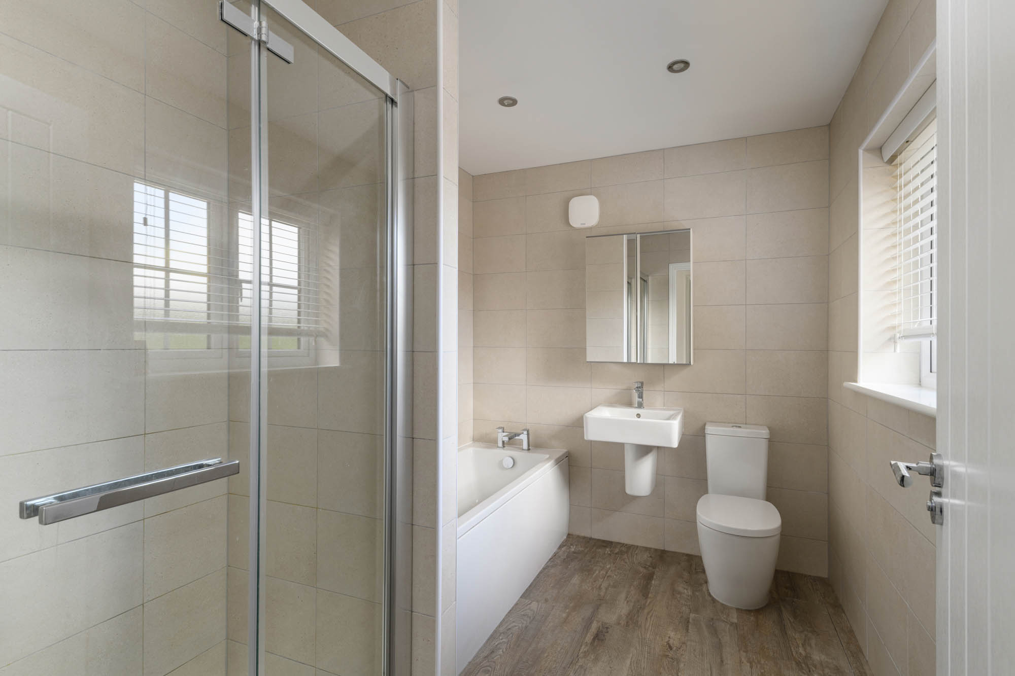 Upstairs, the accommodation is well balanced. The principal bedroom sits to the front and benefits from its own en-suite shower room, creating a comfortable and private space. Two further bedrooms are positioned to the rear, each well sized and suited to a range of uses, whether as additional bedrooms, guest space or a home office. These are served by a family bathroom, finished in a clean, contemporary style.