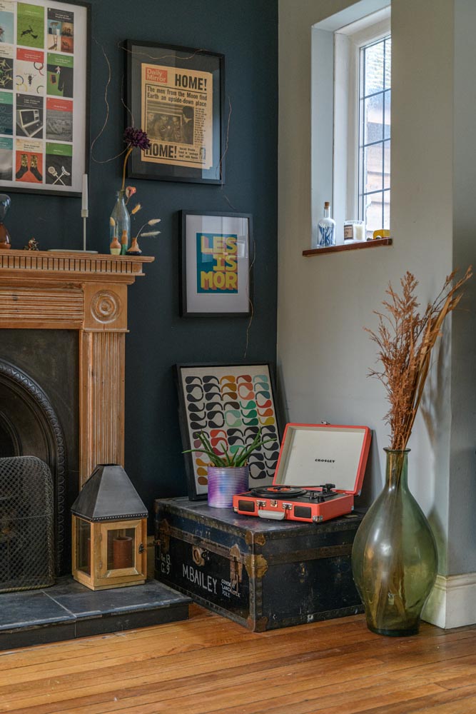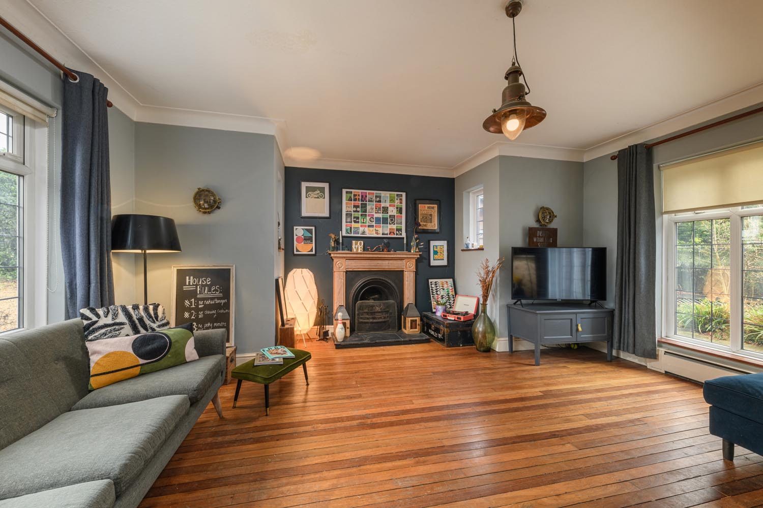 The main sitting room lies just off the hall, a wide, dual aspect space with large windows overlooking the garden and a handsome cast iron fireplace forming a focal point. Soft, muted tones and original timber flooring lend warmth and character, creating a room equally suited to relaxed evenings or entertaining guests.