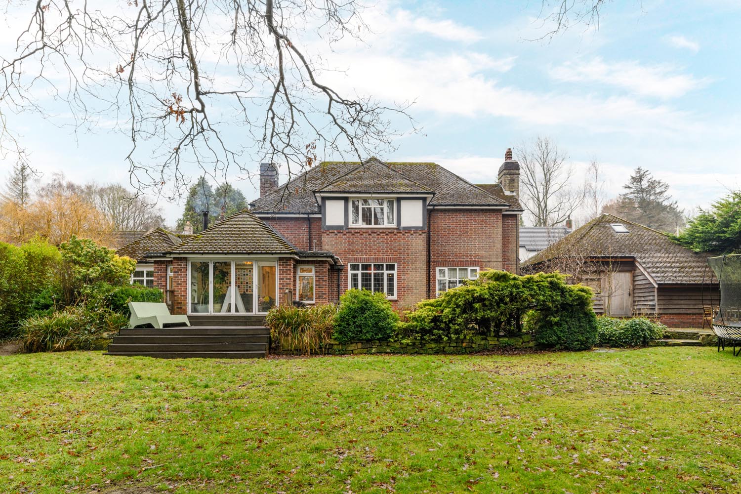 The gardens wrap around the house, creating a private and well screened setting with a mix of lawn, mature shrubs and established planting. A raised decked terrace sits directly off the garden room, ideal for outdoor dining, stepping down to a broad lawn bordered by trees and colourful borders.