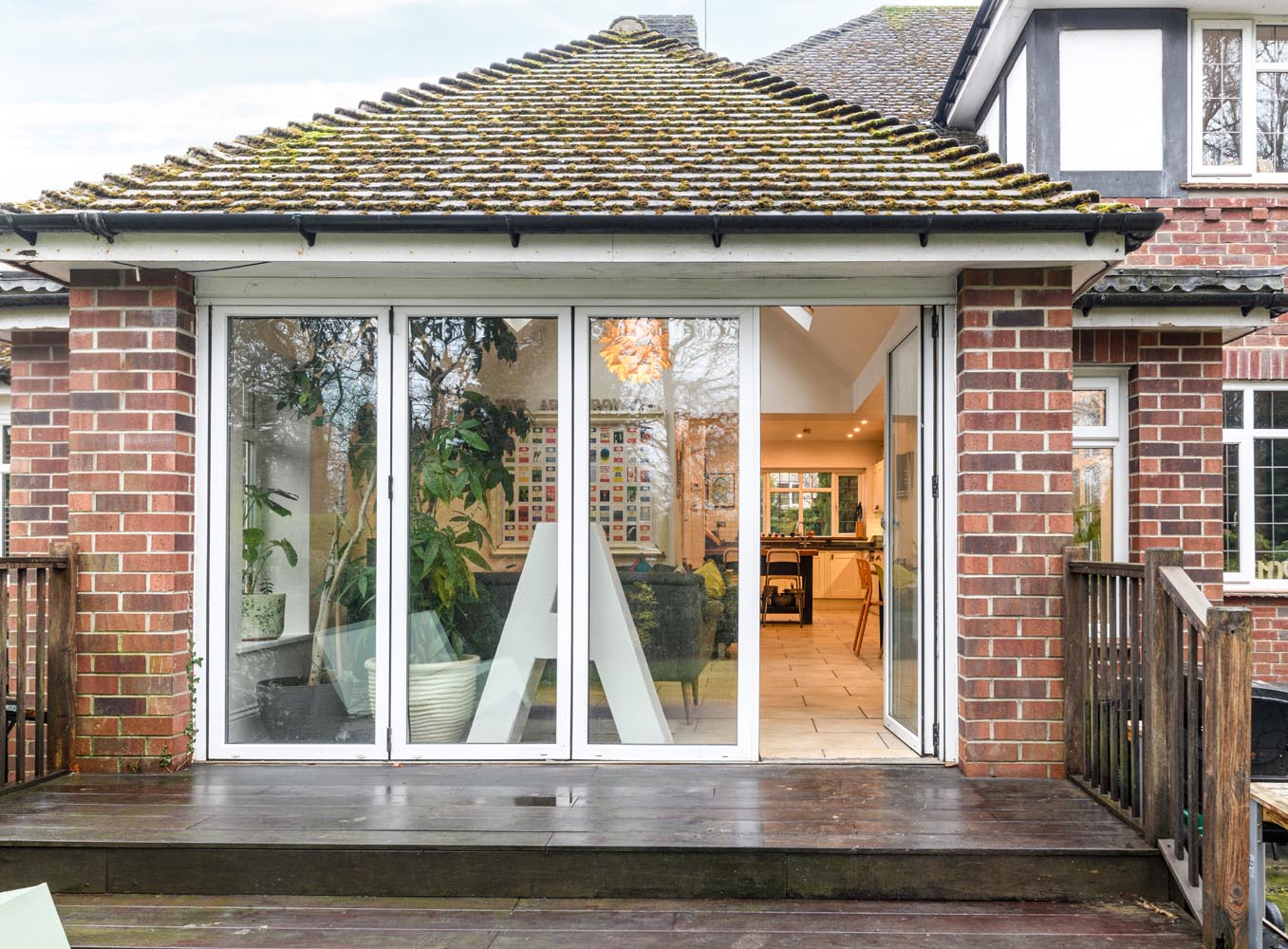 From here, the house flows into the extended garden and family room, where a vaulted ceiling with roof lights and expansive glazing draws natural light deep into the space. A wood burning stove forms a welcoming focal point, while folding doors open directly onto the terrace. With ample room for both dining and lounging, it is an easy, sociable space that connects seamlessly with the garden.