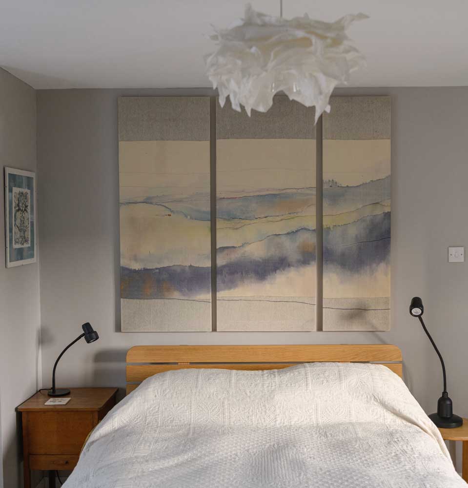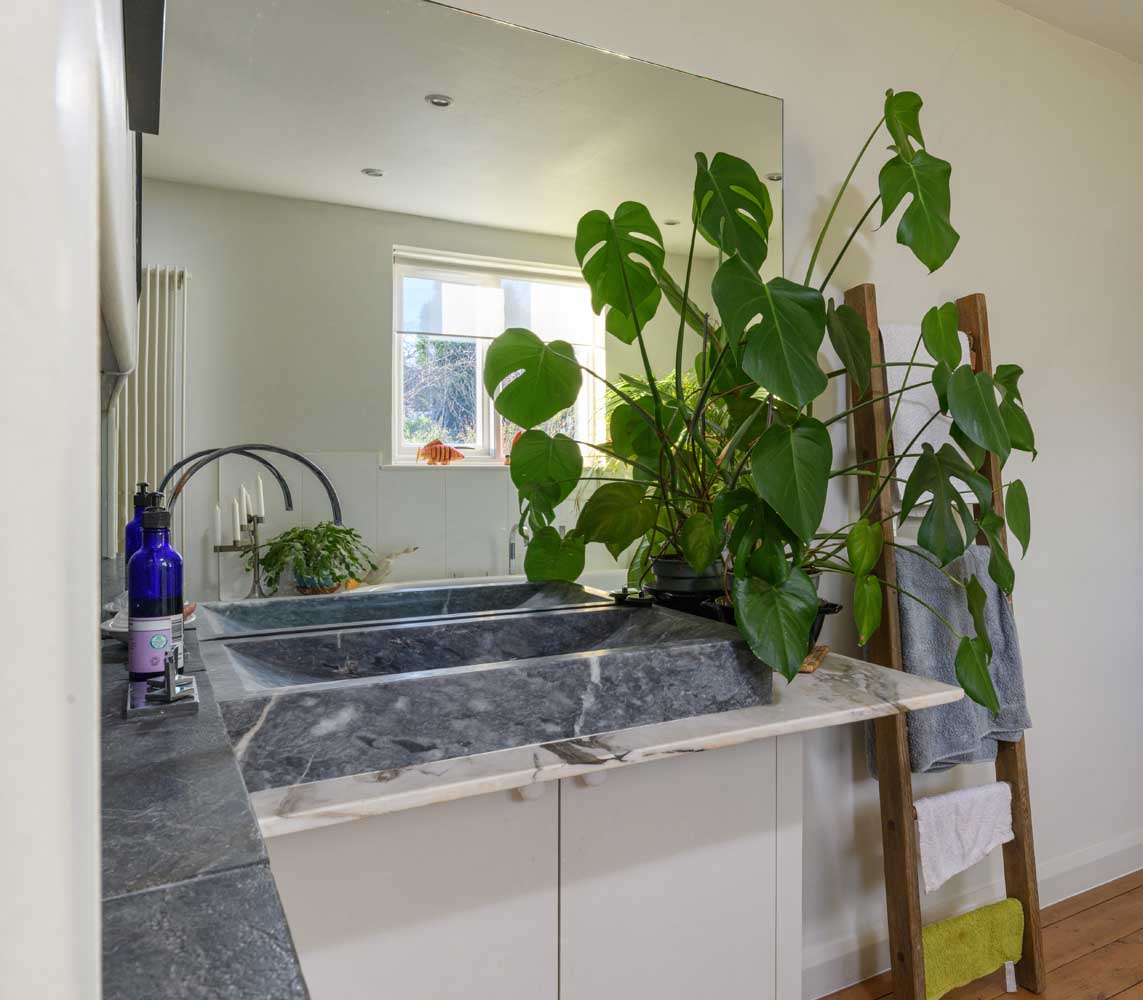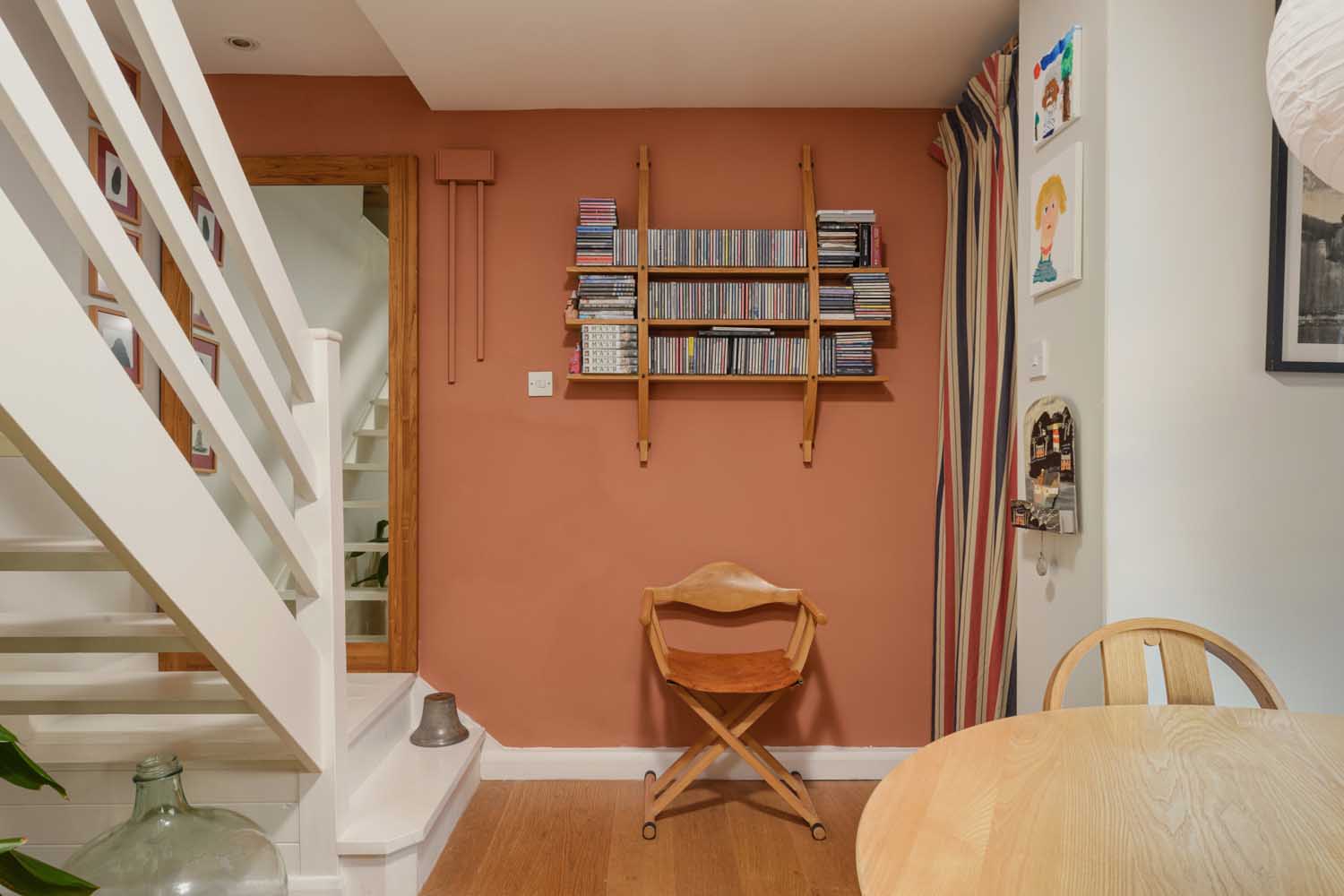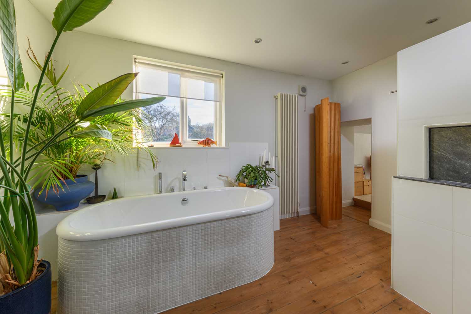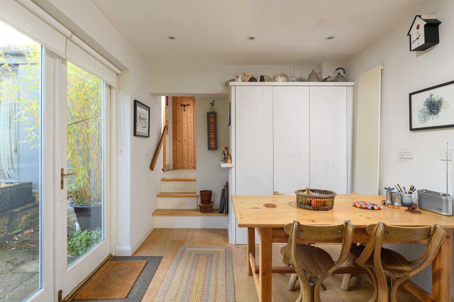 The contemporary kitchen is thoughtfully designed, with sleek cabinetry, open shelving, and integrated appliances, including a dishwasher, fridge freezer and double oven. A set of double-glazed doors open directly onto the south-facing garden. Adjacent to the kitchen, you’ll find a convenient downstairs shower room with a WC, as well as a stunning garden room that provides a peaceful retreat. Skylights bathe the space in natural light, and a further set of doors leads out to the terrace beyond. Currently arranged as a second living room, this versatile space could easily serve as a dedicated home office or studio, complete with generous fitted storage units.
