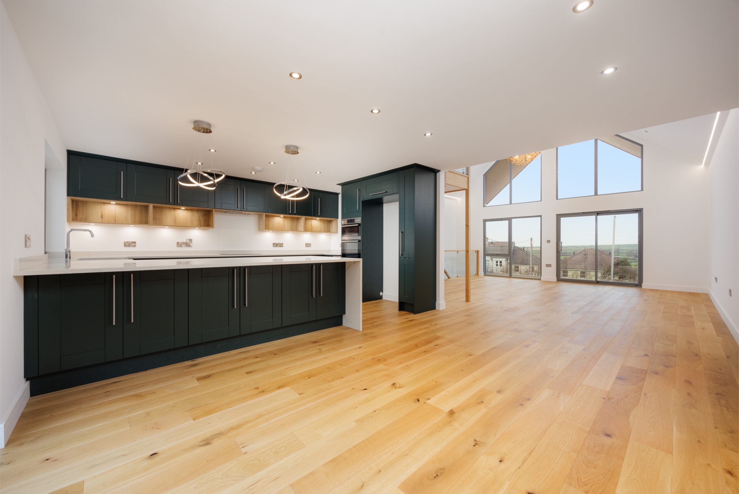 With its dramatic glazed gabled frontage and clean contemporary lines, the house immediately makes a statement. Thoughtfully conceived to maximise natural light, space and its far-reaching outlook, the principal living accommodation is arranged on the first floor, perfectly positioned to capture the wonderful views across Wadebridge and beyond. Here, a superb open-plan kitchen, dining and living space forms the heart of the home. Expanses of glazing to both front and rear elevations flood the interior with light and create a seamless connection to the outdoors. Balconies at either end offer delightful vantage points, the front perfectly framing the town and countryside views for evening sunset drinks, and the rear providing a sheltered spot for morning coffee. The stylish green kitchen is beautifully appointed with sleek cabinetry, elegant white work surfaces and a comprehensive range of integrated appliances, combining refined design with everyday practicality. Above, a striking mezzanine second-floor level provides a versatile additional living space, ideal as a further more private sitting room, home office or even creative studio area, enhancing the sense of architectural interest and flexibility within the home.