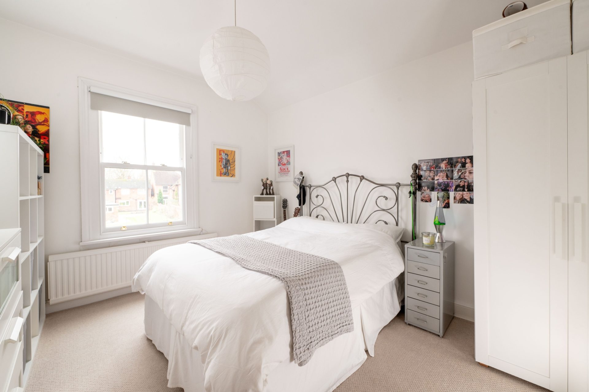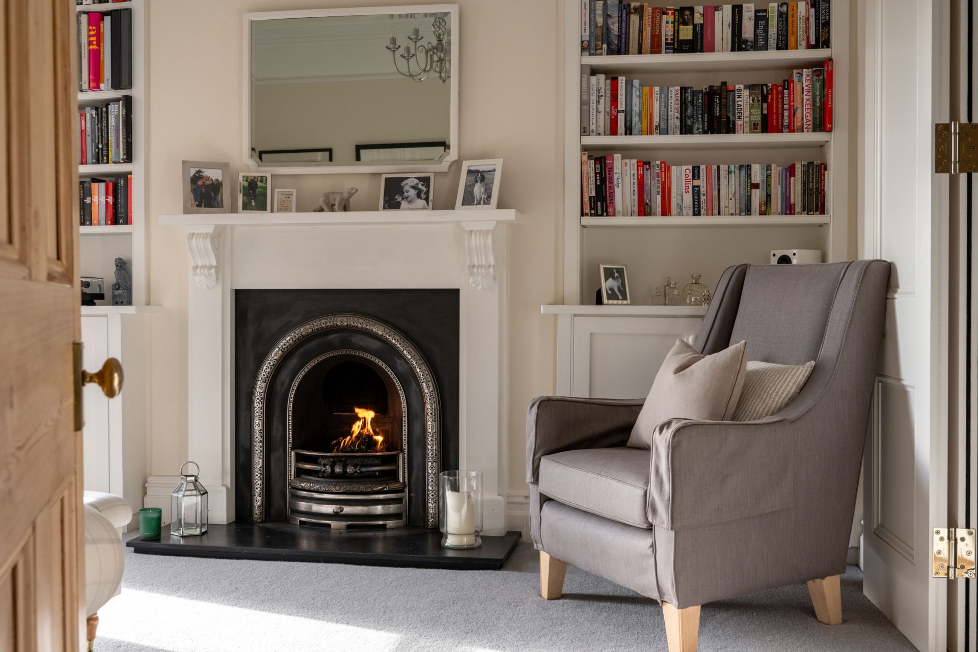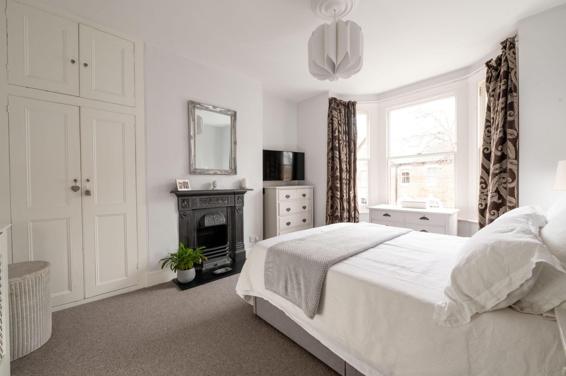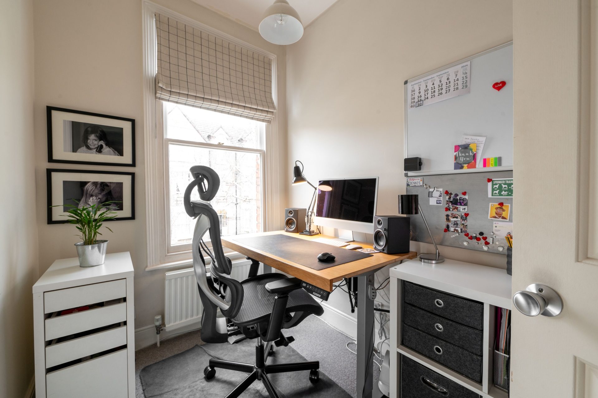 Bedroom Two, positioned at the front of the home, overlooks the tree-lined street and includes a decorative fireplace and a built-in cupboard. Adjacent to Bedroom Two is a smaller room, currently used as an office. This space could be reconfigured as a dressing room or adapted into an en-suite, subject to provisions.