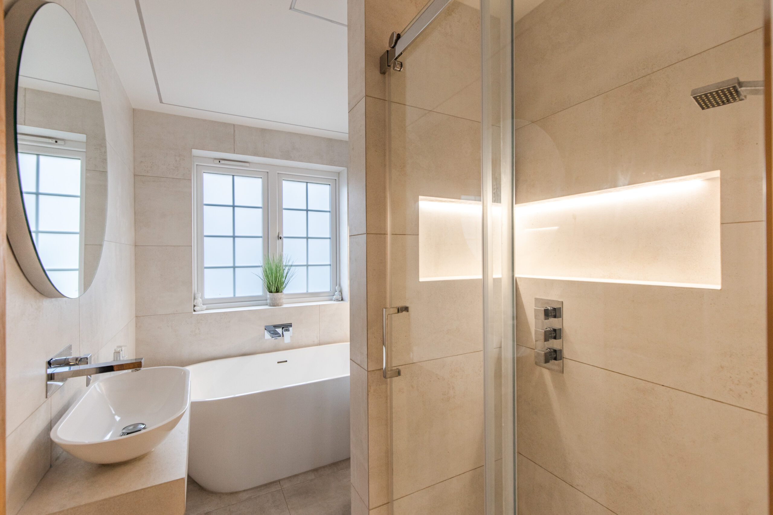 Upstairs, the property benefits from five well-proportioned bedrooms with fantastic field views. The family bathroom has been thoughtfully designed with a contemporary edge, offering a luxurious and calming, retreat-like feel. Fully tiled in sleek, modern finishes, a freestanding bath takes centre stage, complemented by a separate walk-in shower, modern basin, and WC. Subtle LED lighting enhances the clean lines and ambient feel, creating a spa-like atmosphere.