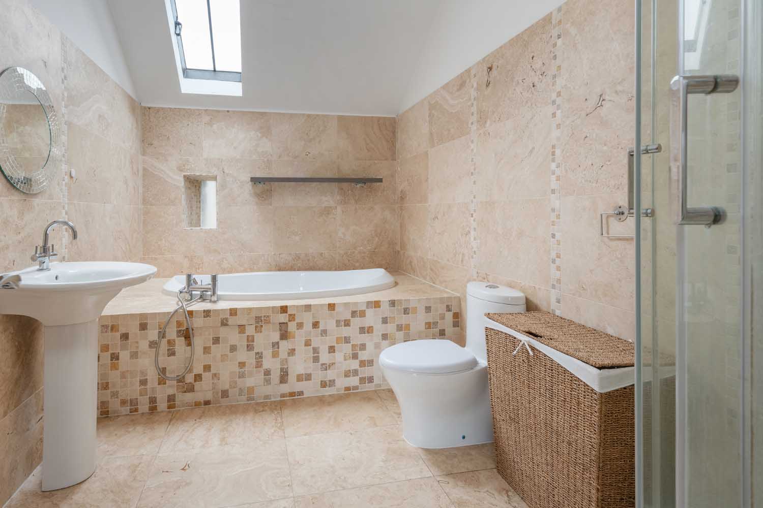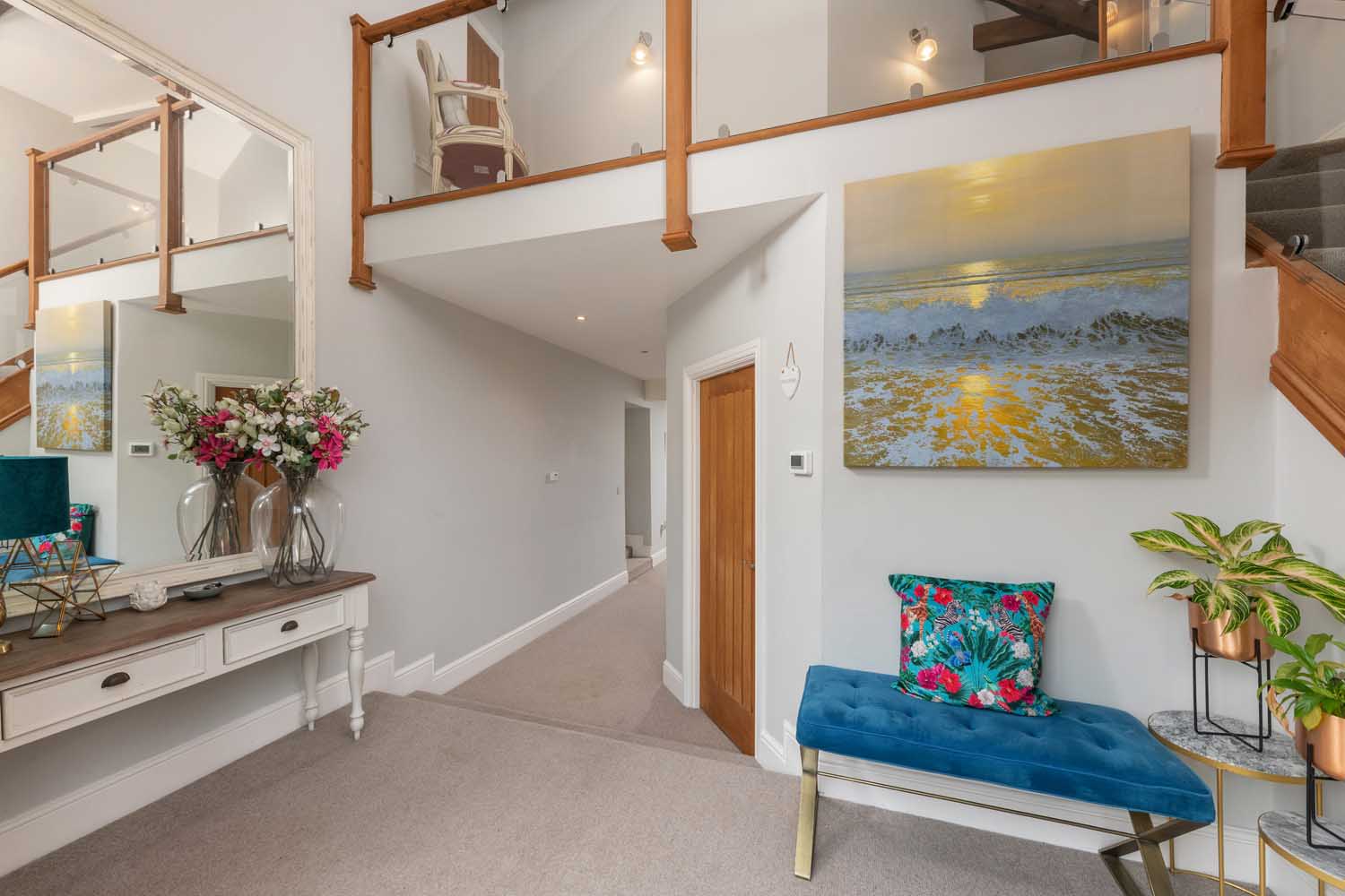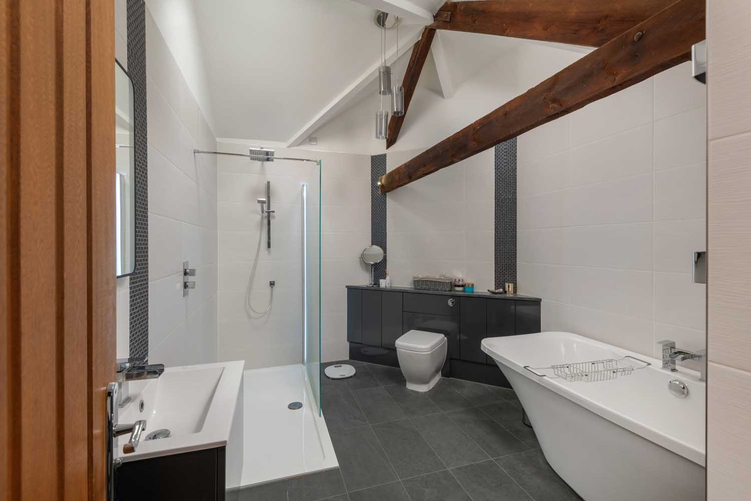 The first floor is approached via a wide staircase that rises to an impressive 50-foot landing with a mezzanine gallery above the entrance hall. The principal suite occupies its own wing, a vaulted retreat with exposed timbers, bespoke lighting, and a large dressing room. The en-suite bathroom is equally well-appointed, with a walk-in rainfall shower, freestanding bath, and carefully integrated lighting. Three further double bedrooms lie across the landing — one with en-suite shower room — while the remaining rooms are served by a spacious family bathroom.