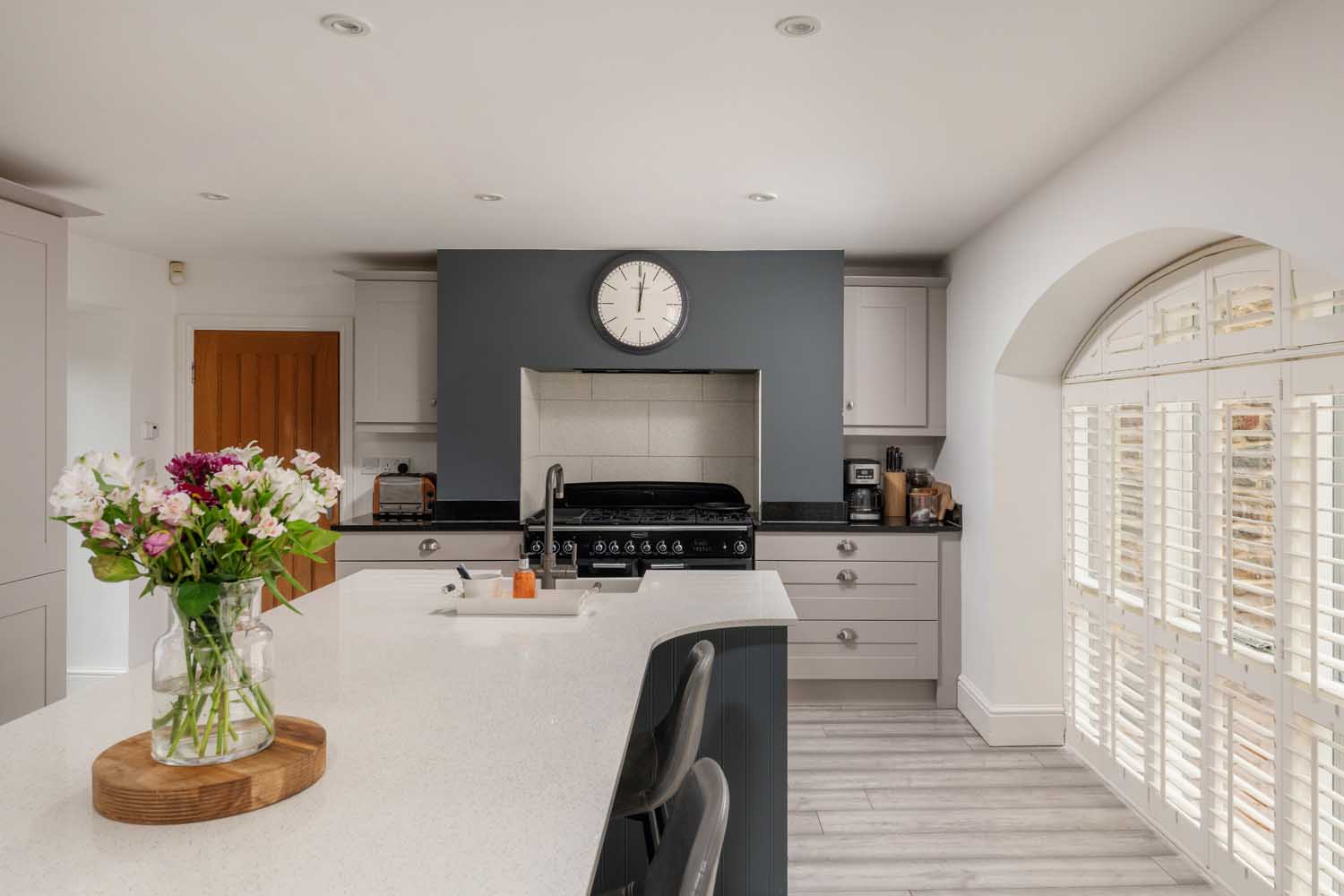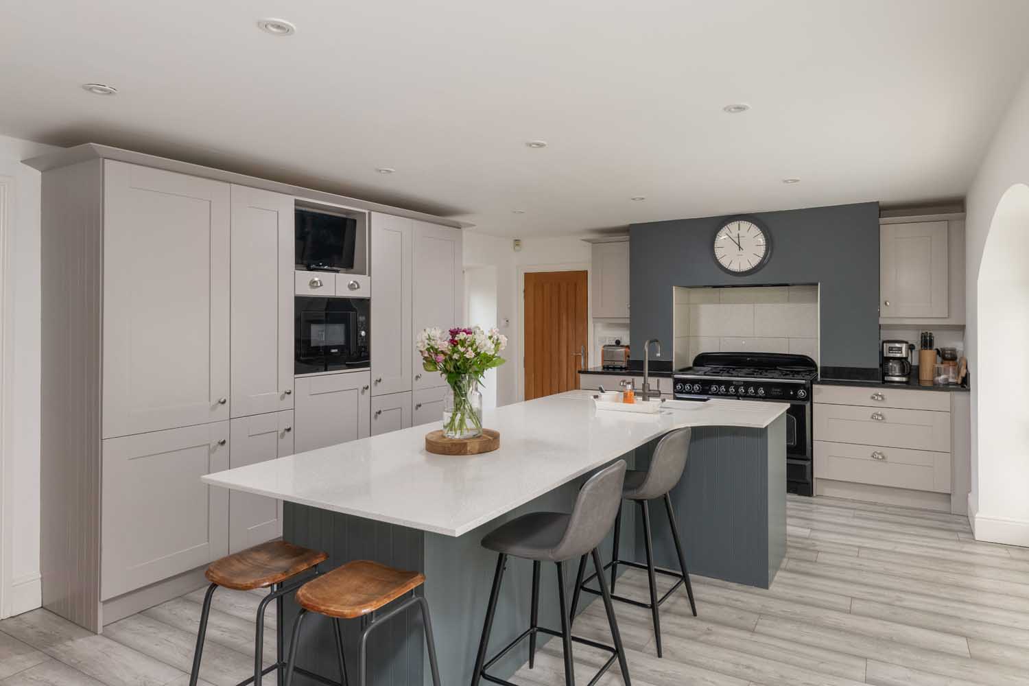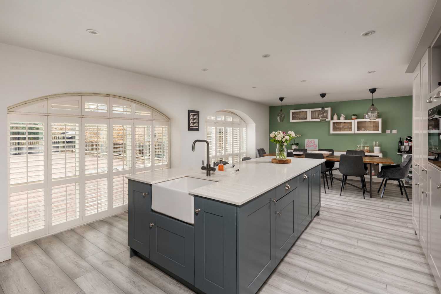 The accommodation extends to over 3,000 sq ft, wrapped up in the fabric of thick stone walls, exposed beams, and vaulted ceilings. At the centre of the ground floor is a large double-height reception hall with a mezzanine landing above. Underfloor heating extends throughout the ground floor. The kitchen and dining room span more than 25 feet, defined by full-height arched windows that flood the space with light. A large central island anchors the kitchen, surrounded by integrated appliances including twin fridge-freezers, a range cooker, microwave, and dishwasher. Bespoke cabinetry and a sleek breakfast bar complete the kitchen, while ample space remains for informal dining.