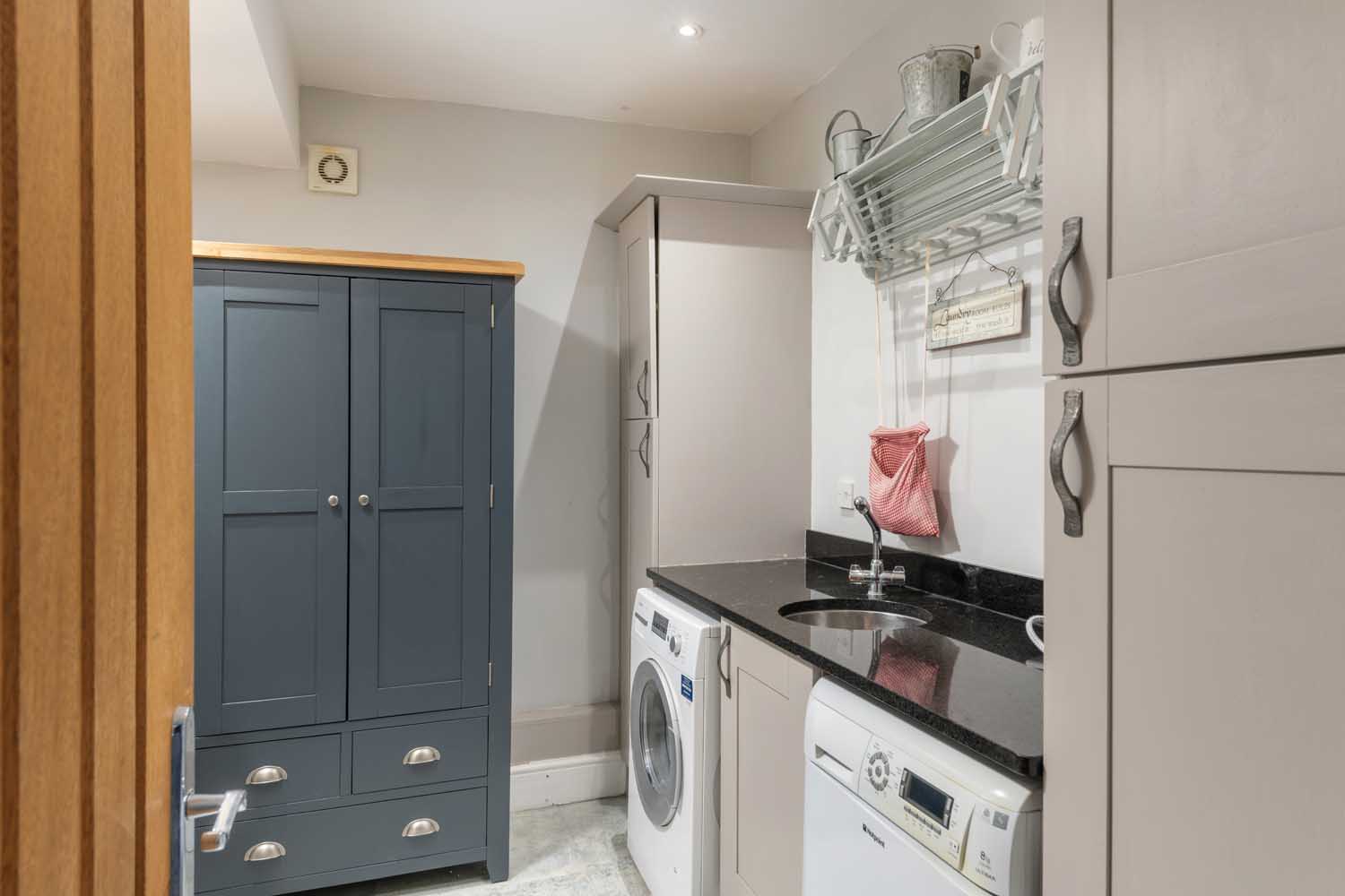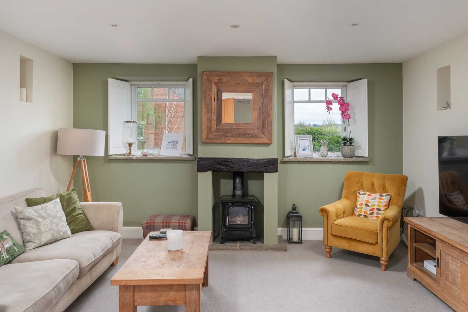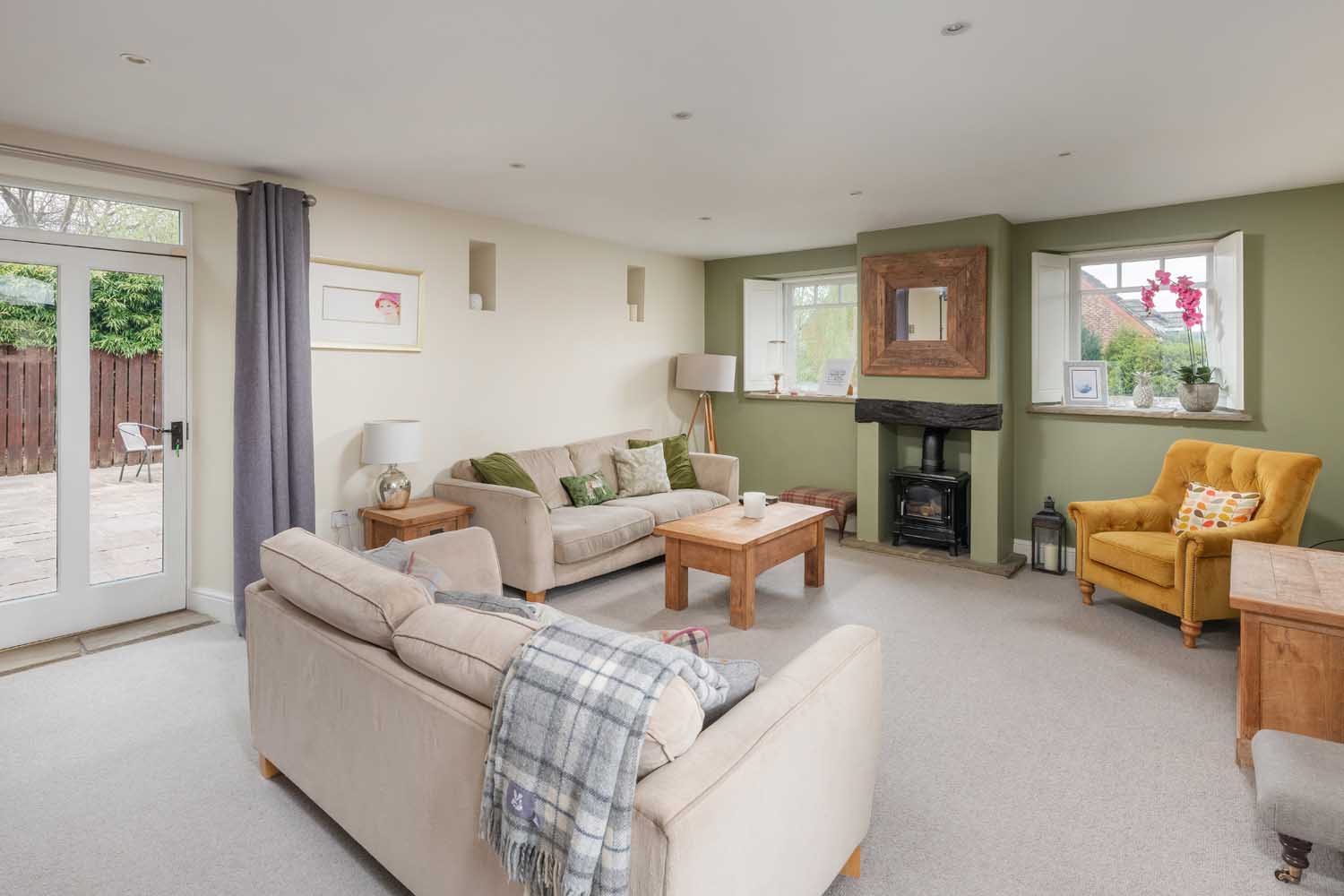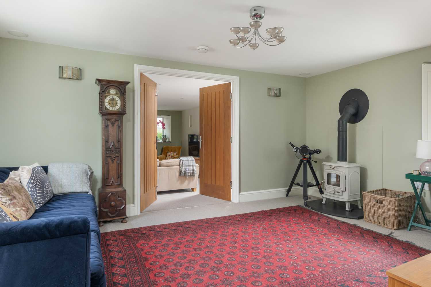 Off the kitchen, a further reception room offers flexible use, ideal as a playroom, snug, or home office, while to the rear, a second living area provides a more intimate setting for dining or relaxed evenings. Beyond lies the main sitting room: a 22-foot space arranged around a feature fireplace, with twin doors opening to the terrace and garden beyond.