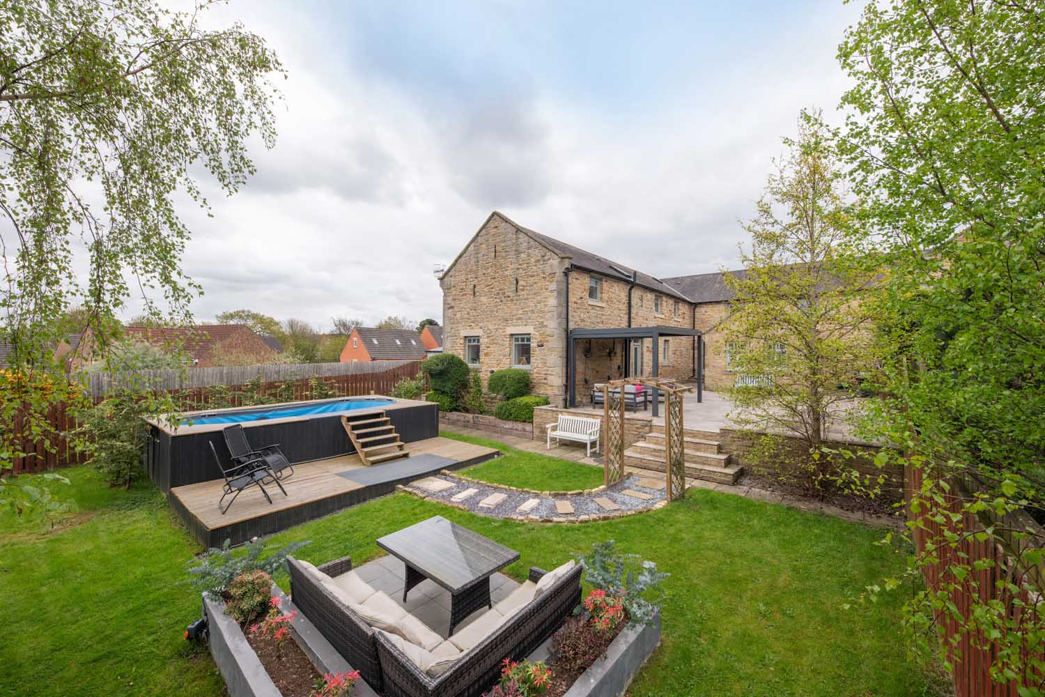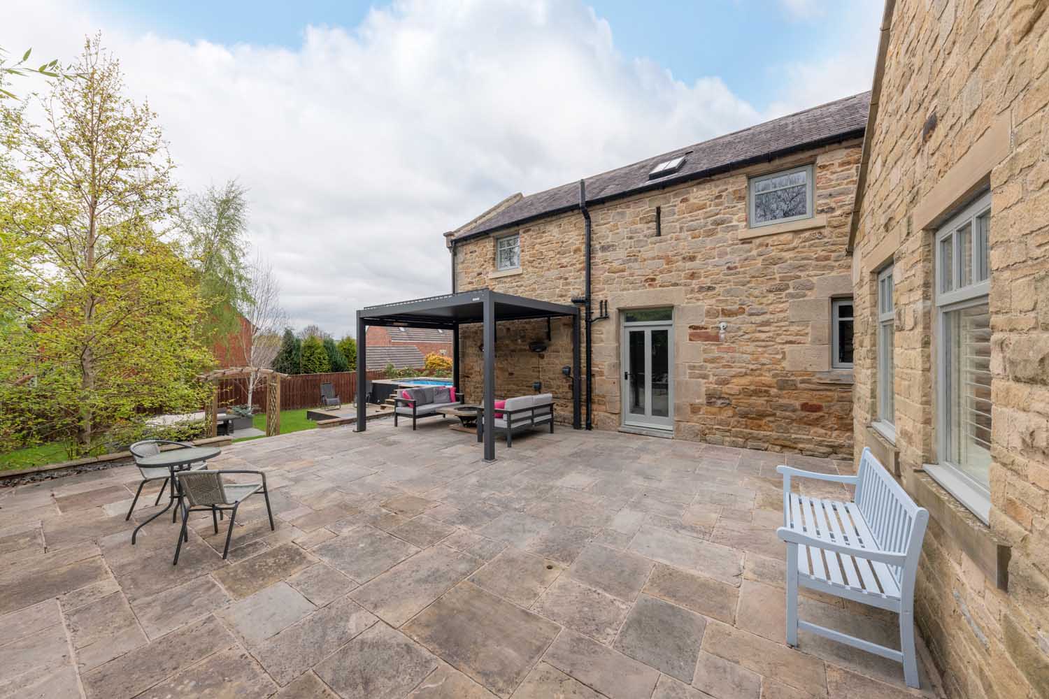 Externally, the gardens are designed for enjoyment as well as privacy, with stepped terraces, a pergola walkway and a sheltered patio beneath a louvred aluminium canopy. A swim spa provides a touch of luxury, while the detached double garage has been converted for use as a gym and games room. Additionally, an charging point has been installed on the front of the garage.