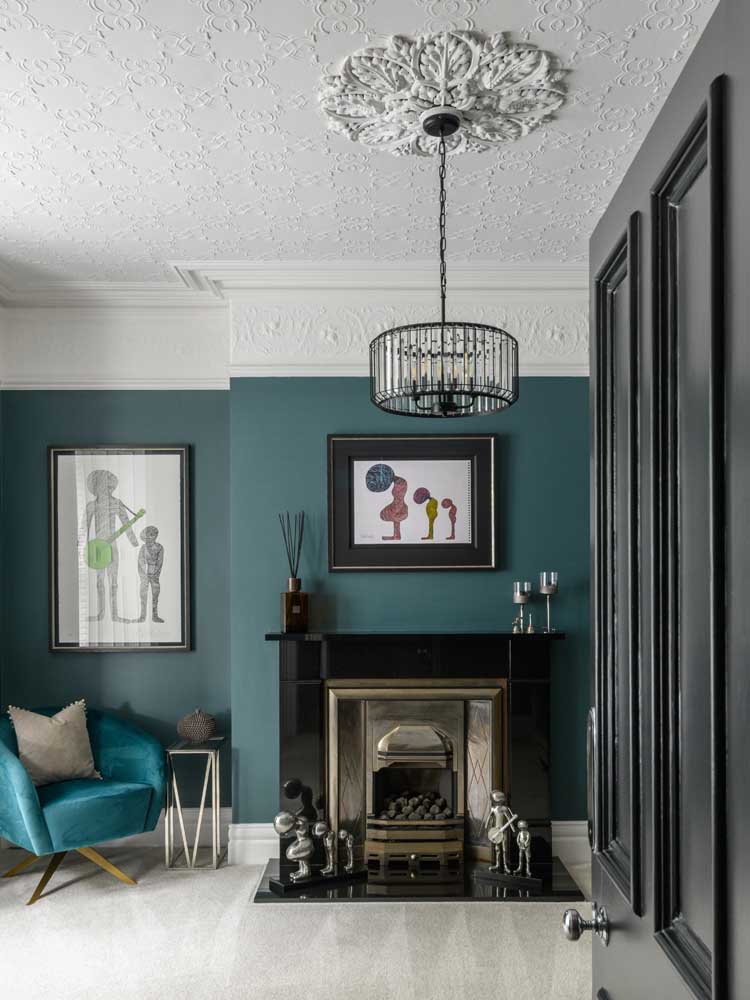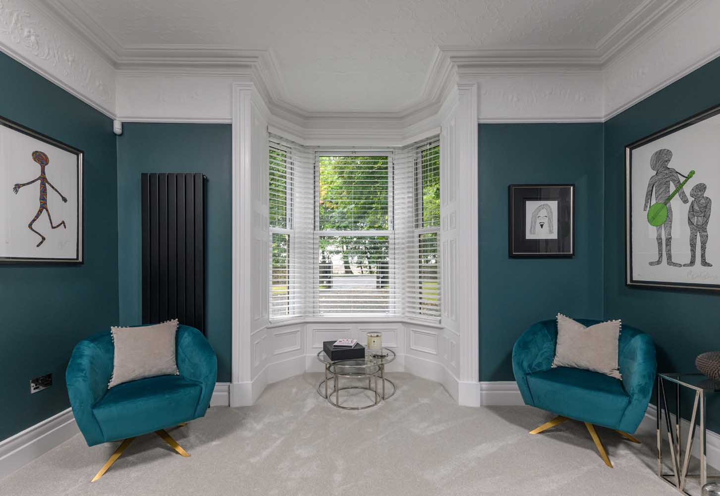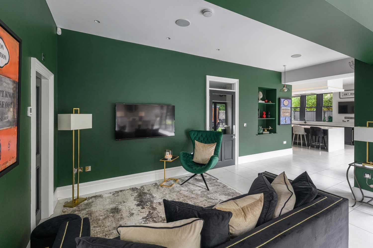 To the left, the drawing room offers a bold interpretation of period style. Deep teal walls frame a polished black fireplace, while the generous bay window brings a bright balance to the rich palette. Across the hallway, a refined sitting room showcases the home’s period detailing, with ornate coving, a decorative ceiling rose and a polished fireplace. The tall bay window floods the room with natural light, highlighting the soft palette and elegant proportions, making it ideally suited for formal entertaining or quiet evenings. Adjacent, the snug provides a more relaxed, informal setting. Deep blue paneling frames the television with concealed shelving to either side, combining a streamlined aesthetic with discreet, practical storage. A large window brightens the space, softening the bold tones and creating a welcoming atmosphere. The space combines style with everyday practicality, making it ideally suited for use as a family snug, media room or an intimate entertaining space.