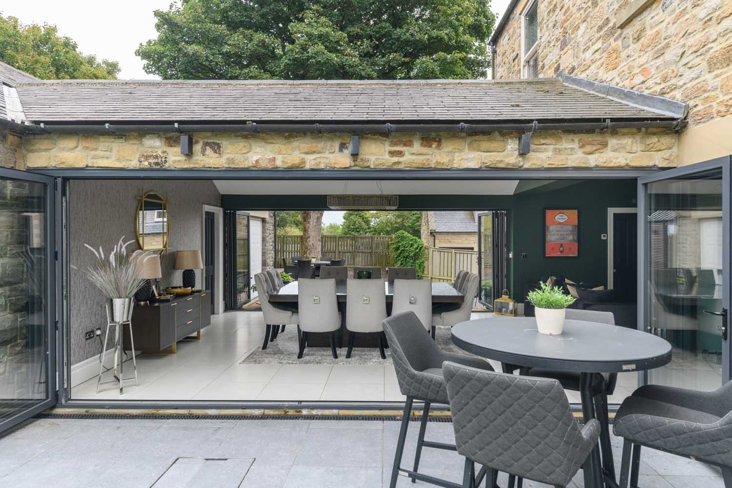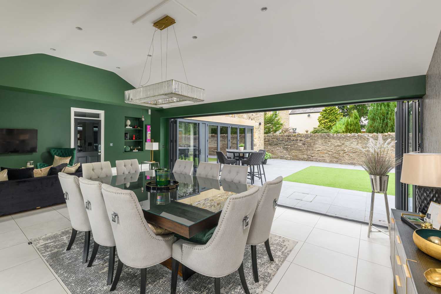 Beyond the kitchen, the house unfolds into the striking new addition, designed as a sequence of light-filled entertaining spaces. The living and dining area is defined by vaulted ceilings and bi-fold doors to both sides, flooding the space with natural light and providing an exceptional setting for indoor-outdoor living. From here, the layout extends to the games room, a conversion of the former detached garage, now complete with a fully equipped bar and another set of bi-fold doors leading to the terrace. Together, these interlinked spaces create a versatile environment for entertaining on any scale, seamlessly connected to the garden.