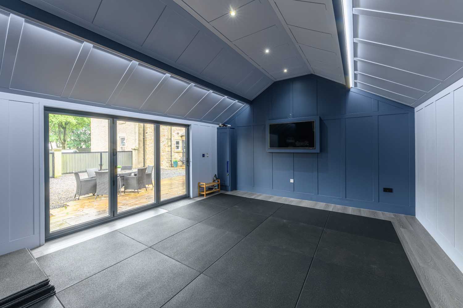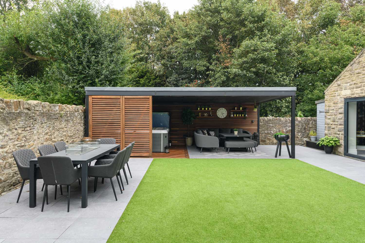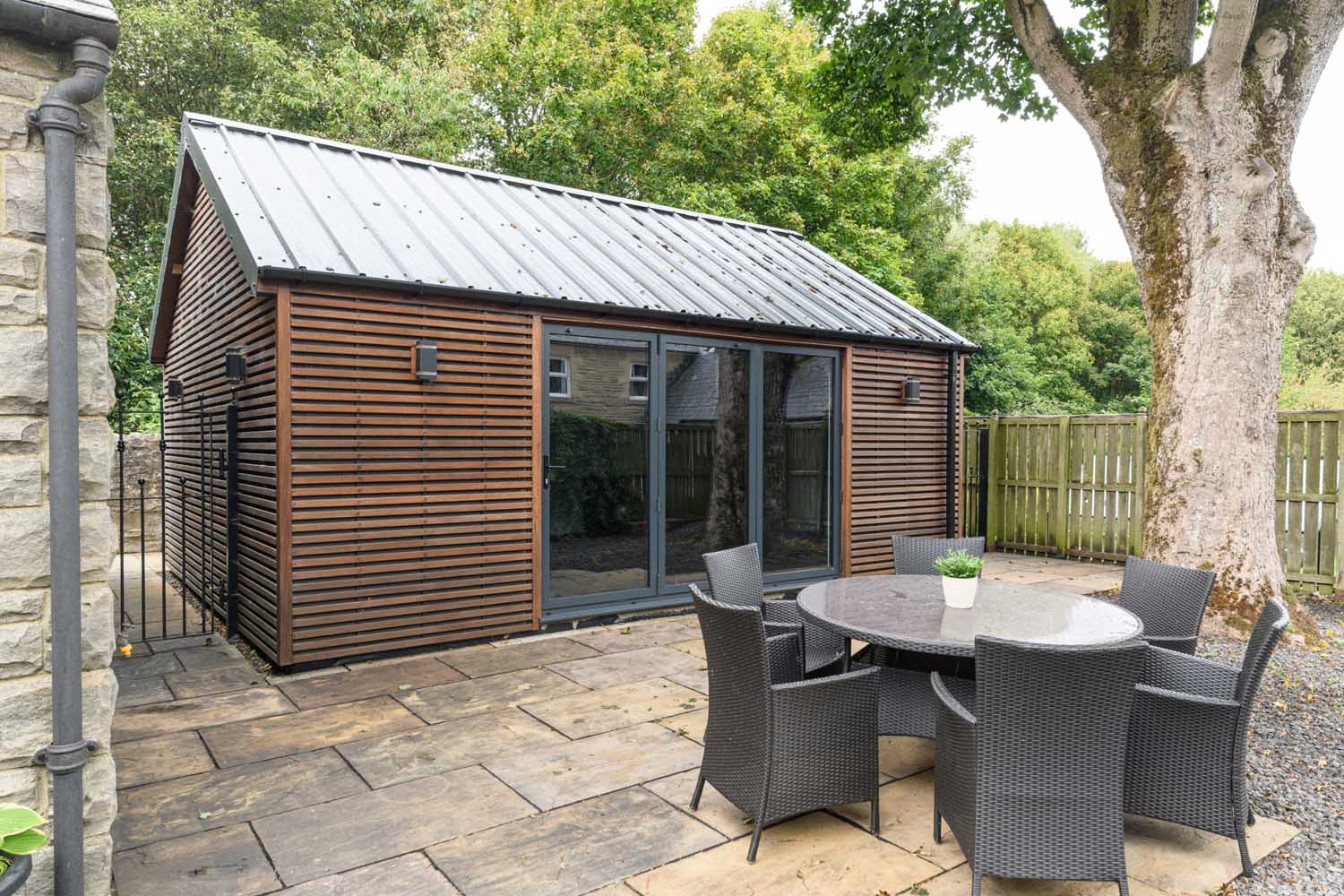 The property is approached through secure electric gates, opening onto a gravelled drive with ample parking and mature trees giving a sense of privacy. To the rear, the garden is designed for both relaxation and entertaining, with extensive porcelain terraces leading directly from the house. An outdoor lounge area with hot tub sits beneath a covered canopy, while a detached garden studio with modern timber cladding offers scope as a gym, office or creative space. The plot is enclosed by traditional stone walling enhancing both privacy and character. Completing the external offering is a single garage, positioned to the side of the games room, providing secure parking or additional storage.