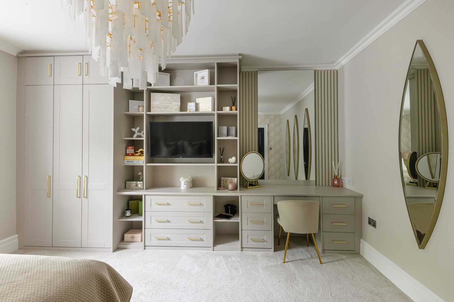 A short flight of tiered steps leads to a separate level, where a fully fitted dressing room and an additional study provide valuable space for home working and everyday practicality. The dressing room is beautifully appointed with bespoke cabinetry, a built-in dressing table and a cushioned window seat, creating a bright and practical space designed for everyday ease