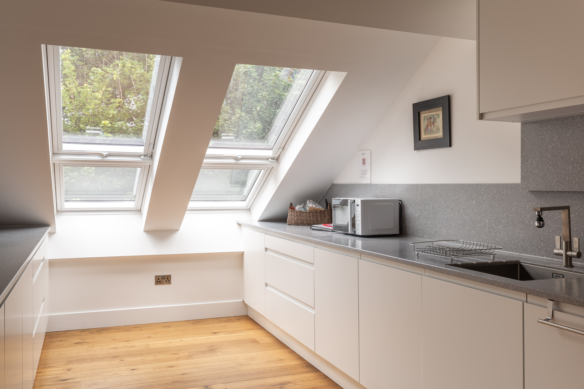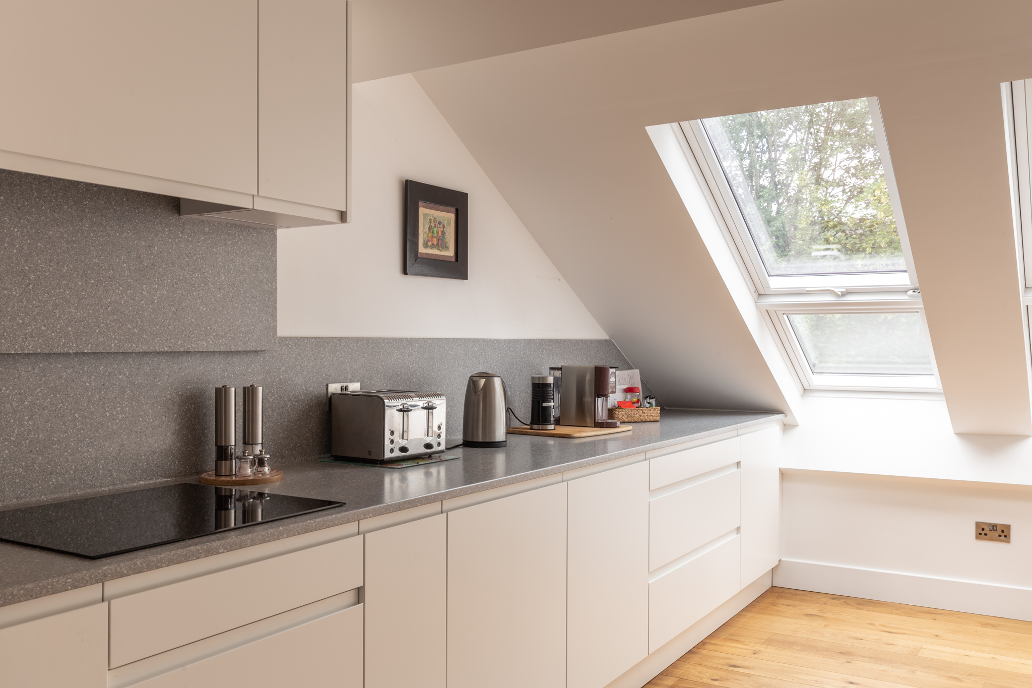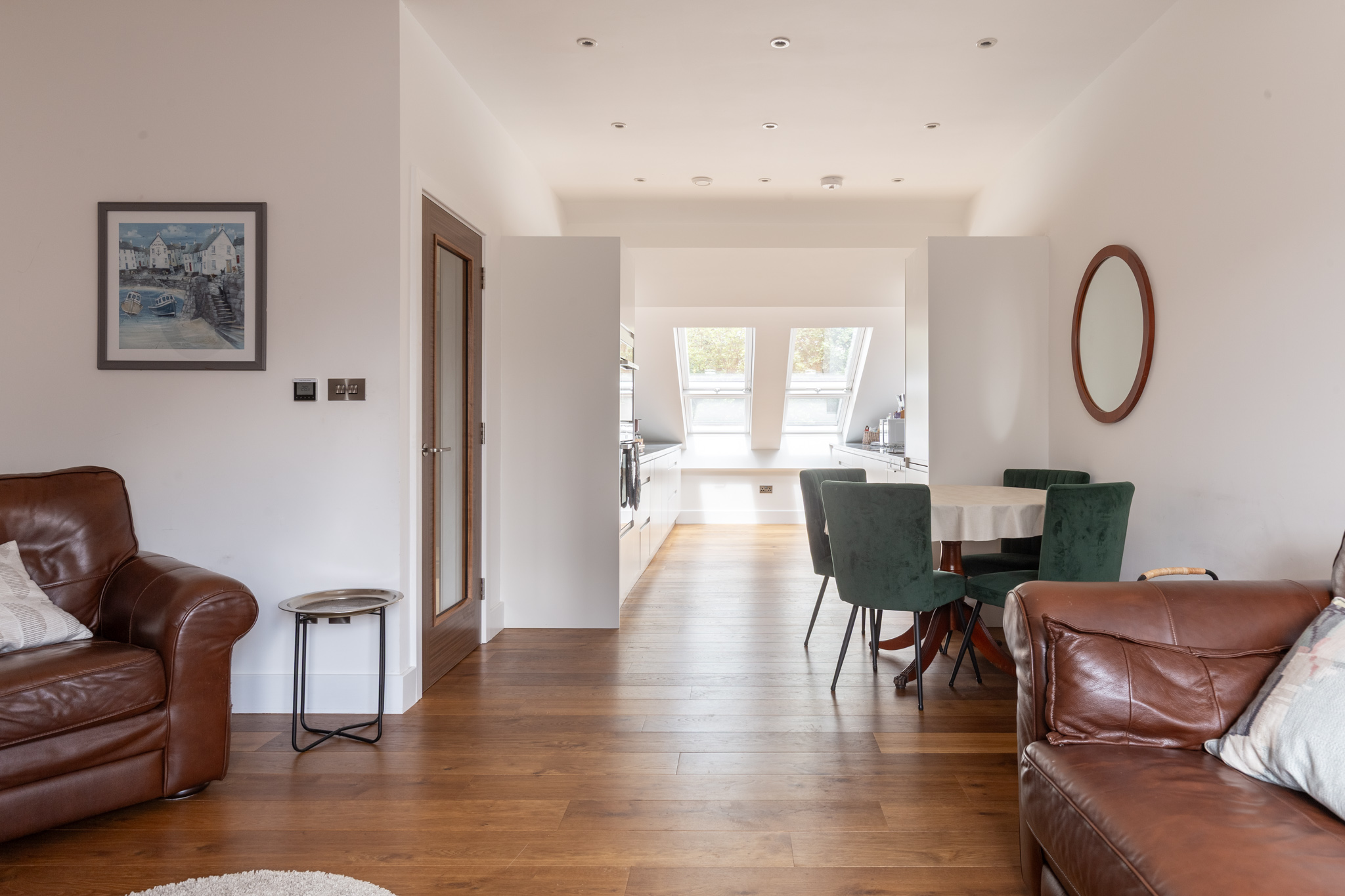 At its centre, the open-plan kitchen, dining and living area spans the depth of the apartment, with natural light cascading through a series of striking pitched roof windows. The kitchen is fitted with sleek handleless cabinetry, quartz worktops and integrated Neff appliances, including an induction hob, oven, microwave, extractor fan, fridge, separate freezer and dishwasher. Underfloor heating in this space can be controlled remotely via an app, offering comfort and convenience. A relaxed dining area and comfortable sitting zone complete the main living space, which is equally suited to entertaining or everyday living.