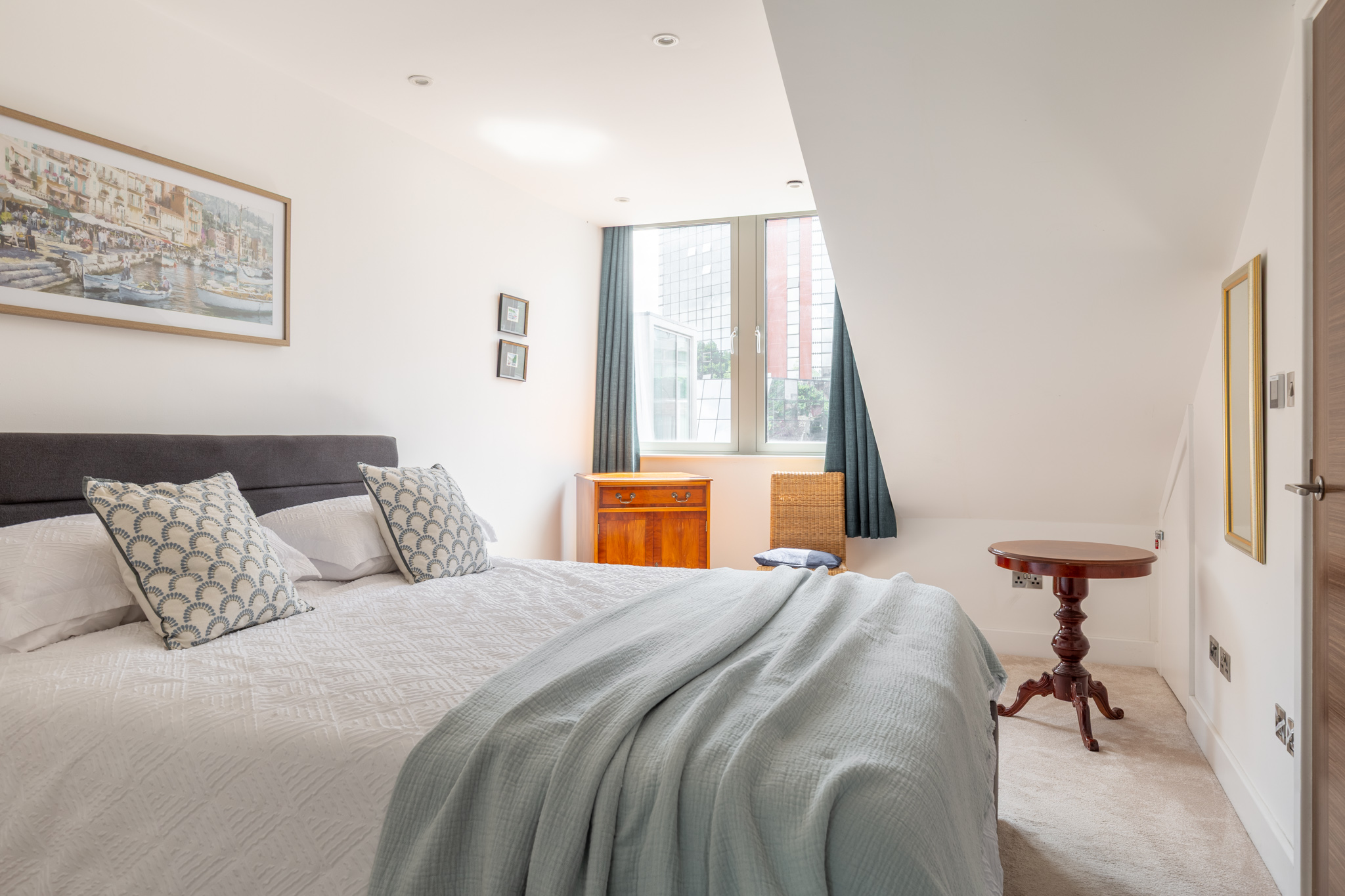 The apartment features three well-proportioned double bedrooms, each thoughtfully arranged to maximise privacy and comfort. The principal bedroom includes a modern en-suite shower room, with underfloor heating controllable by app, and access to useful eaves storage. The remaining two bedrooms are served by a separate heating system, also app-controlled, and a second, similarly appointed shower room with underfloor heating. Both bathrooms feature contemporary tiling, rainfall shower heads and quality fittings, creating a calm, understated aesthetic.