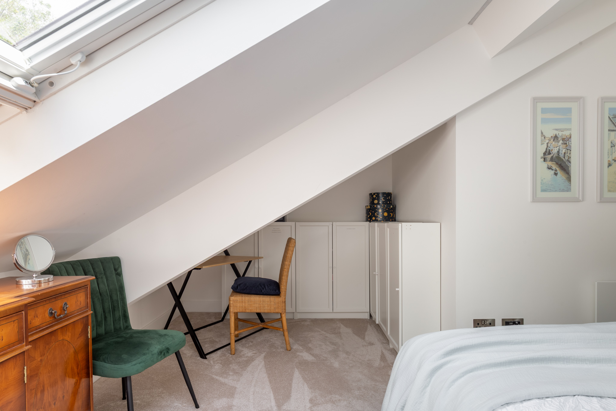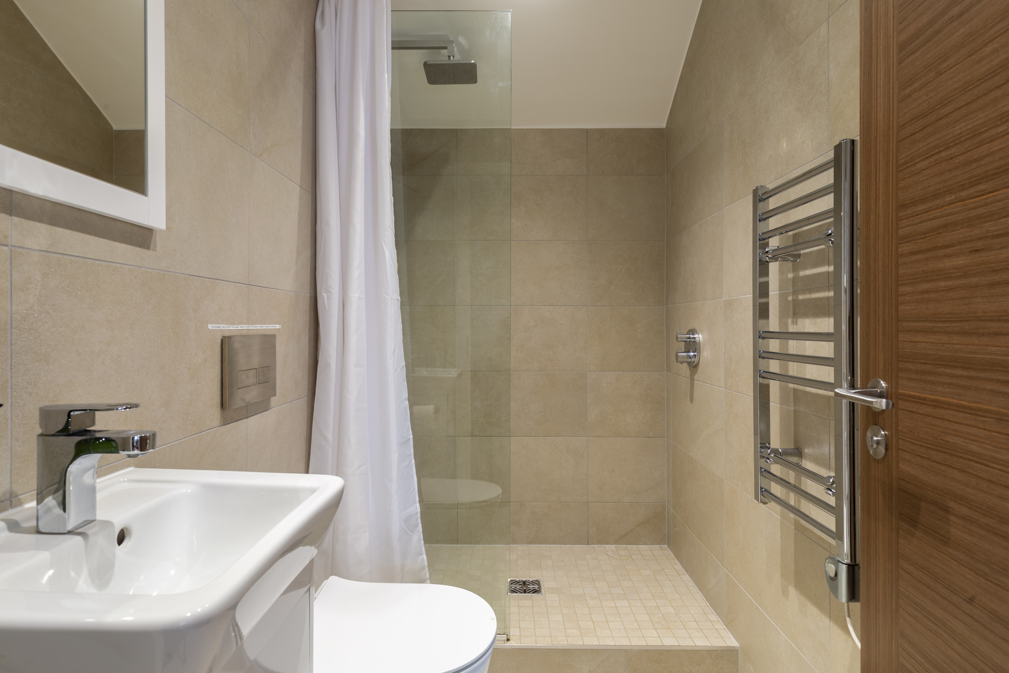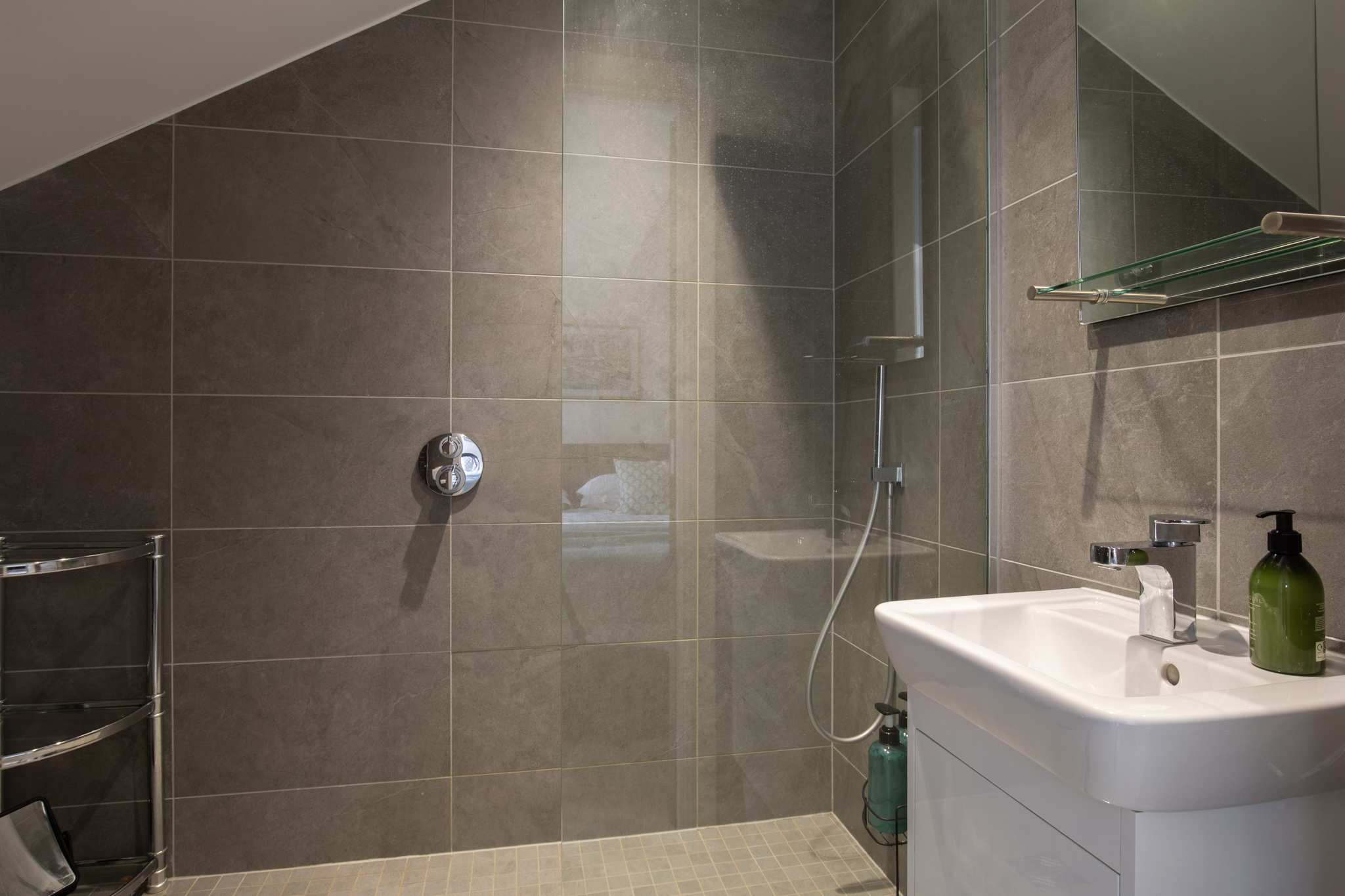 The apartment features three well-proportioned double bedrooms, each thoughtfully arranged to maximise privacy and comfort. The principal bedroom includes a modern en-suite shower room and access to useful eaves storage, while the remaining two bedrooms are served by a second, similarly appointed shower room. Both bathrooms are finished with contemporary tiling, rainfall shower heads and quality fittings, and include underfloor heating controllable via an app. The bedrooms are served by a separate heating system, also app-controlled, for added convenience.