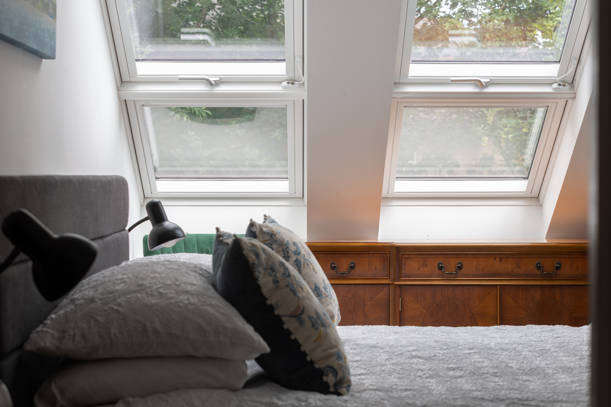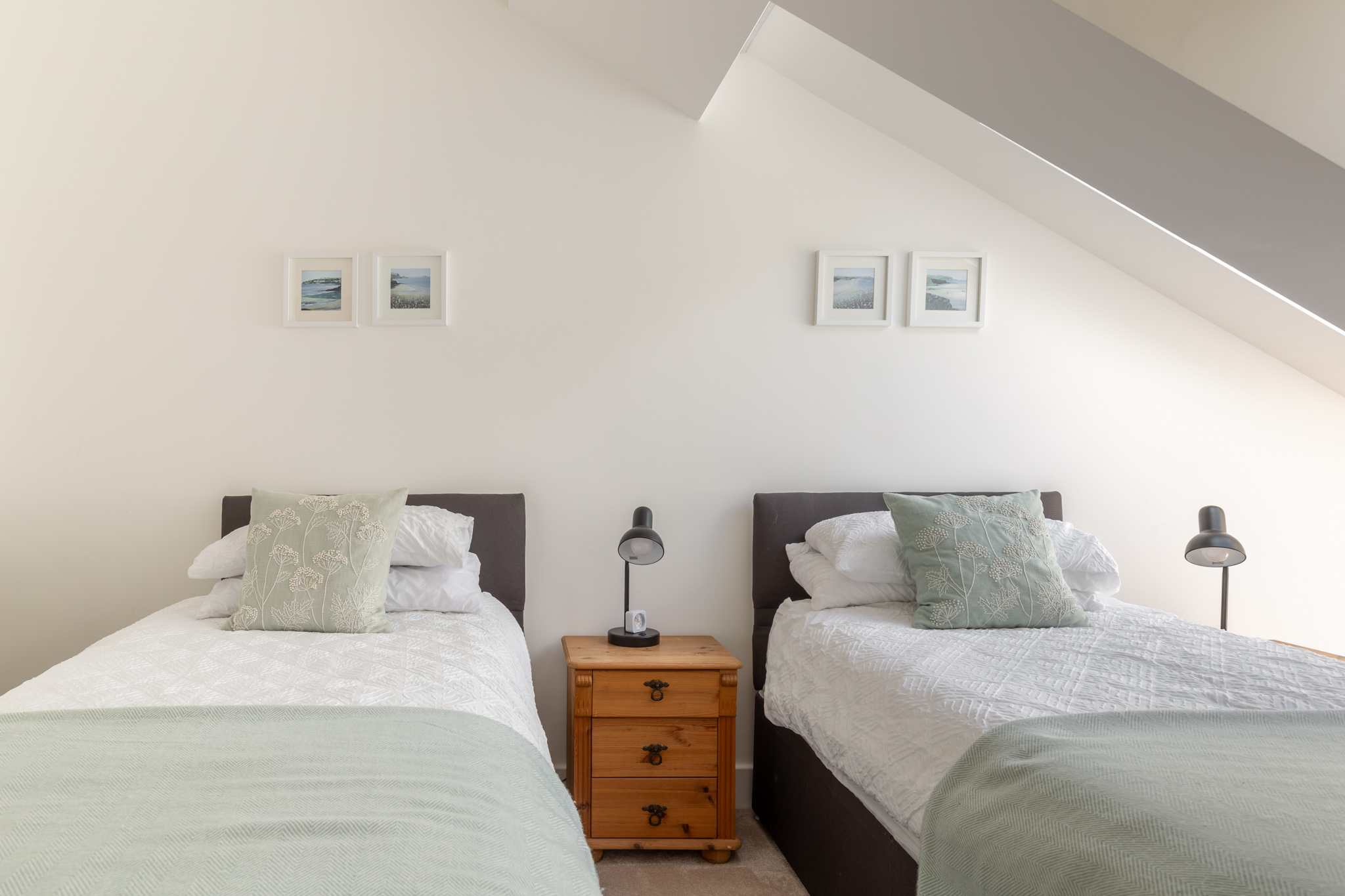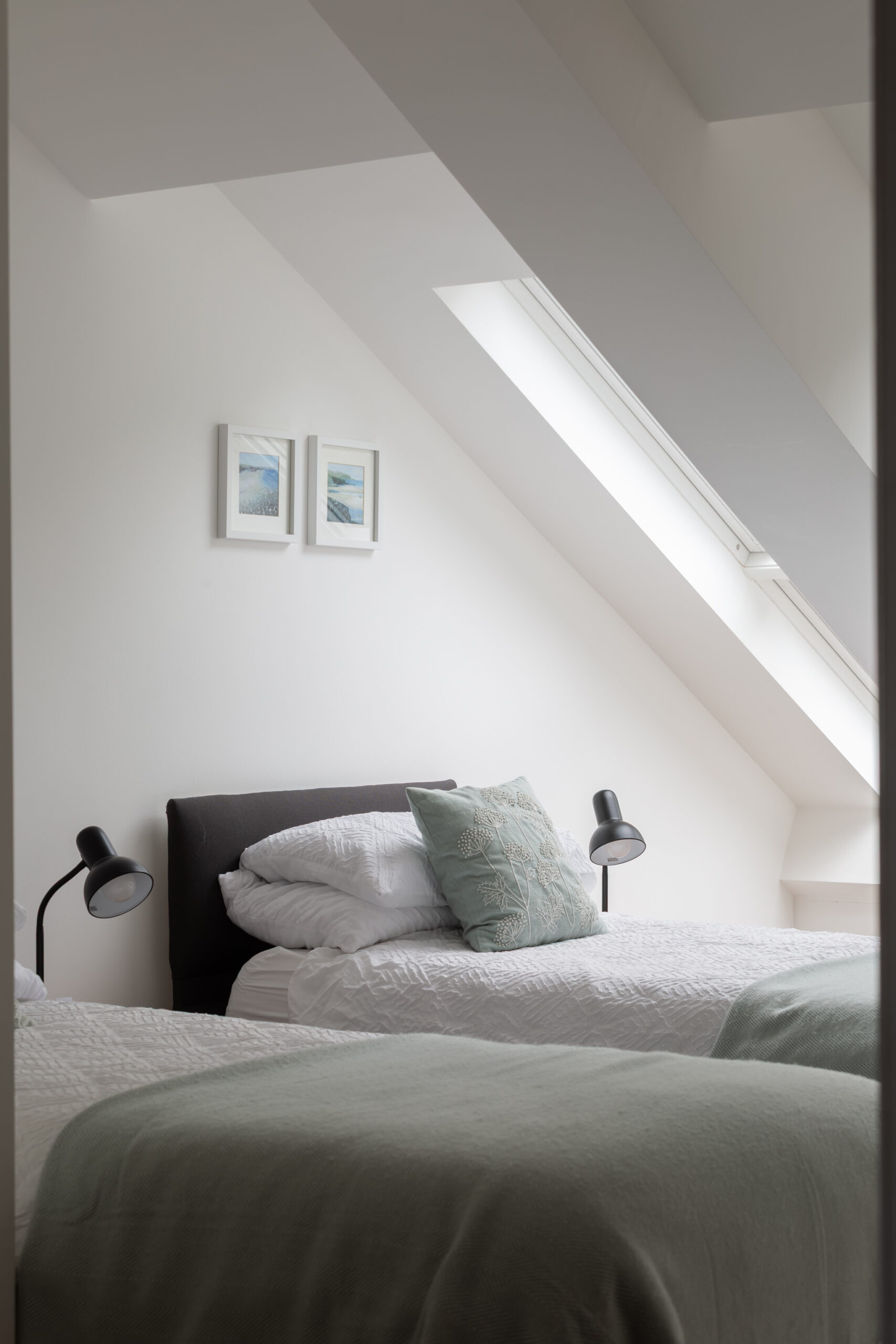 The apartment features three well-proportioned double bedrooms, each thoughtfully arranged to maximise privacy and comfort. The principal bedroom includes a modern en-suite shower room and access to useful eaves storage, while the remaining two bedrooms are served by a second, similarly appointed shower room. Both bathrooms are finished with contemporary tiling, rainfall shower heads and quality fittings, and include underfloor heating controllable via an app. The bedrooms are served by a separate heating system, also app-controlled, for added convenience.