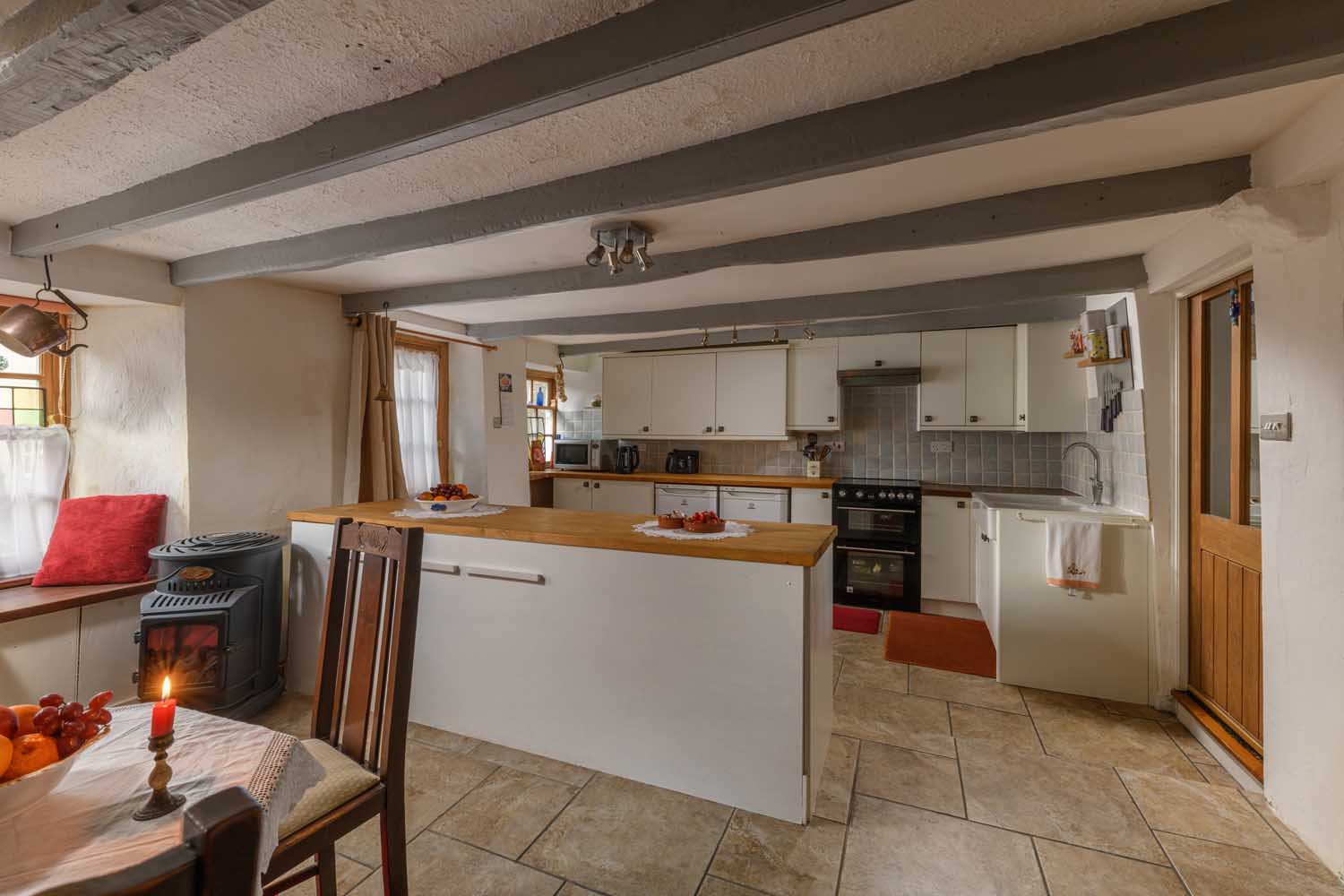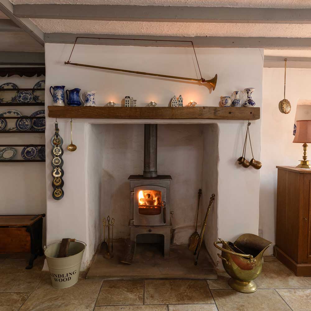 The hub of the home is a spacious kitchen and dining area that is rich in character. Exposed beams, a wood-burning stove, and an original ‘salt storage’ recess, identified by the Vernacular Architects Association, add to the room’s authenticity. The kitchen itself is fitted with an array of base and wall cabinetry, complemented by warm timber worktops. A central island provides additional preparation space and divides the cooking and dining areas. A side door leads to a wood-panelled internal lobby, complete with a cosy window seat and a staircase leading to the upper floors. Enhancing everyday convenience, the ground floor also benefits from a well-appointed boot room/utility room with storage units, a sink, and plumbing for laundry appliances. Additionally, a convenient cloakroom/WC is adjacent to the dining room.