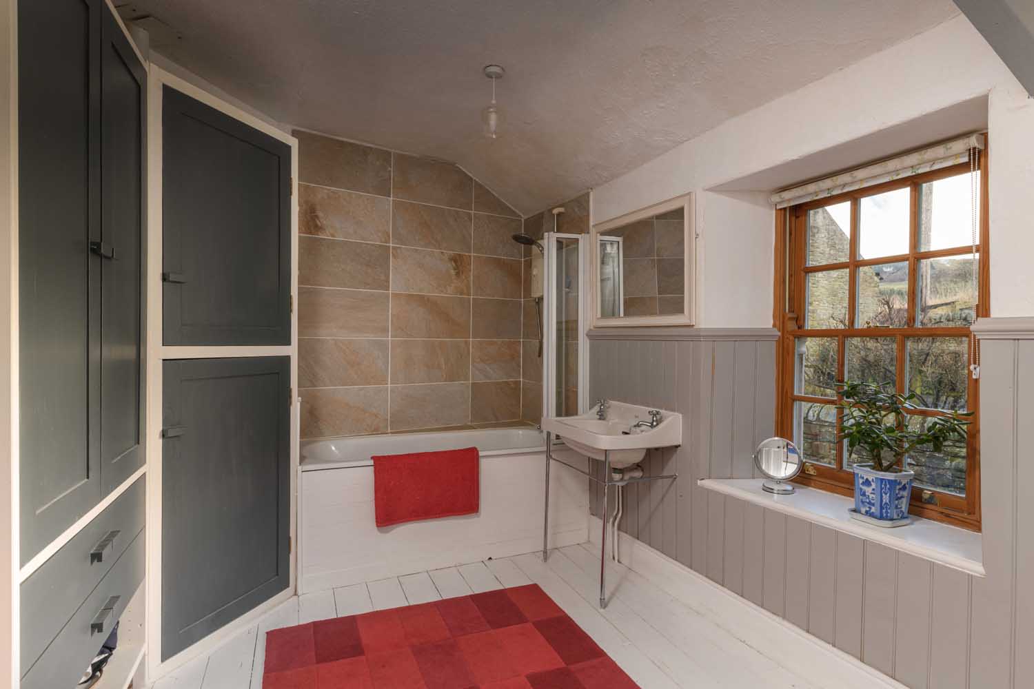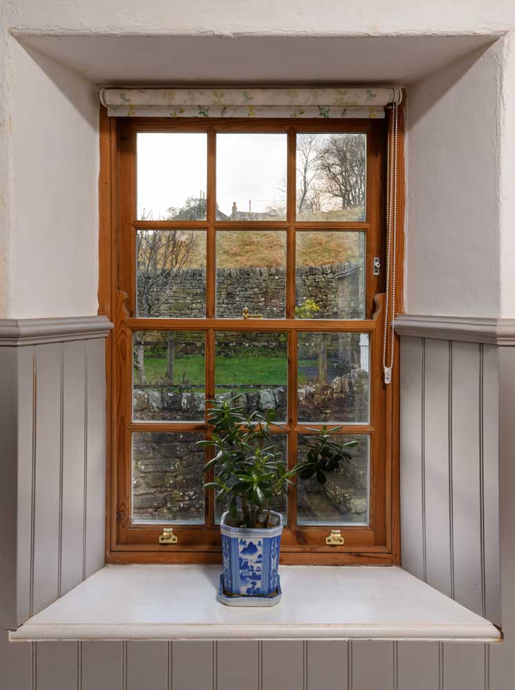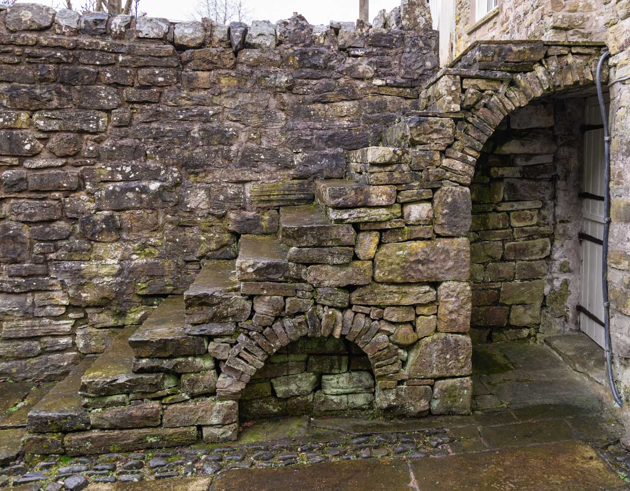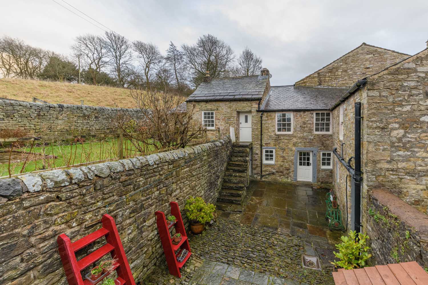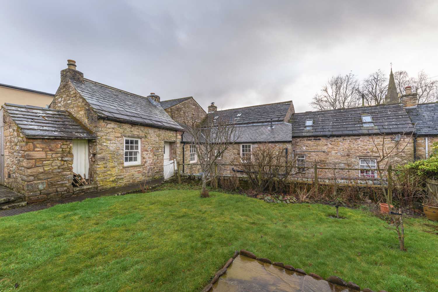 To the rear, the property opens onto a delightful part-walled garden framed by original Cumbrian stone. The outdoor space is arranged over two levels: a lower courtyard with some original cobbled paving and an upper garden accessed via a stone staircase. The latter enjoys a patio, lawn, and a variety of mature trees, fruit bushes, and shrubs. South-facing sections of the garden allow for plenty of natural light, while beyond the boundary, rolling meadows stretch towards the hills of Mount Hooley, providing an ever-changing rural backdrop. A traditional stone-built outhouse offers valuable storage for outdoor equipment.