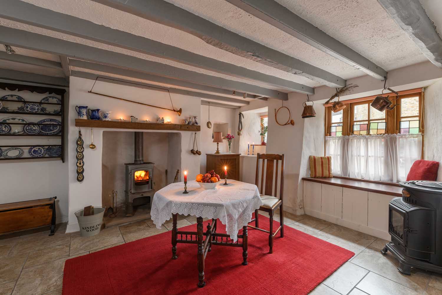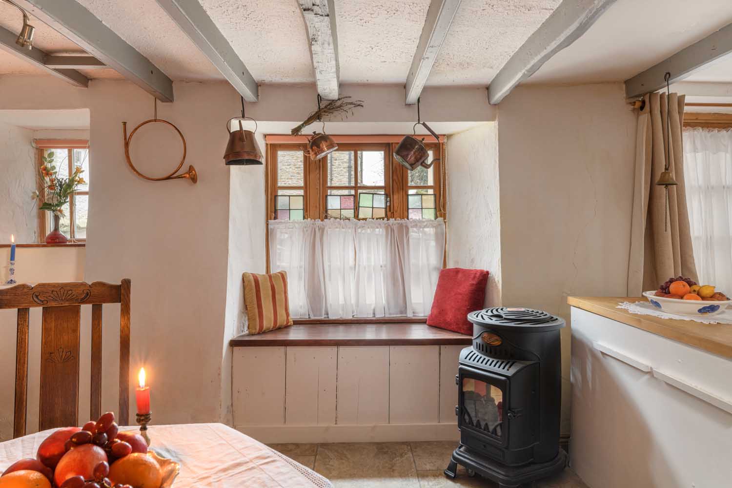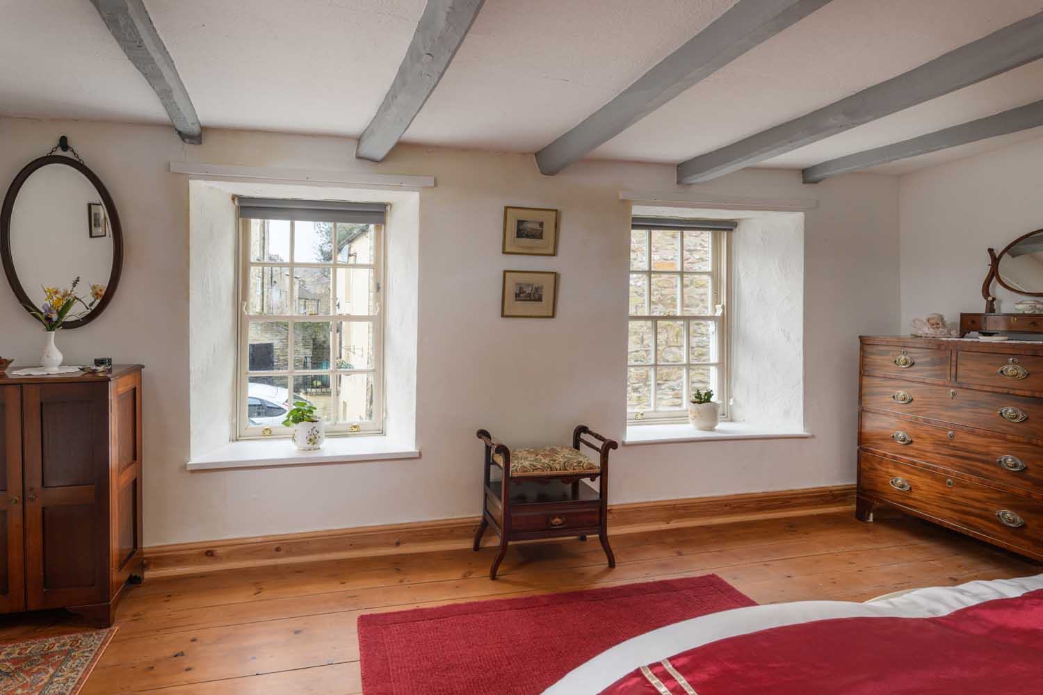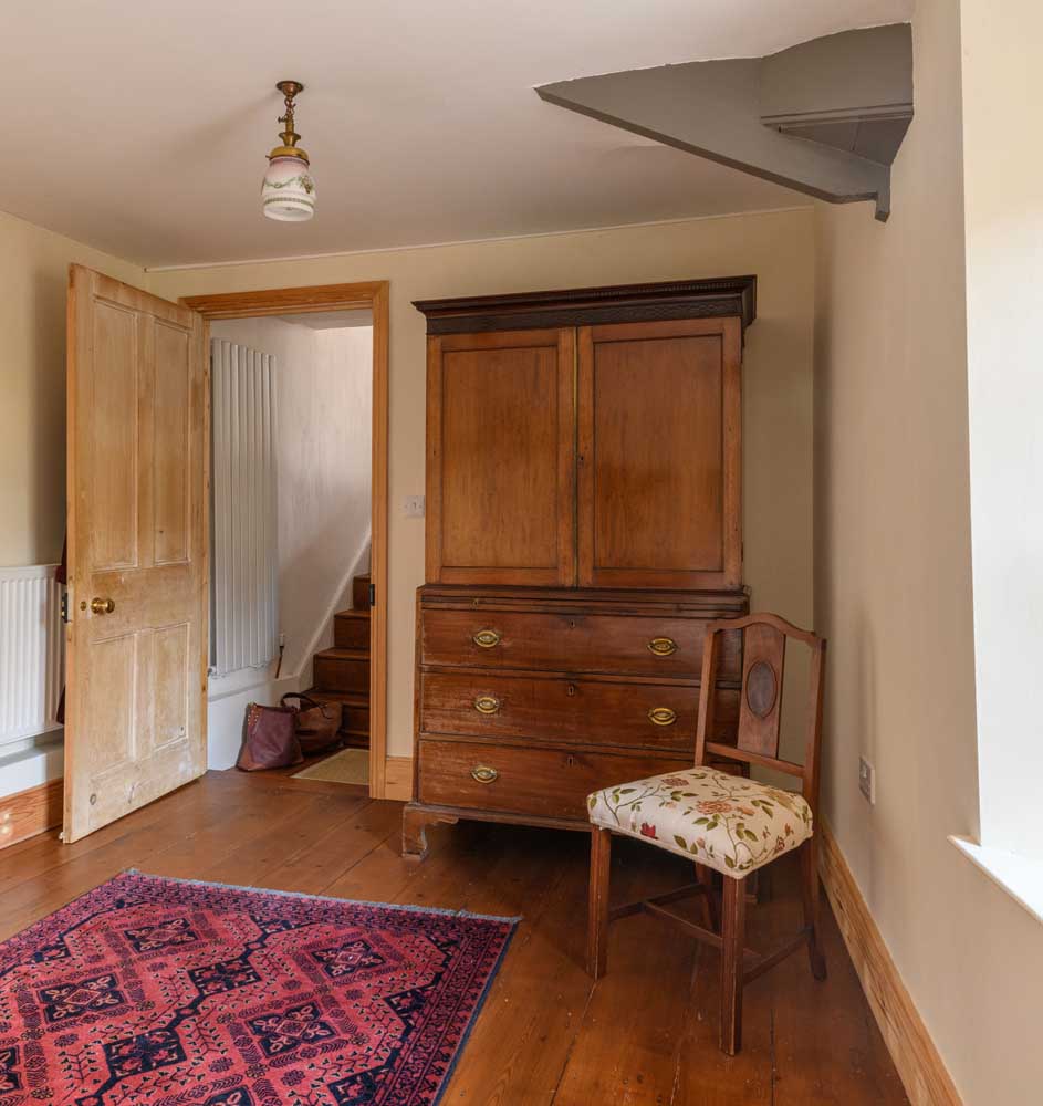 Set behind an attractive whitewashed façade with contrasting stone accents, the house enjoys a charming symmetry, enhanced by double-glazed Georgian sash windows and traditional half-glazed timber doors. An internal side passage, originally designed for leading horses through the property, provides direct access to the rear courtyard. Inside, the home unfolds over three floors, where exposed beams, original sanded and waxed floorboards, and carefully preserved architectural details reflect its heritage.