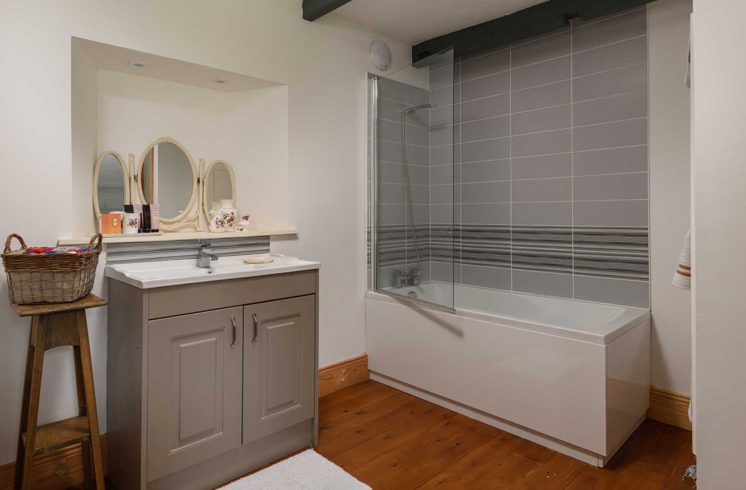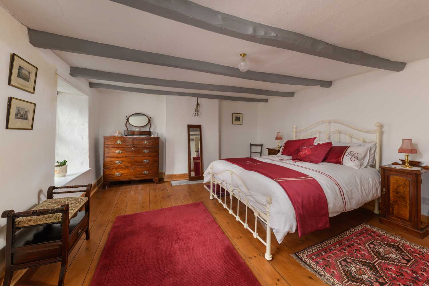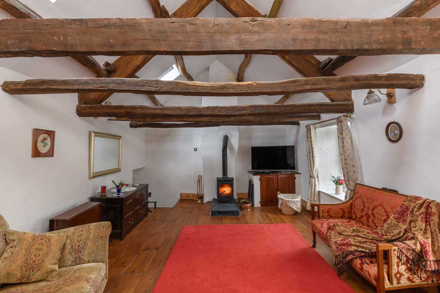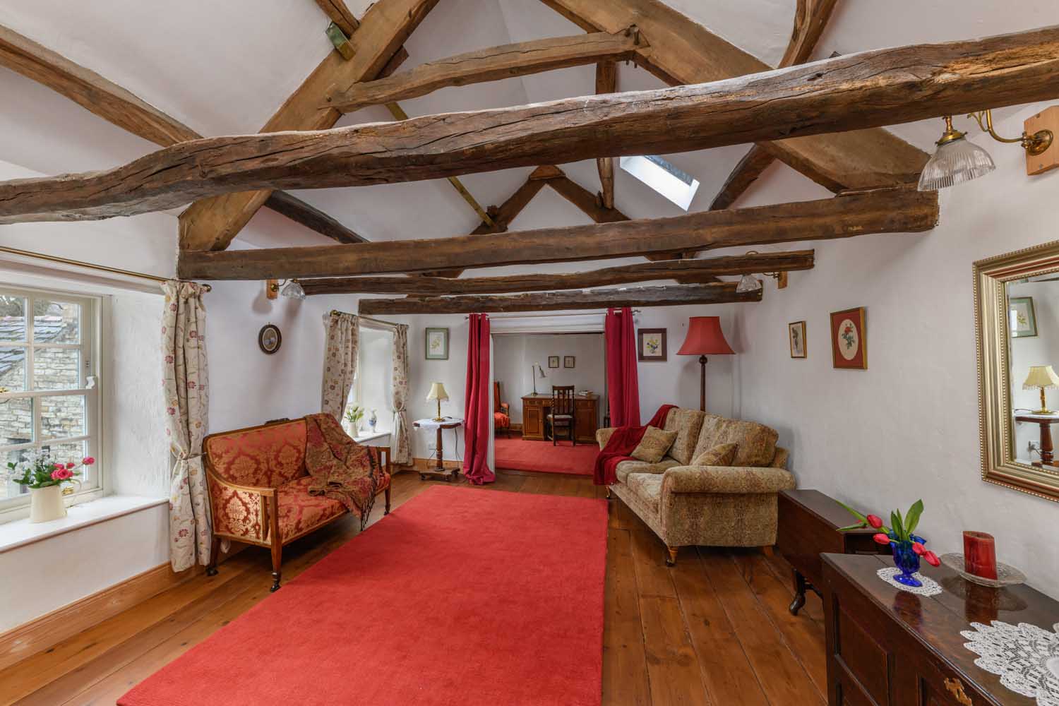 The reception rooms are equally atmospheric. The main sitting room, located on the upper floor, is a breathtaking space with a vaulted ceiling supported by magnificent, exposed A-frame trusses. This generous yet intimate area with a traditional wood burner, is filled with natural light, creating a comfortable setting for both relaxation and entertaining. An adjoining study or additional snug offers a quieter retreat. The property’s versatile layout ensures flexibility, catering to a range of lifestyle needs.