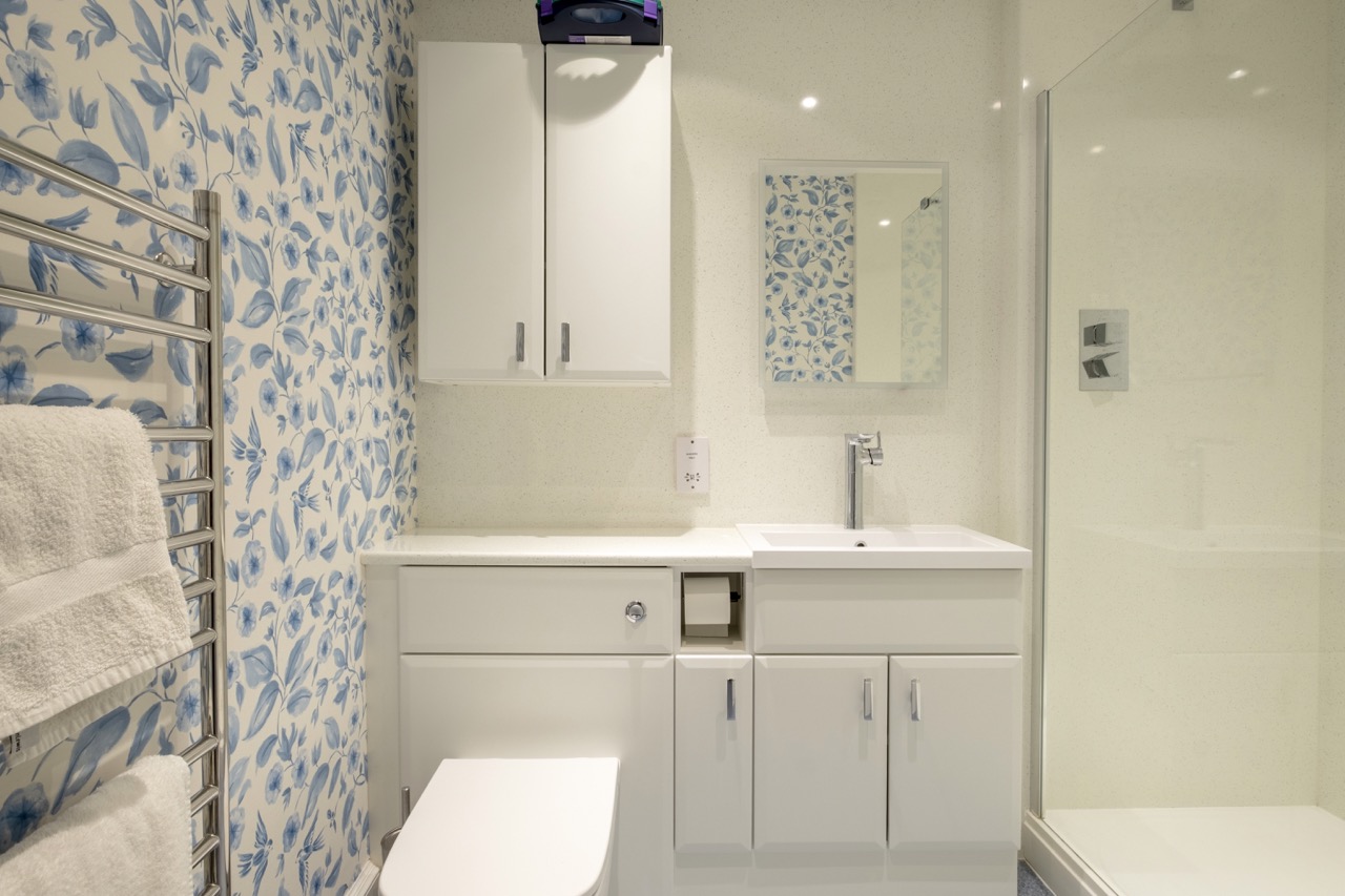 Another room which is beautifully presented with quality furnishings is the principal bedroom, complemented by an impressive selection of fitted wardrobes to maximise hanging and shelving space and also benefitting from a discreet integral fold away office area. The beautifully appointed en-suite bathroom comprises a white suite with bath, wash hand basin set within a vanity unit with illuminated mirror over, heated towel rail and WC with a useful linen cupboard. The guest bedroom is equally impressive with beautiful décor and fitted wardrobes and is served by the adjacent shower room.