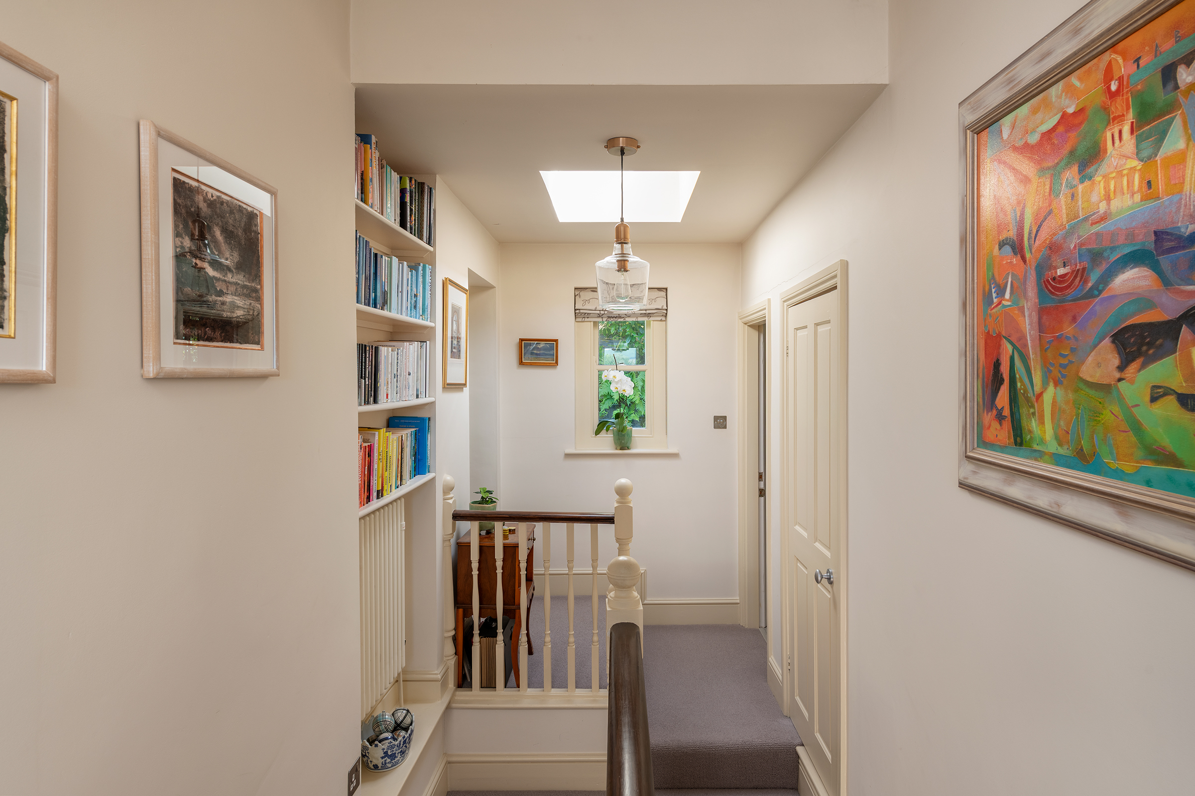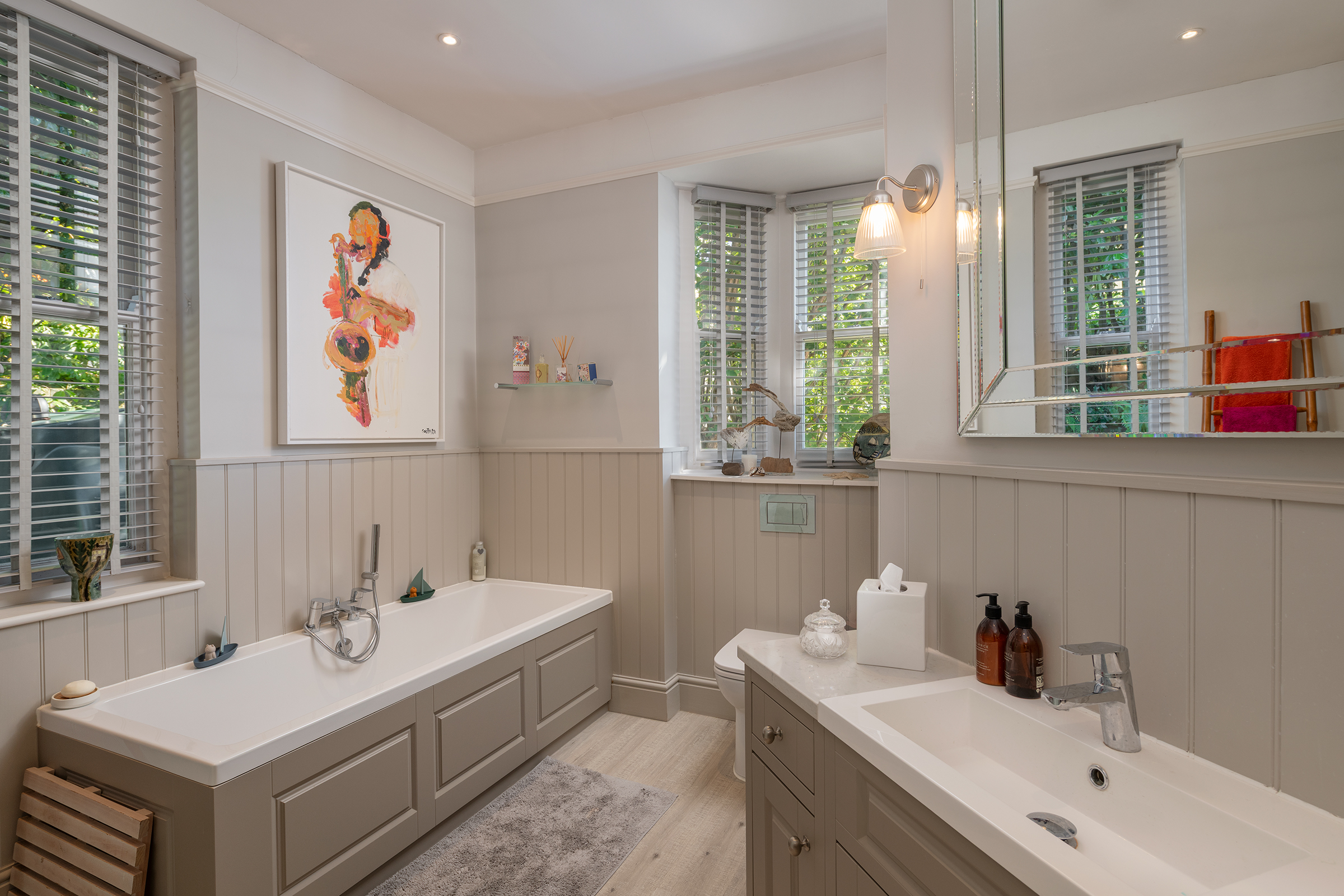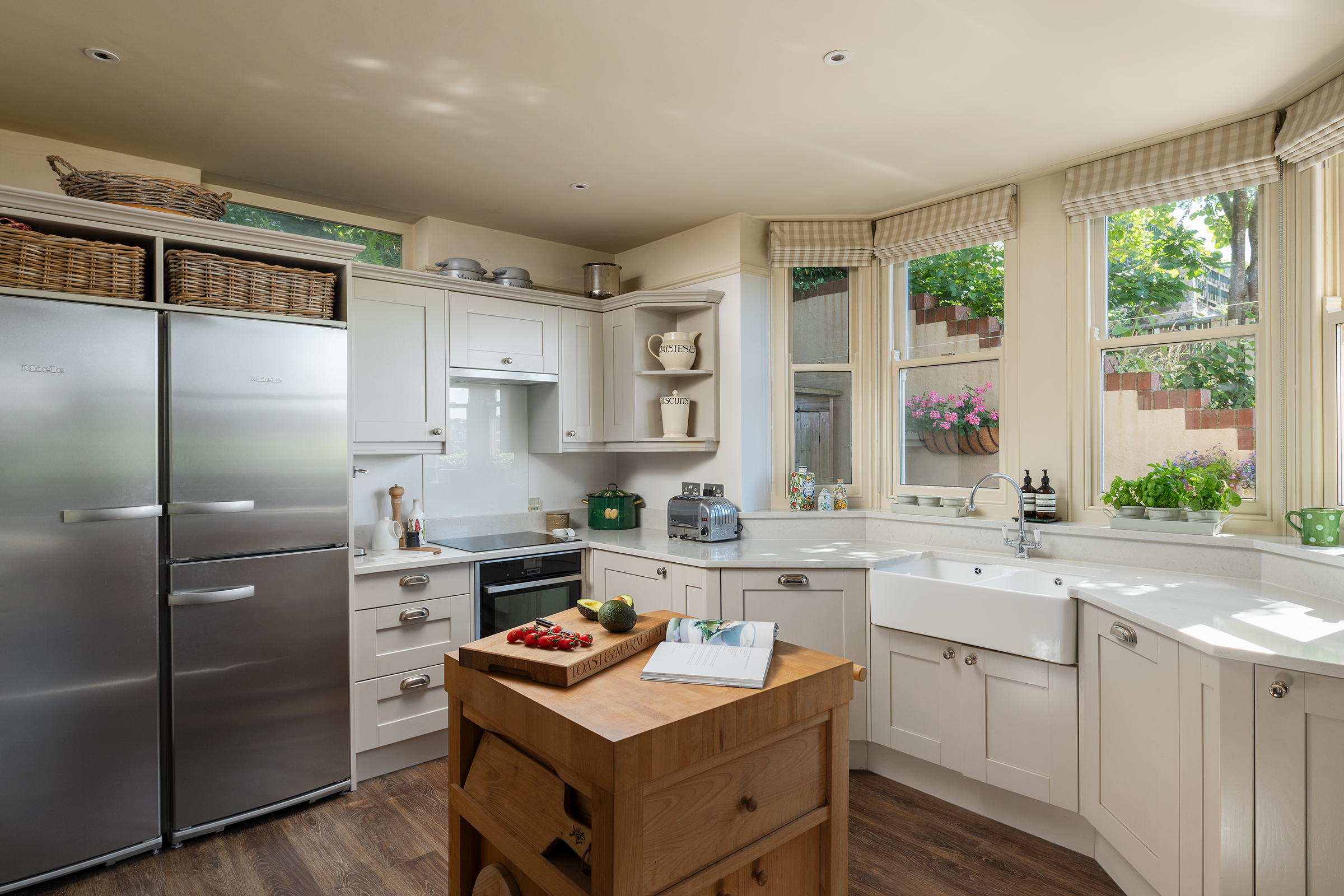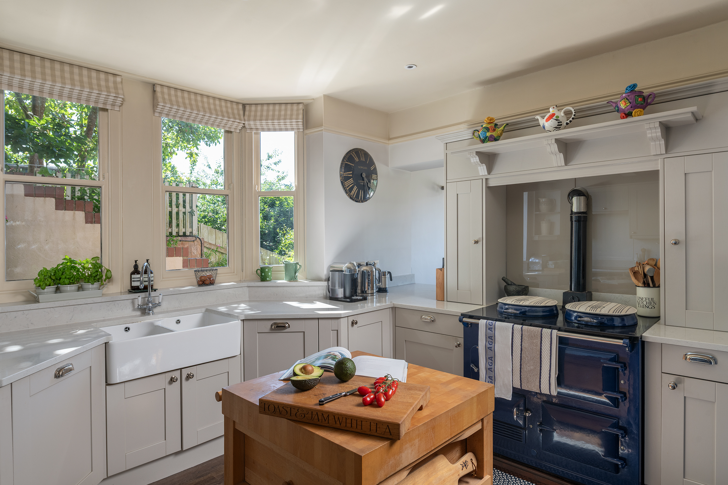 The heart of the home is the Kitchen, which has been sensitively updated to complement the period features. Soft, neutral tones and tactile natural materials create a sense of cohesion and elegance. The Kitchen opens directly into the Dining Room, allowing for effortless flow when cooking and entertaining. This thoughtful connection between spaces adds to the home’s welcoming, sociable atmosphere.