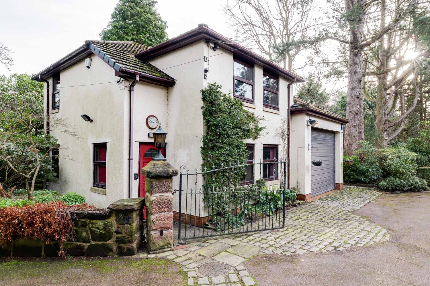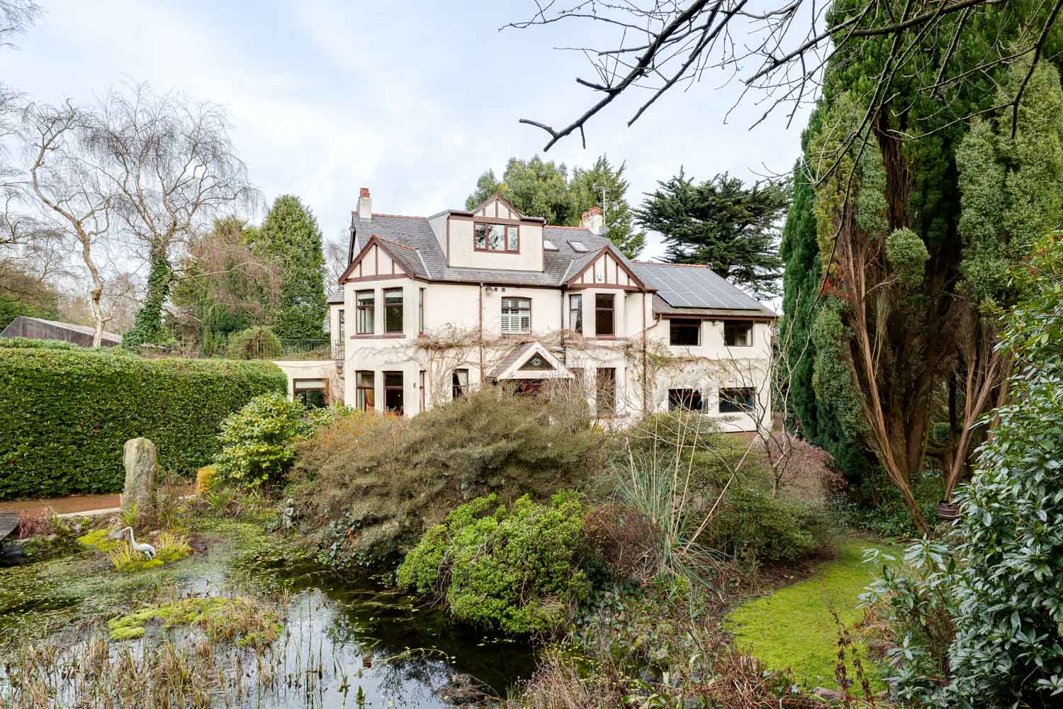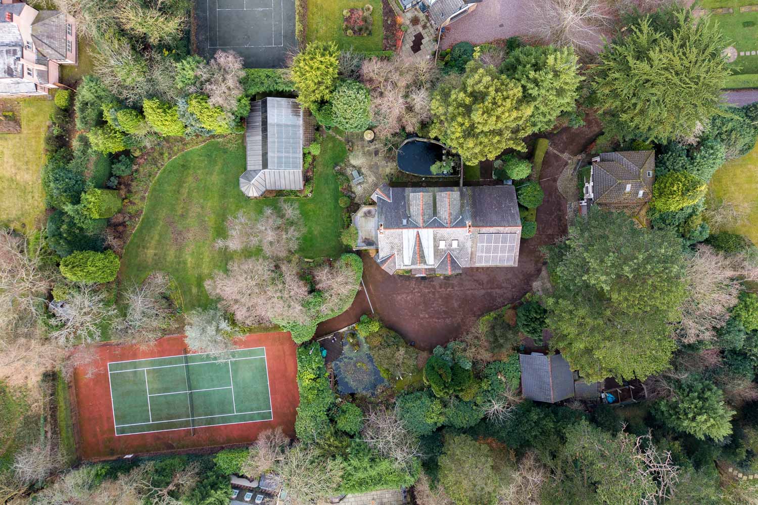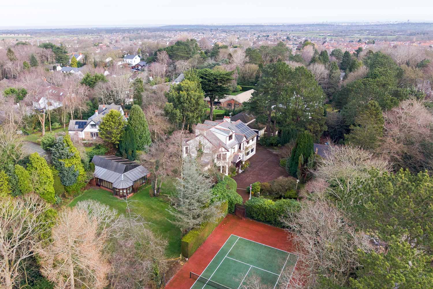 "A substantial country property moments from Heswall’s vibrant centre, with exceptional leisure facilities including a swimming pool, sauna and full-size tennis court set within private grounds."