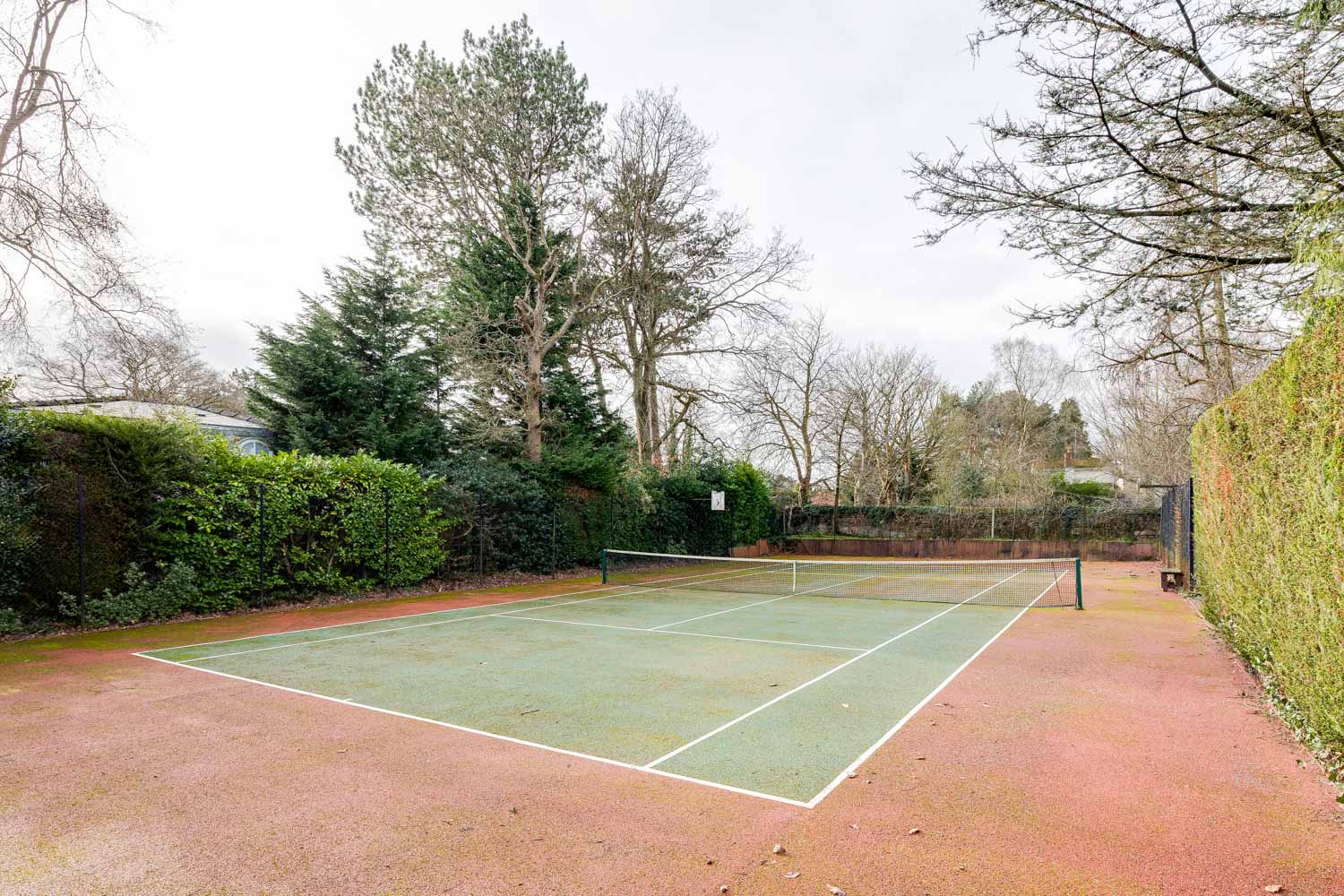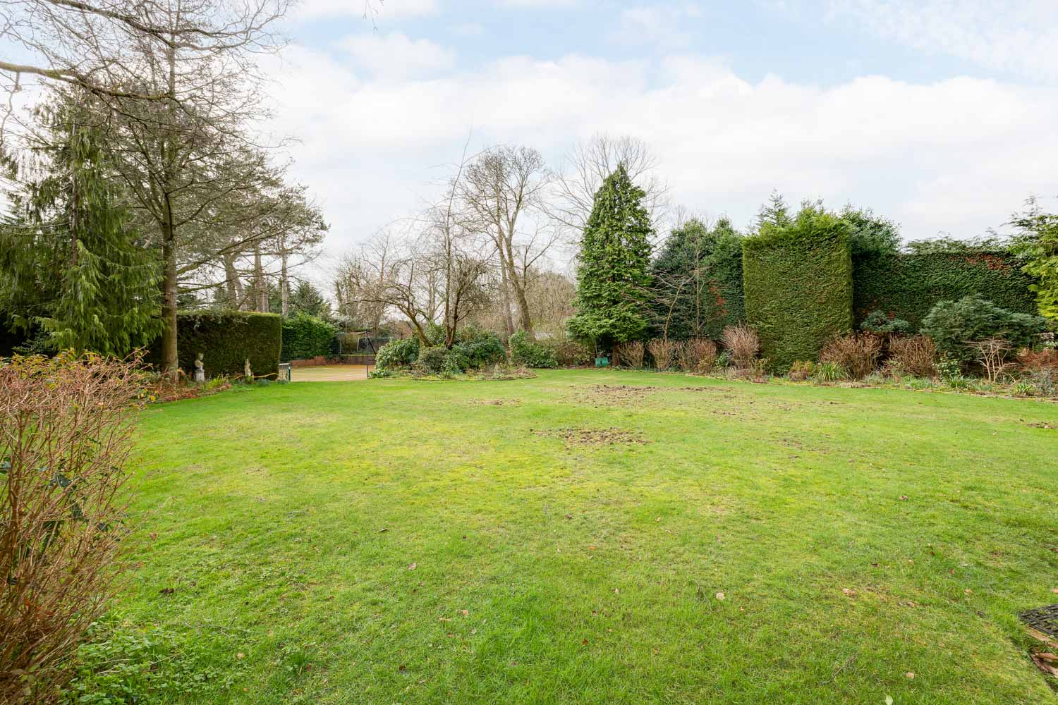 Beyond, a full size tennis court sits discreetly within the landscape, ready for competitive matches or relaxed rallies in the summer sun. The grounds themselves are beautifully maintained, with expansive lawns, patio areas for outdoor dining and established planting that ensures year round interest.