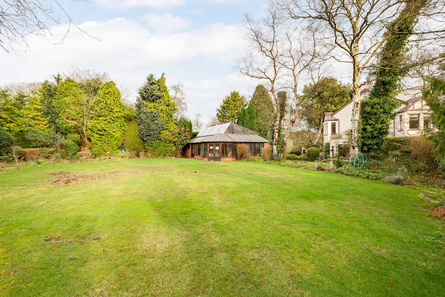 A sweeping driveway draws you through beautifully established gardens towards the house, a substantial bespoke oak car port and a detached garage providing both practicality and architectural charm. The sense of arrival is immediate. Mature trees and deep lawns create a natural boundary, giving the estate a quietly secluded atmosphere that feels worlds away from everyday life.