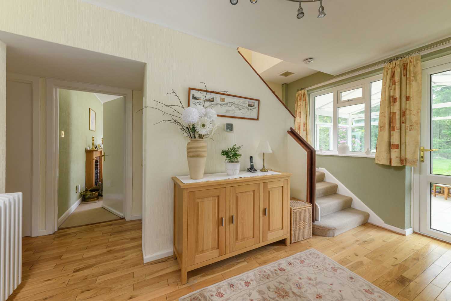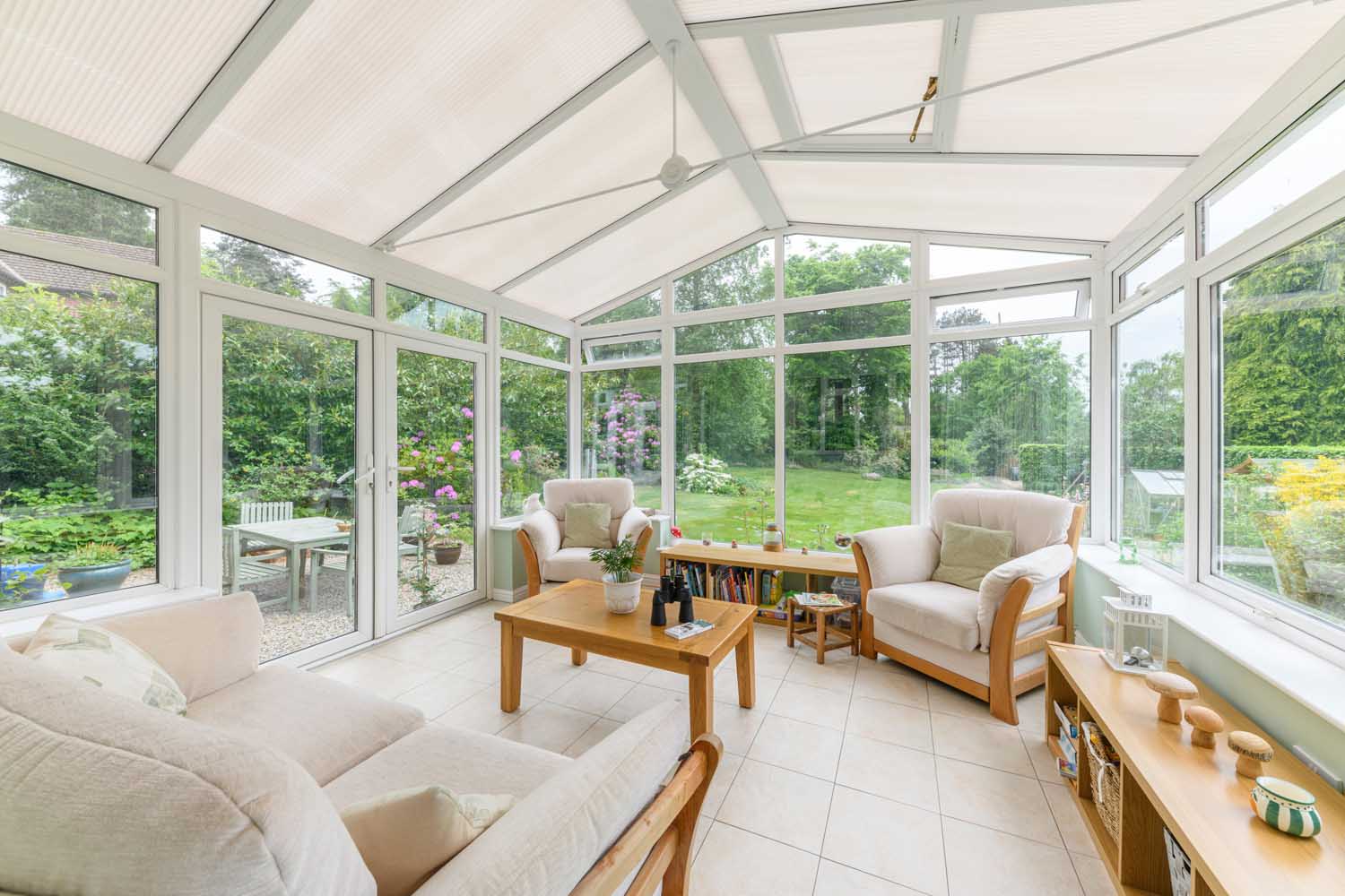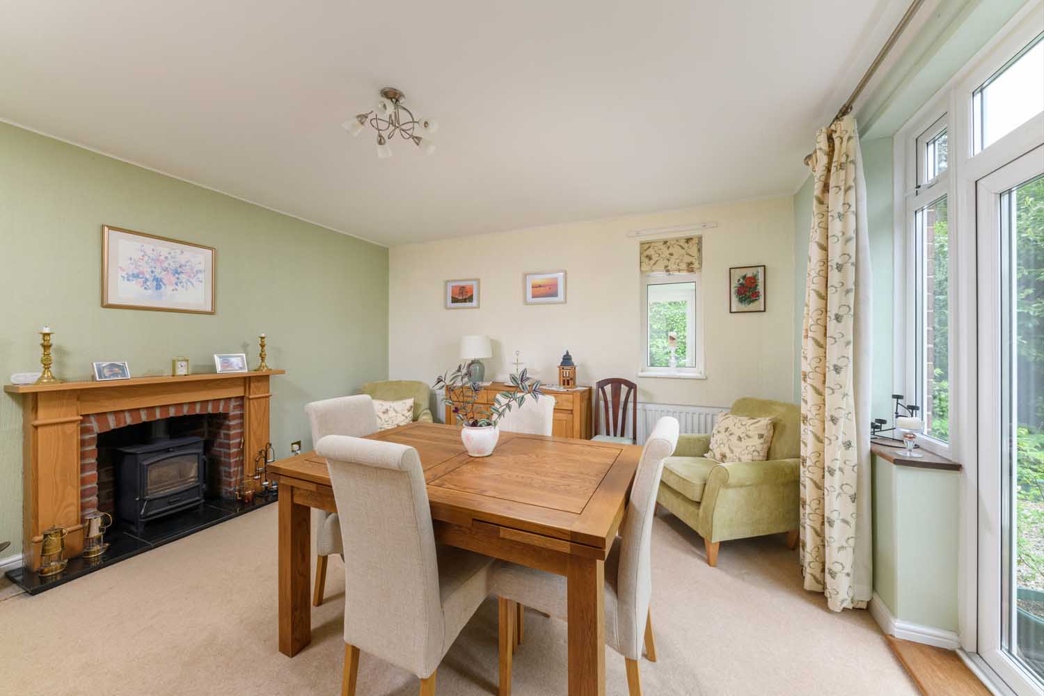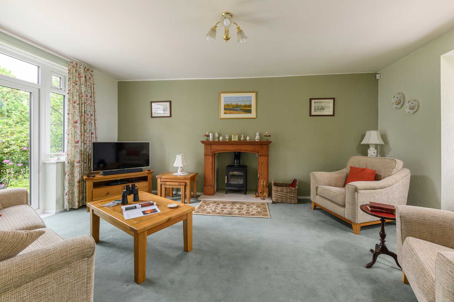 The décor and furnishings in the dining room are similarly well-kept, providing an inviting space to entertain guests or family. Much like the sitting room, the dining room features rear facing French doors and a log burner, providing a delightful influx of natural light in the summer and a cosy source of warmth and comfort during the winter. To the rear of the property, there is a large conservatory overlooking the spacious garden for idle afternoons in the summer.