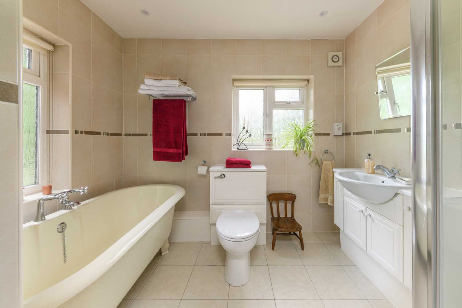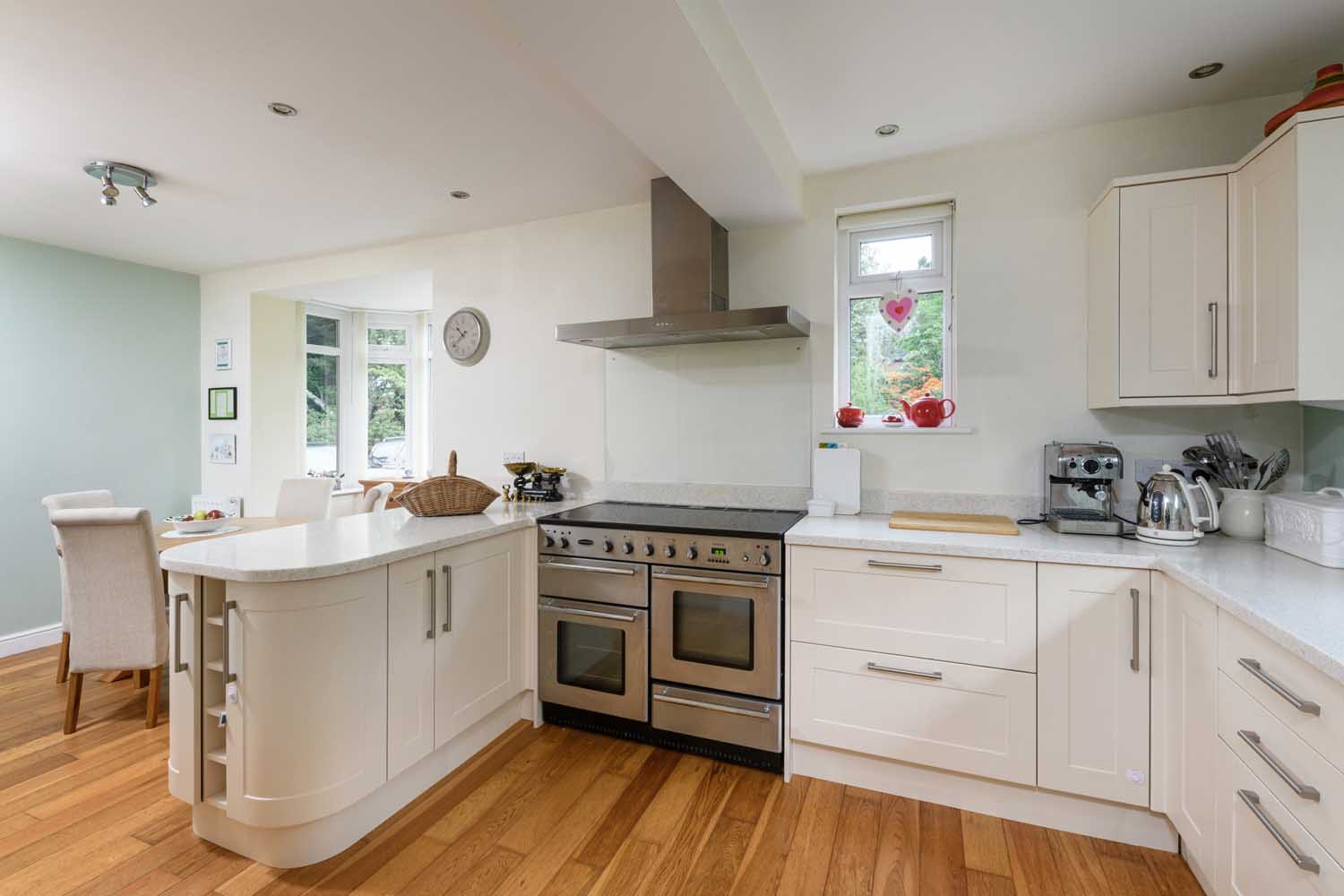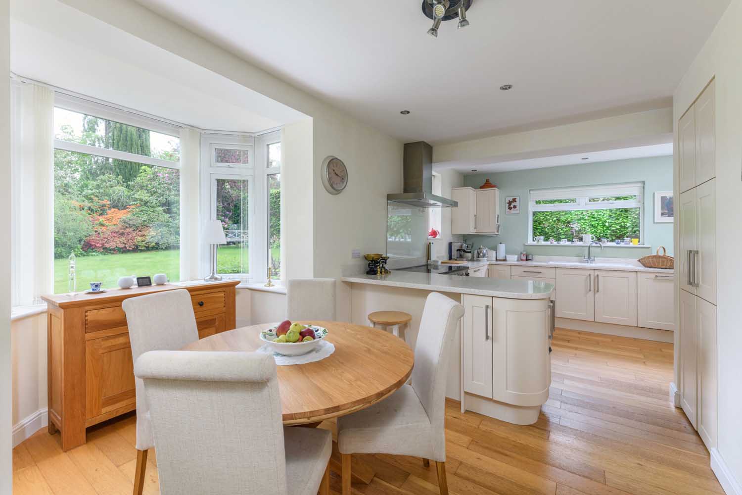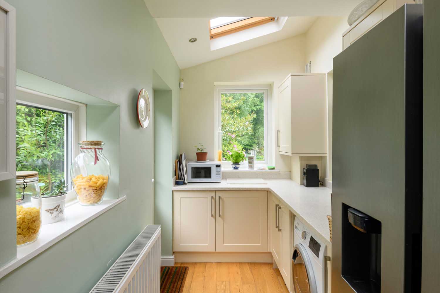 The kitchen and dining room are situated across the ground-floor hallway, passing via a refurbished WC and coats cupboard/storage space. The kitchen is well-equipped, spacious, and brightly lit, owing to a relatively recent renovation that expanded the space to incorporate an enlarged utility area and introduced a south facing sky-lantern for additional natural light.