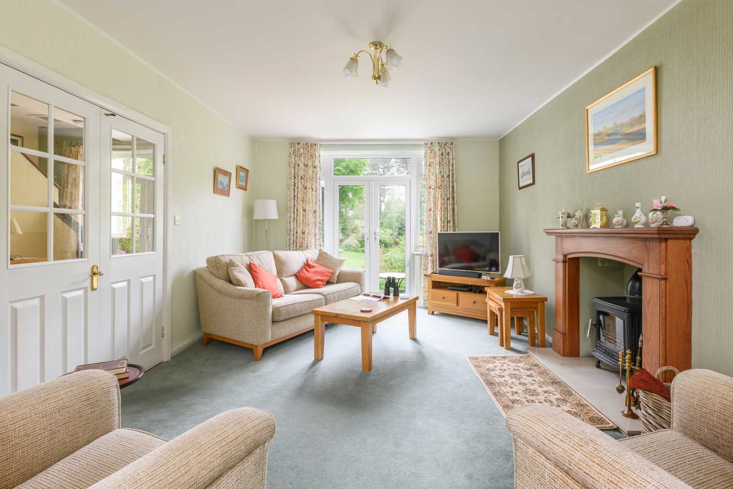The property has been diligently maintained by its current owners and interior fixtures and décor have endured admirably. The main sitting room on the ground floor is comfortable and inviting, with a log burner set in an attractive feature fireplace. French doors offer a spacious south-facing view of the rear garden, while both the sitting room and kitchen receive a considerable amount of light and space from bay windows recently installed on the front of the property.