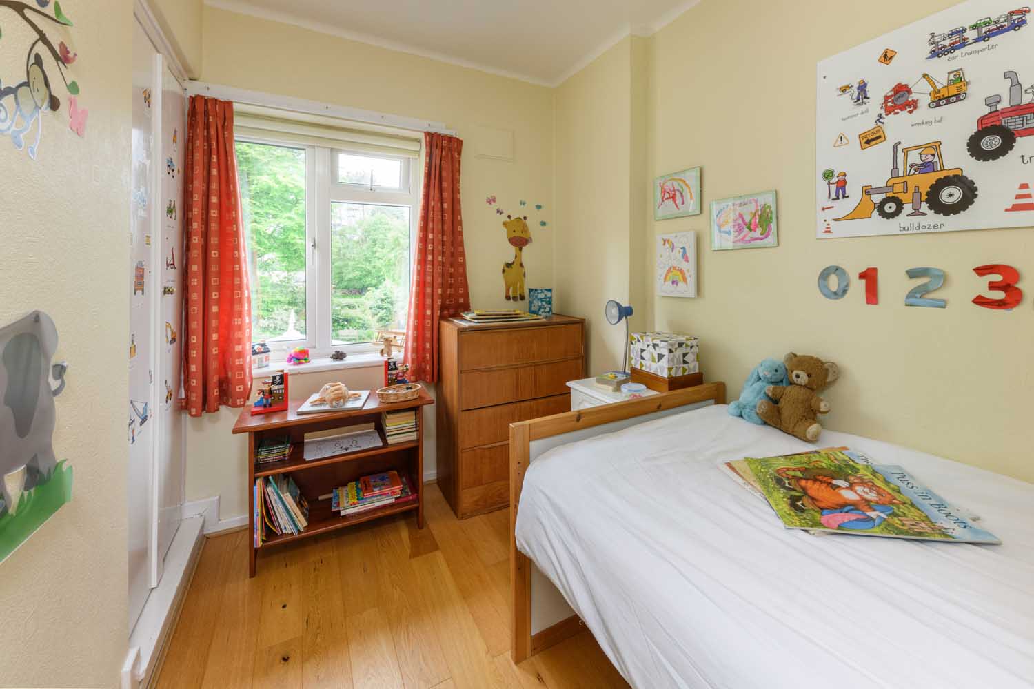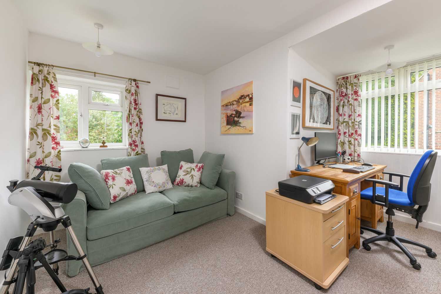 Four bedrooms and two bathrooms are neatly arranged across the first floor, with one of the bathrooms functioning as an en-suite for the principal bedroom. Three out of the four bedrooms are doubles and boast well-proportioned spaces with ample room. The fourth bedroom is currently used as a well-appointed study.