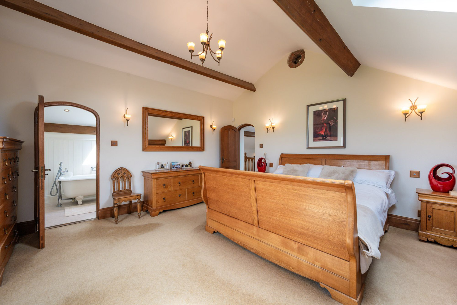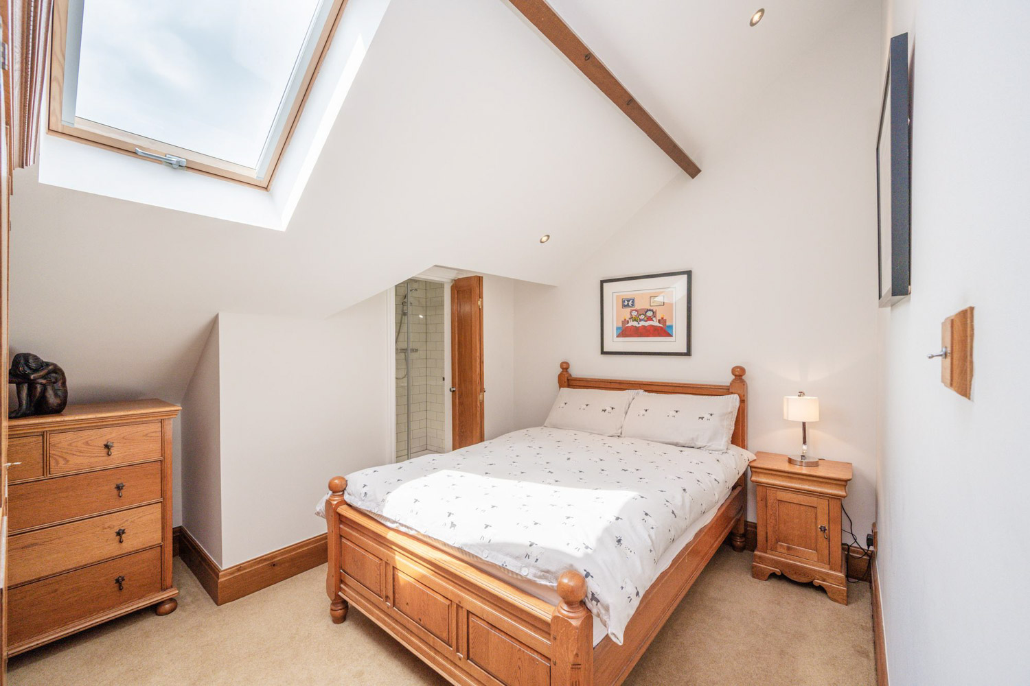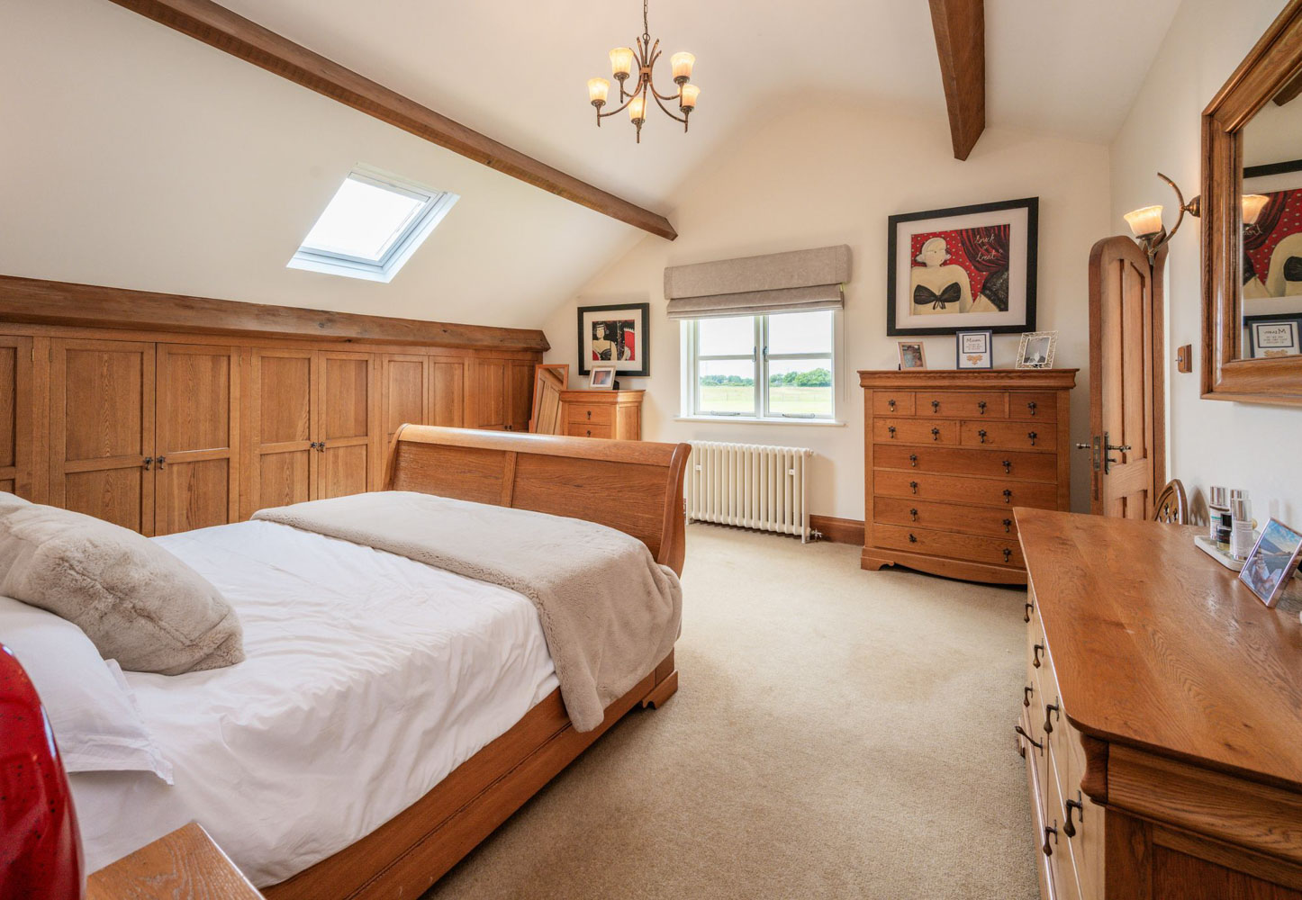 The principal bedroom is a tranquil retreat, featuring bespoke oak cabinetry and serene countryside views. The en-suite bathroom is a true sanctuary, complete with a classic claw foot bath that invites long, luxurious soaks beneath the gentle light from the overhead skylight. Traditional fittings, including a pedestal basin and high-level cistern toilet, are complemented by a generous walk-in shower with natural stone tiling. Chrome fixtures and thoughtful touches, such as a heated towel rail and soft neutral palette, create a sense of understated elegance and relaxation.