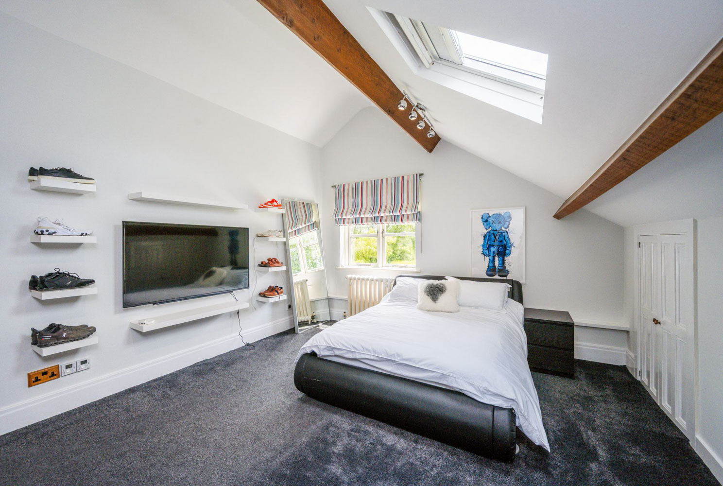 The study is designed to provide a peaceful and productive environment, with natural light streaming in through a large window. Exposed beams and warm woodwork echo the barn’s heritage, while the well-proportioned room offers ample space for a home office or creative pursuits. The overall effect is one of tranquillity and inspiration, ideal for focused work or quiet reflection.
