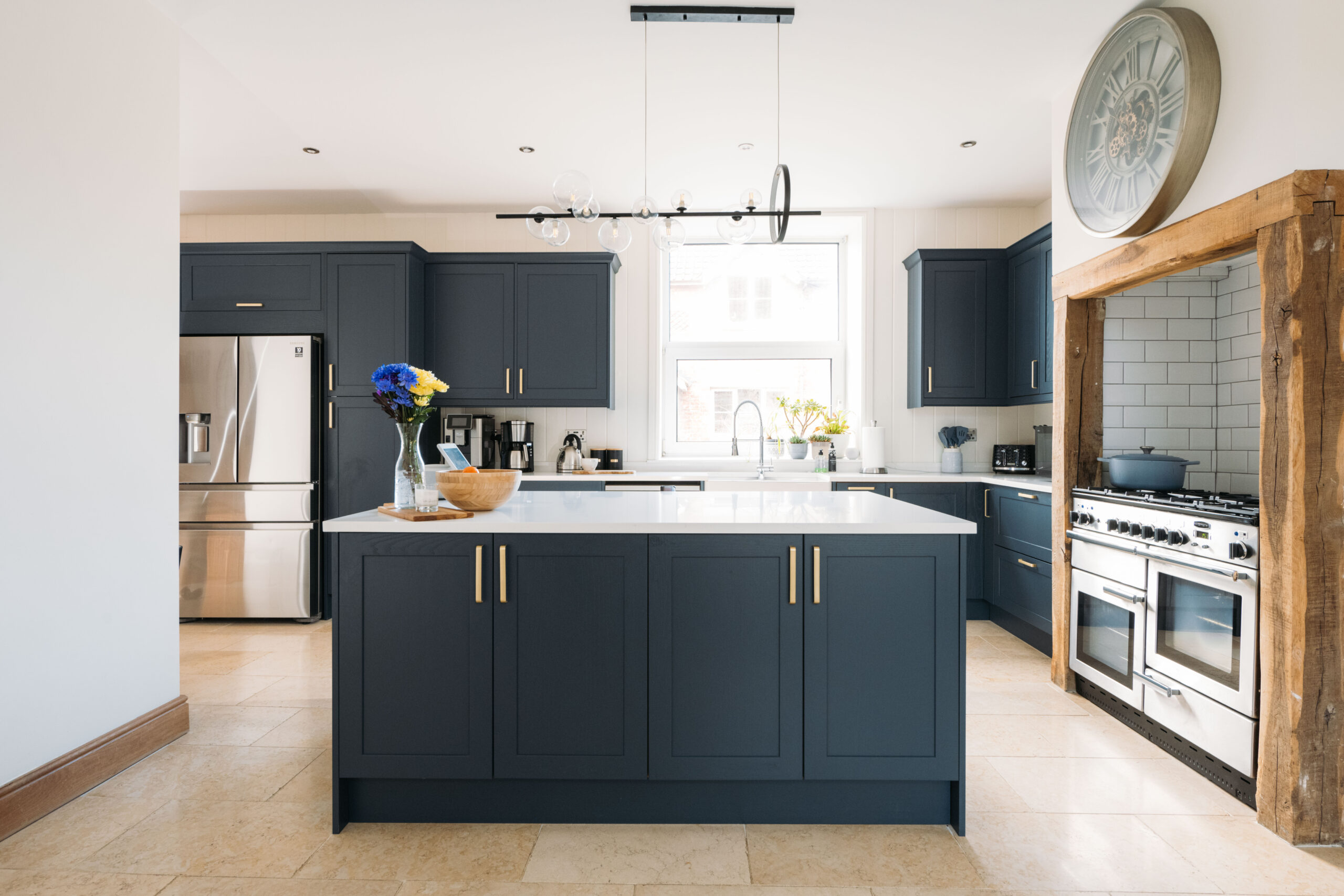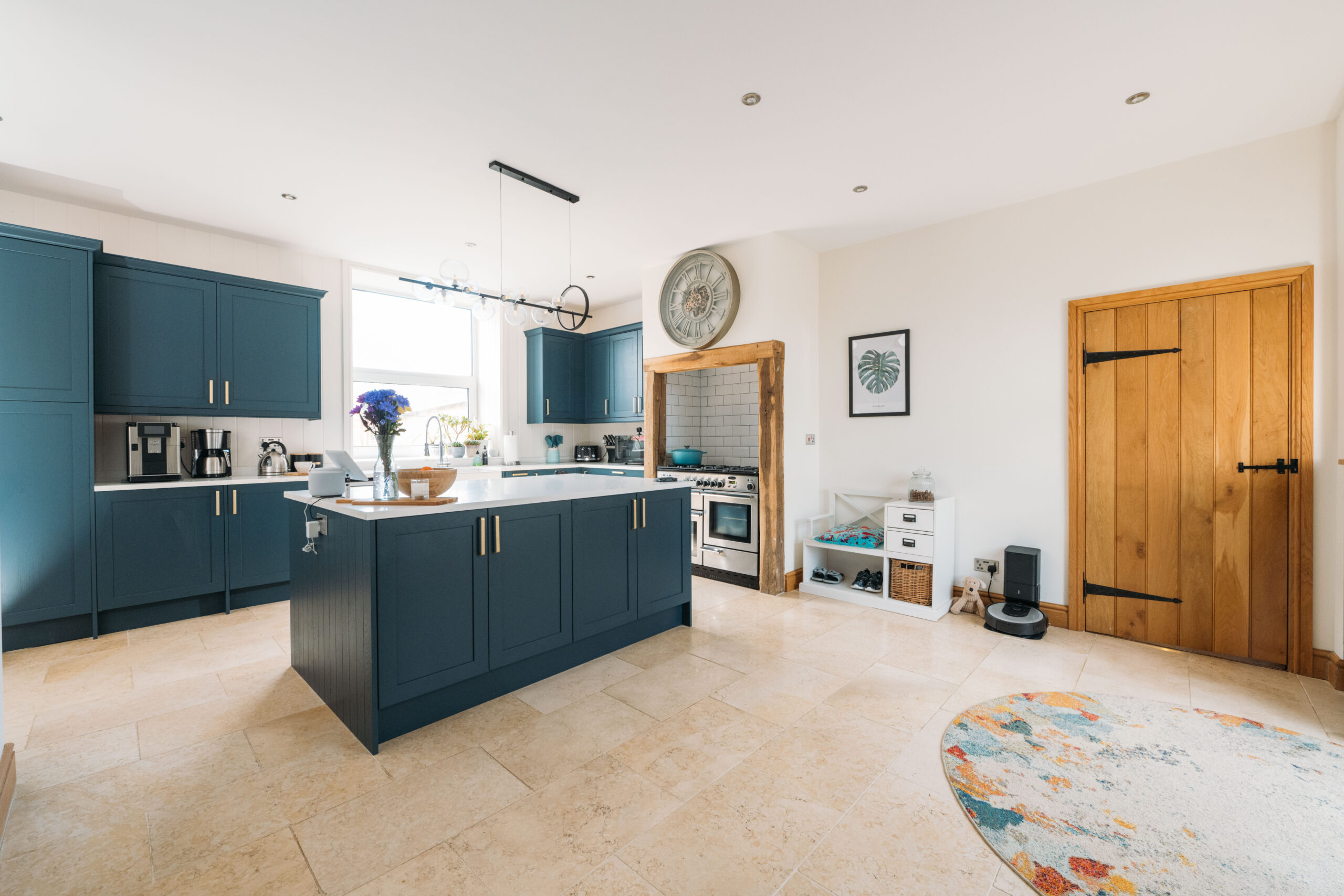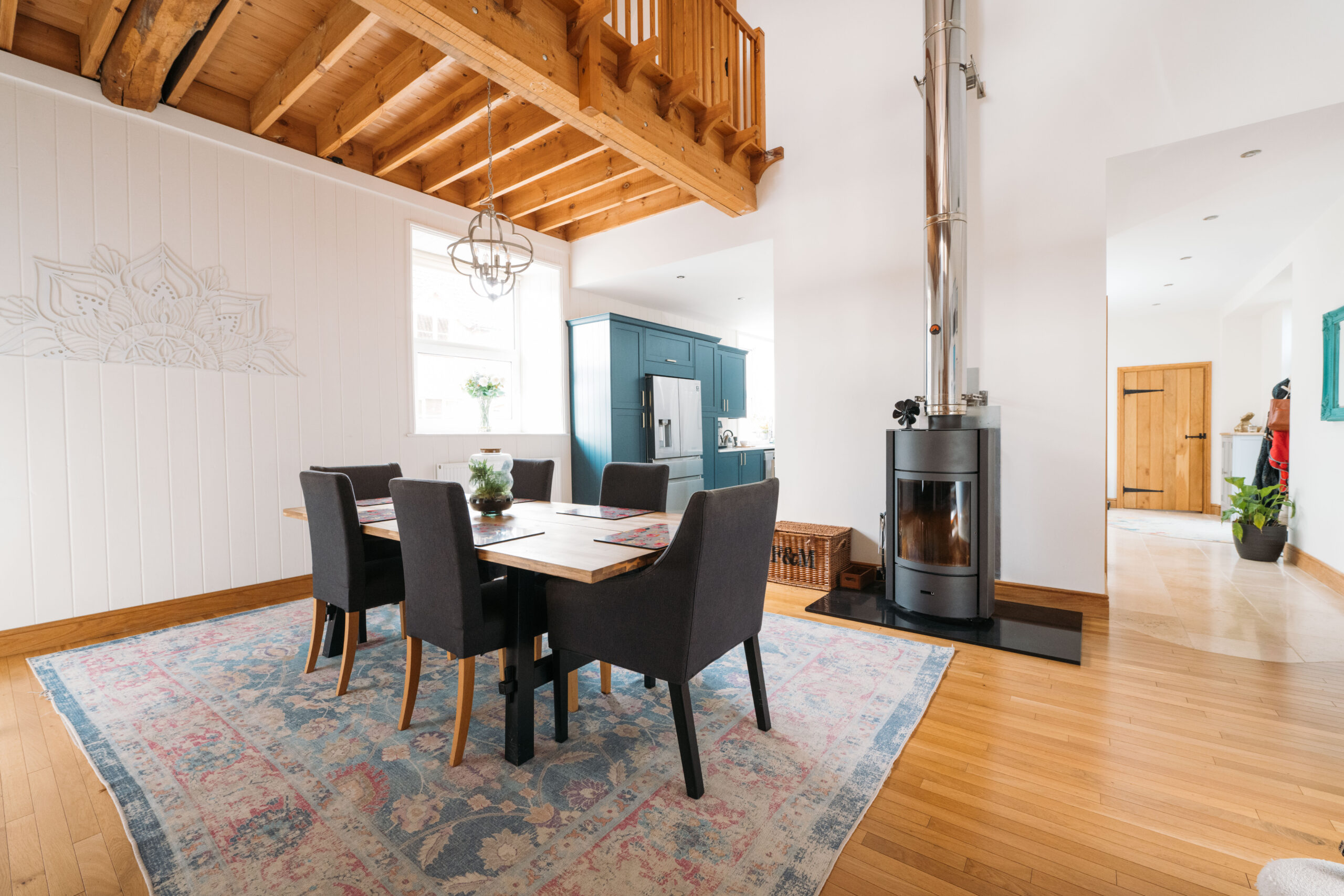 Upon entering Bullocks Barn, you are greeted with a large bespoke kitchen which was refitted in 2022 by A-class Kitchens. It is at the centre of the home and features quartz worksurfaces, a double Belfast sink with waste disposal, a gas Range cooker and limestone flooring with underfloor heating. There is space and plumbing for an American-style fridge freezer as well as integrated appliances including a fridge, a freezer and a dishwasher. The kitchen has open-plan access to the dining area which benefits from exposed beams and vaulted ceilings, making it an excellent entertaining space.
