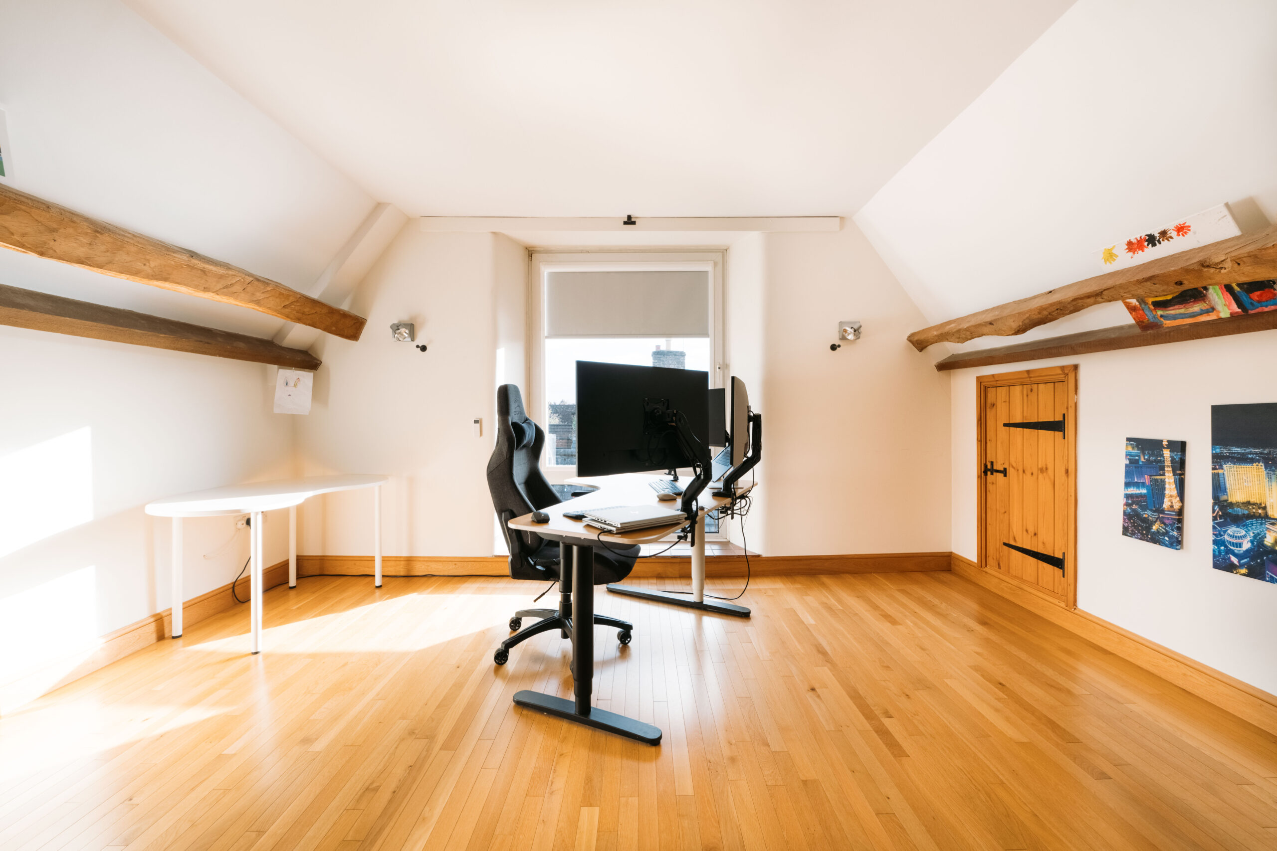 On the south side of the property, there are steps that lead up to an impressive formal sitting room. This room features exposed Oak beams and beautiful stonework, as well as a log burning stove and Velux windows that allow natural light to flood the room. There is also a set of stairs that lead up to a mezzanine space, which has been used in recent times as a playroom.