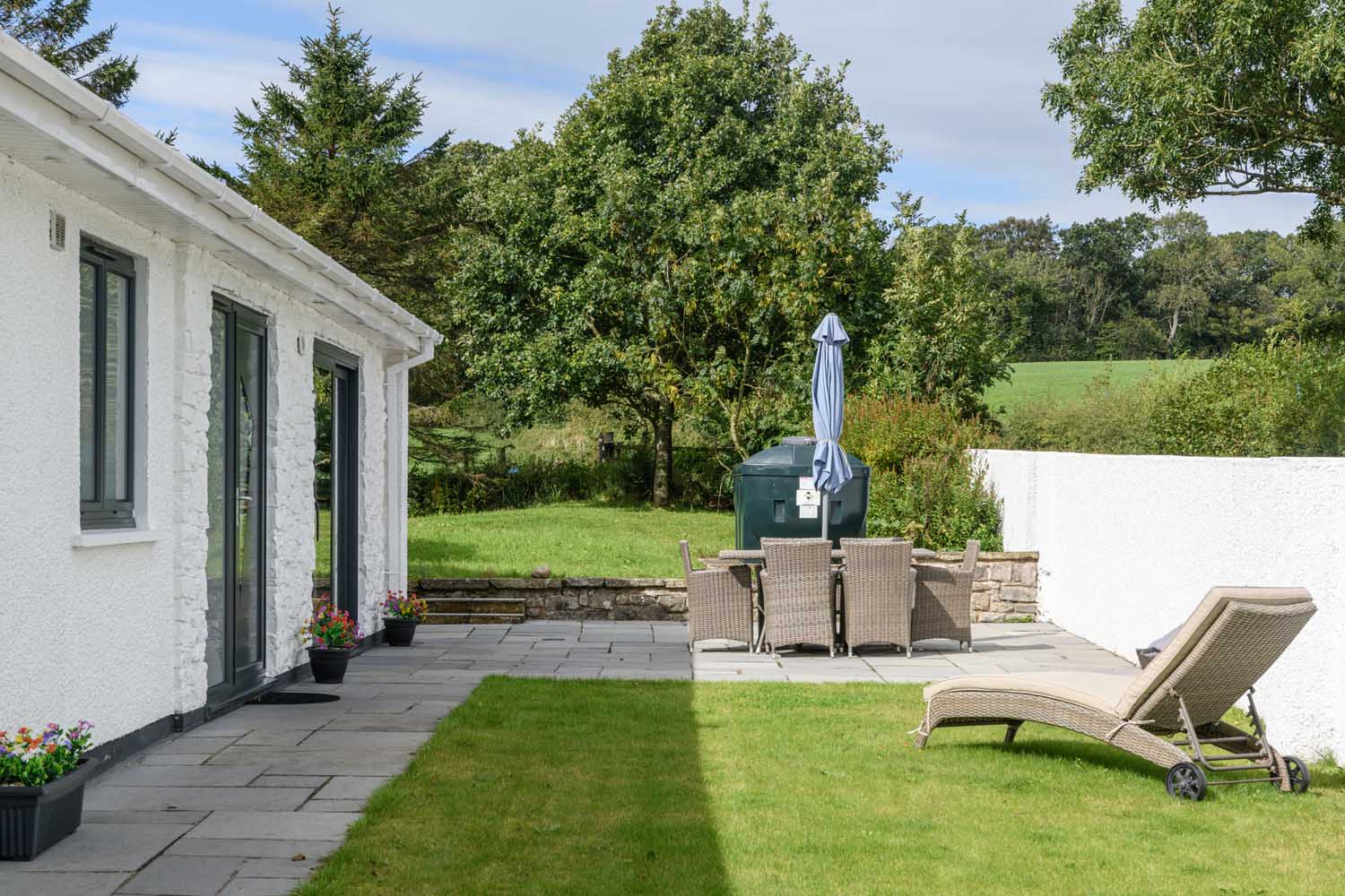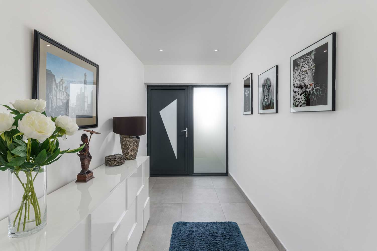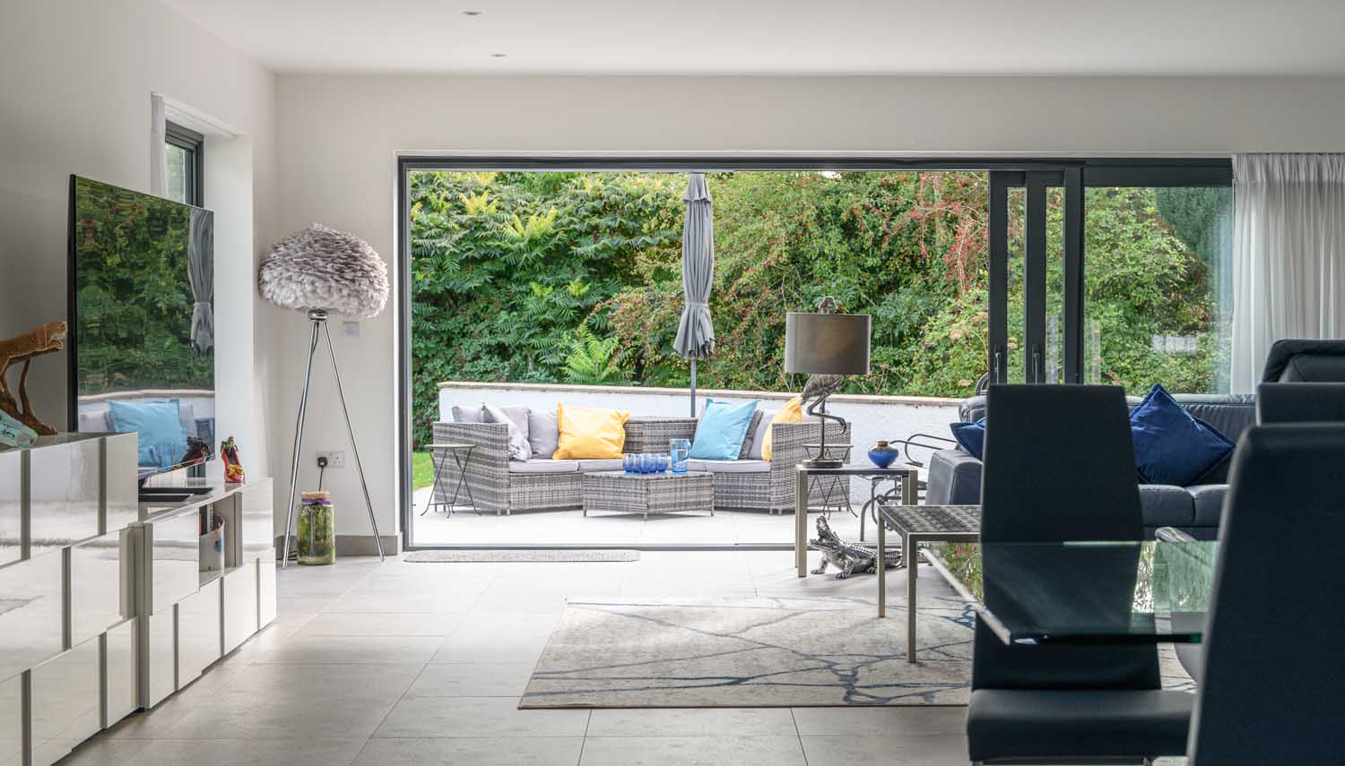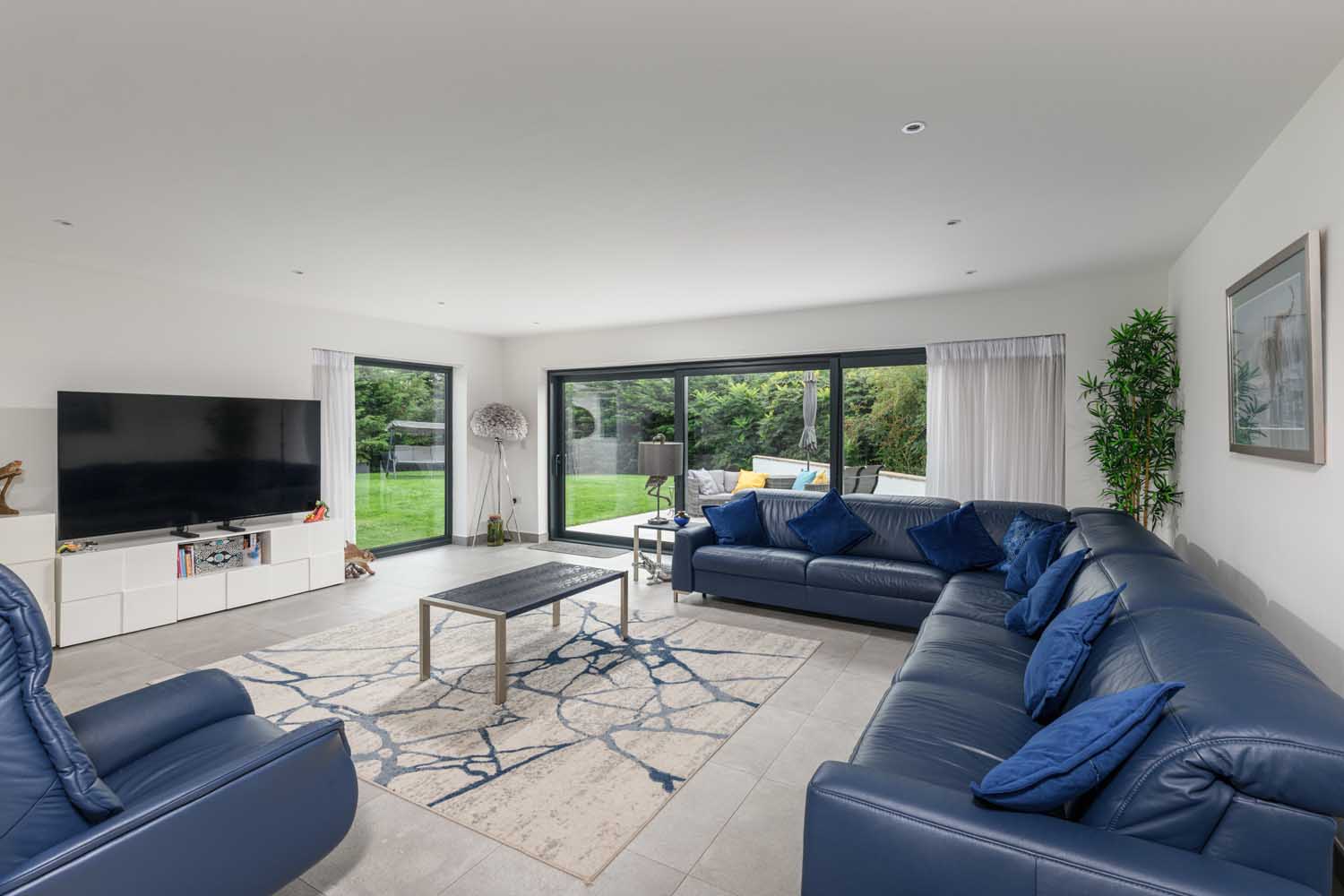 You arrive in a generous entrance hall with large format tiling and room for console storage. From here, an internal door leads into the expansive open-plan kitchen, dining and sitting room. The sitting area is arranged for relaxed evenings with glazing that opens wide in warmer months.