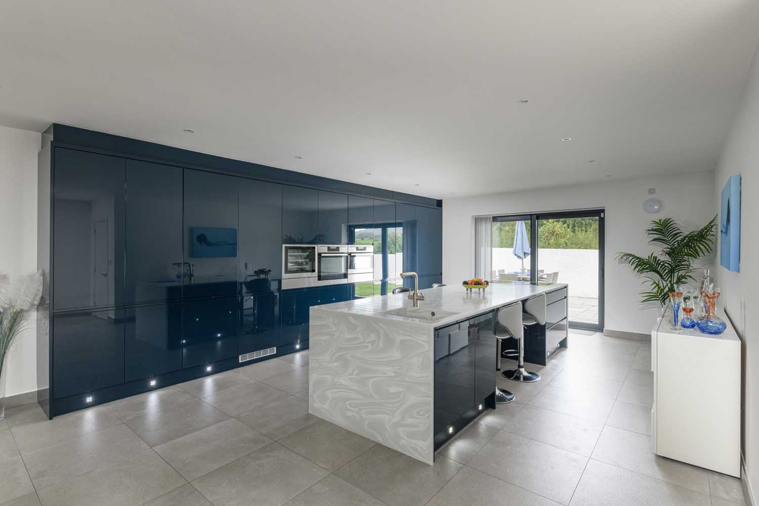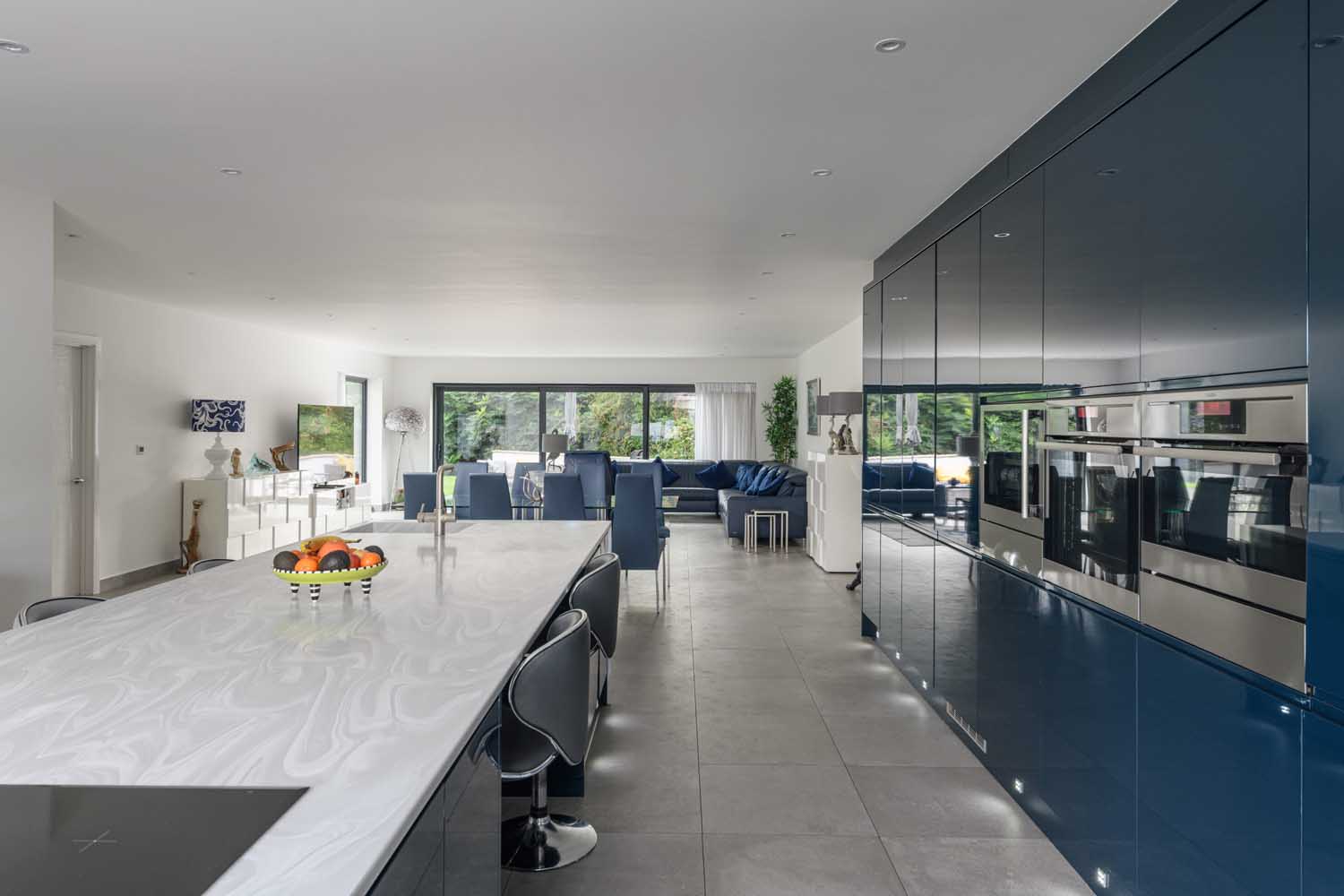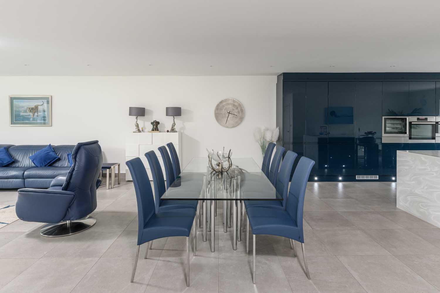 The kitchen balances practical function with a sociable feel. A long waterfall island provides preparation space and casual seating, with an integrated sink, induction hob, integral dishwasher and a Quooker boiling water tap. A full wall of high gloss cabinetry conceals extensive storage and a bank of integrated appliances to keep the lines clean. A separate laundry room sits adjacent, housing the machines and household storage so the main space stays clear. Between the two, a generous dining space holds a large table and naturally marks the transition from cooking to relaxing, keeping conversation flowing while preserving the sense of scale.