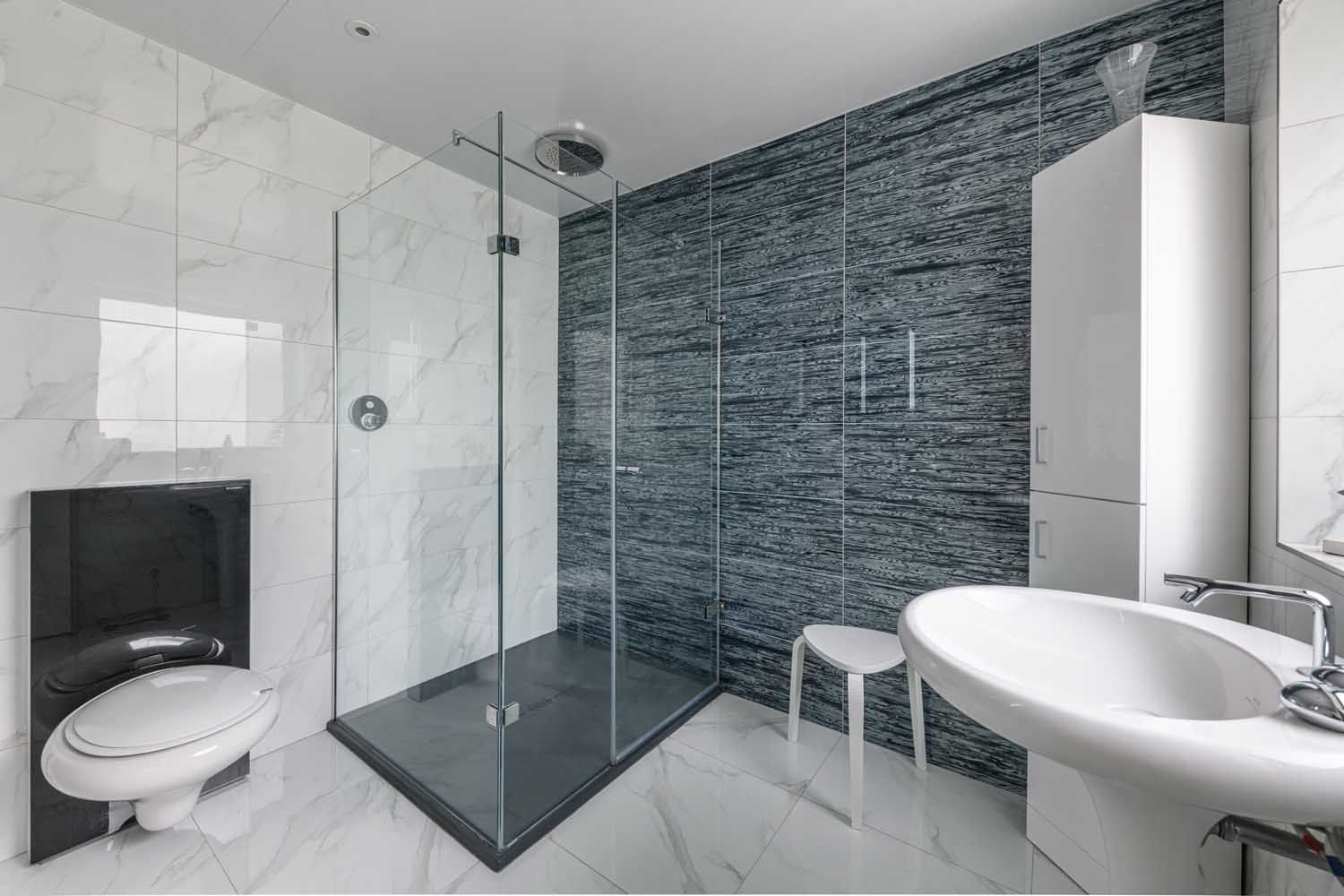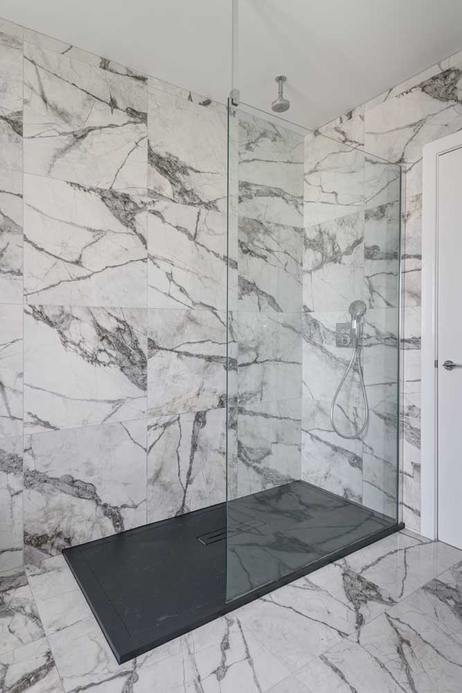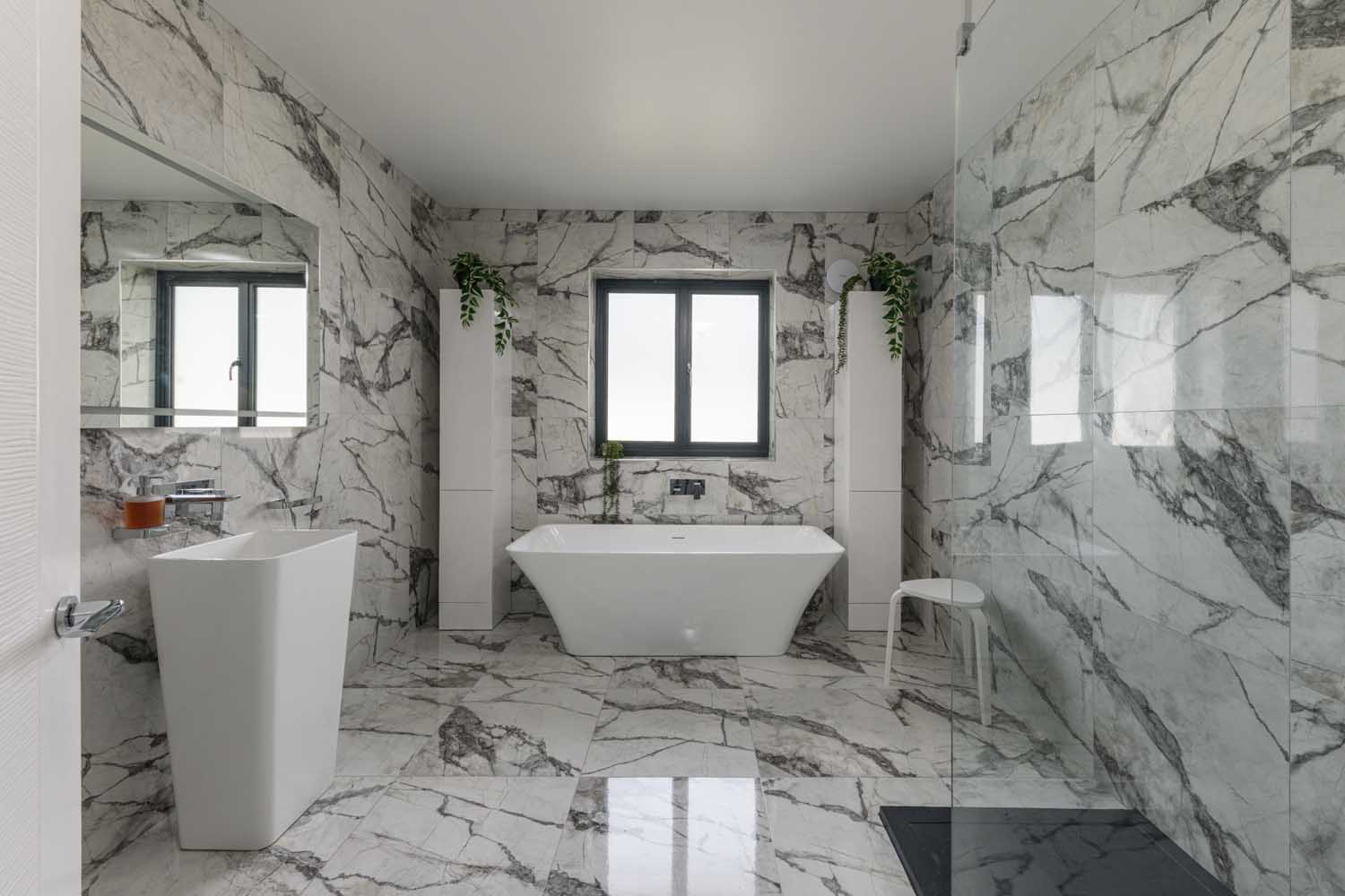 The family bathroom is generously scaled, finished in large format marble effect tiling, and includes a freestanding bath and a separate walk-in shower with a rainfall head and a handheld shower lance.