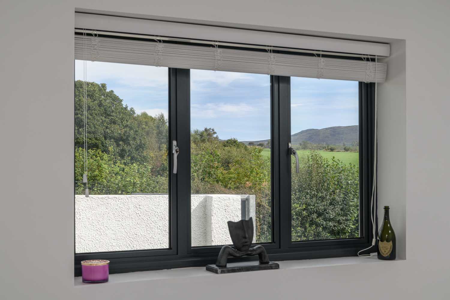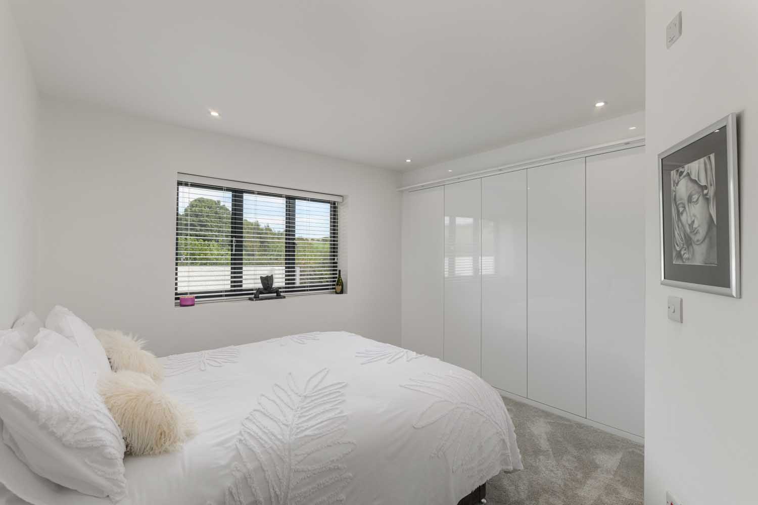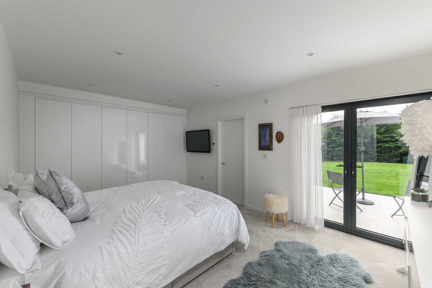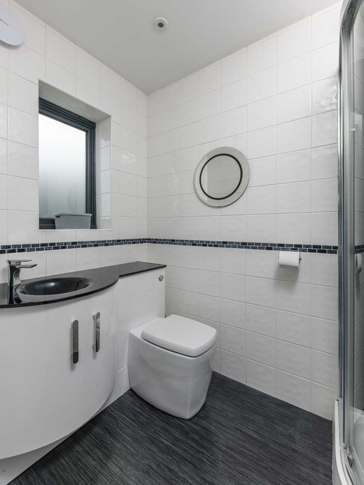 The principal bedroom is generous and tranquil, with a full run of fitted wardrobes and glazed doors to the terrace and lawn. Its en suite is finished in large format tiling and includes a broad walk in rainfall shower with quality fittings and useful storage. The second bedroom has sleek fitted wardrobes and an outlook that stretches across open countryside to the fells, together with a crisp en suite of white tiling, dark stone effect vanity top, heated towel rail and a hydro massage shower with body jets and built in seat. Two further bedrooms complete the arrangement, each with fitted wardrobes and pleasant outlooks, one currently set up as a study.